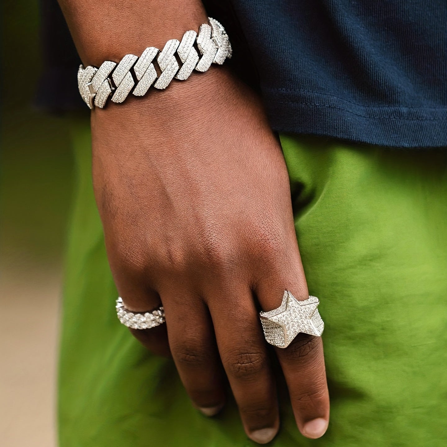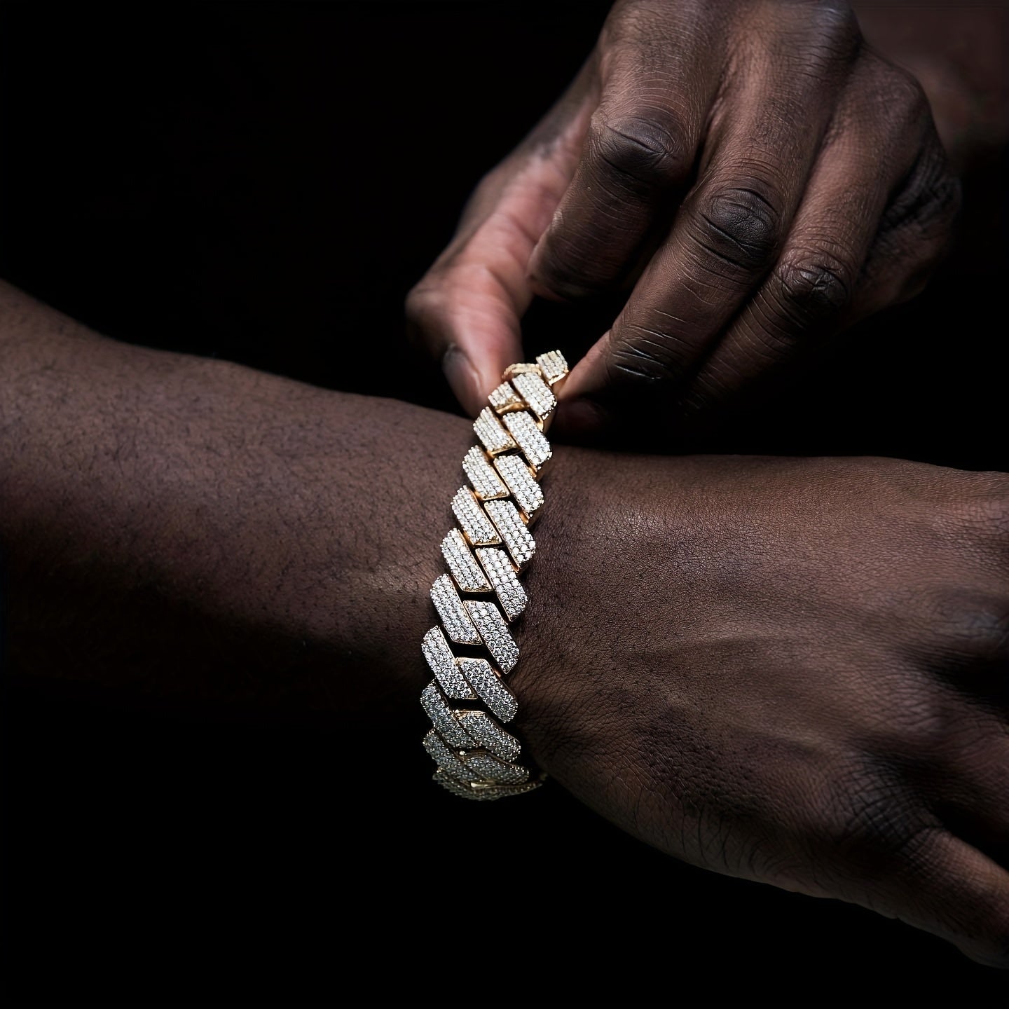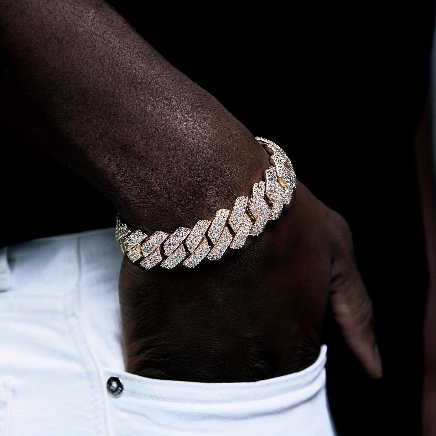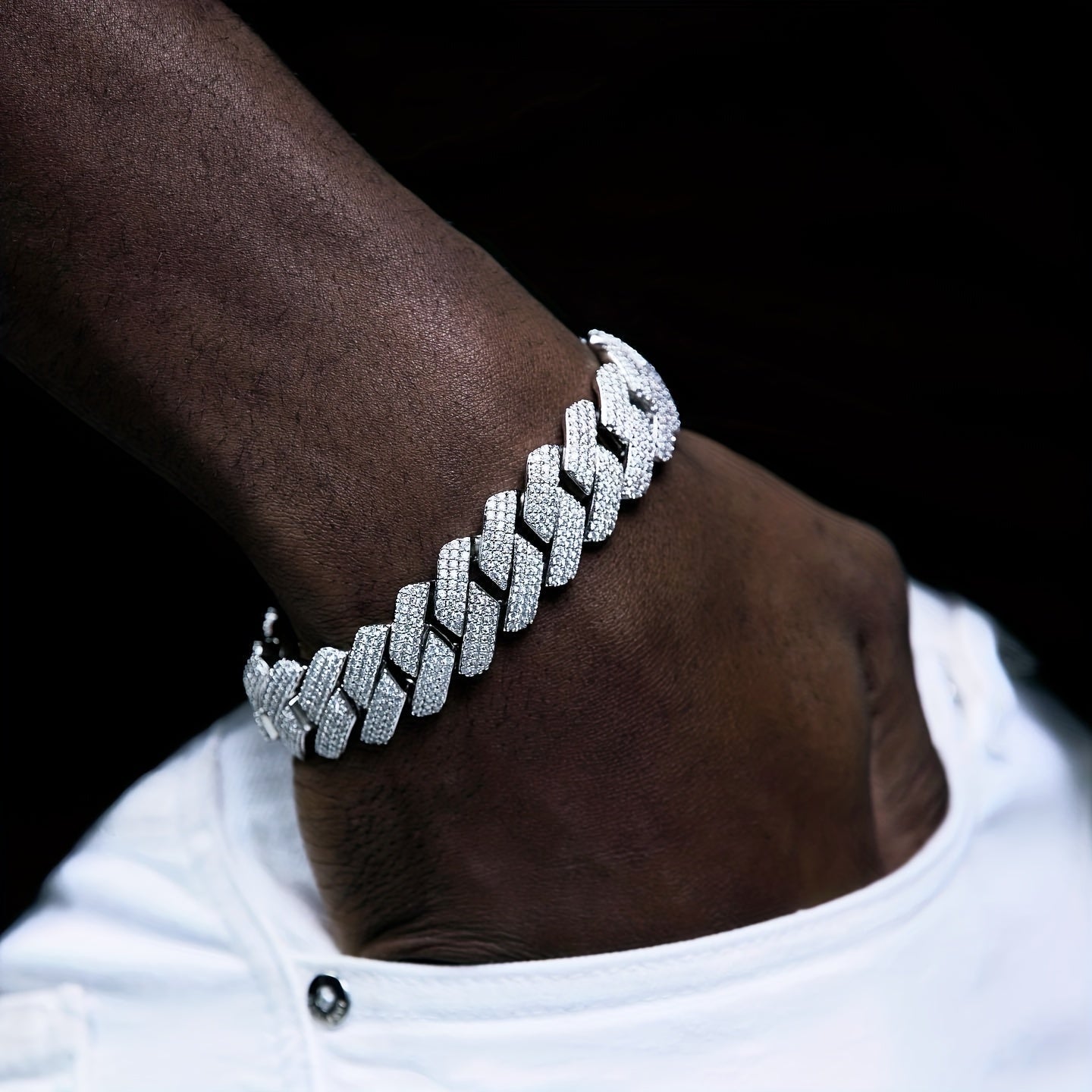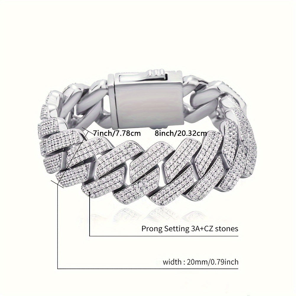 This 20mm men's bracelet features an iced prong Cuban chain design with micro pave CZ stones, perfect for adding a touch of bling to your outfit.