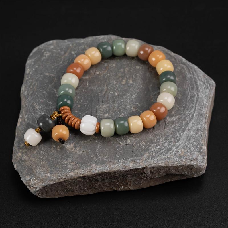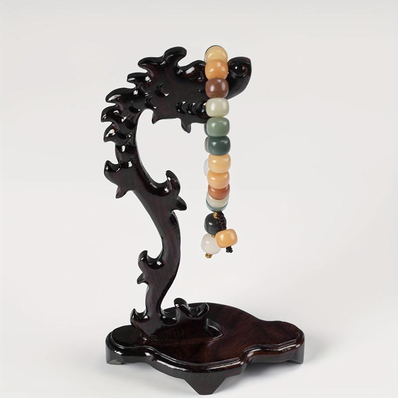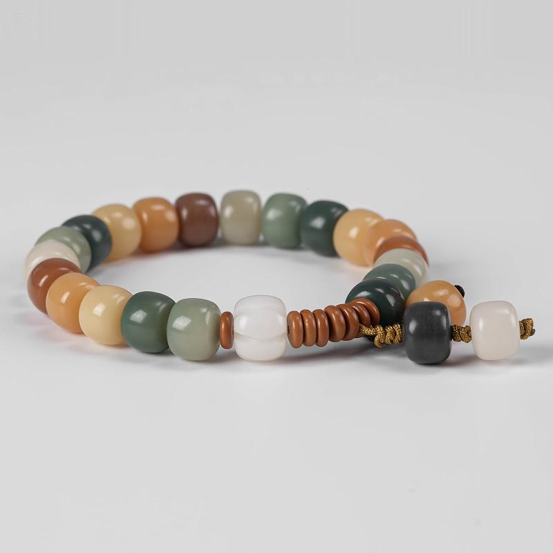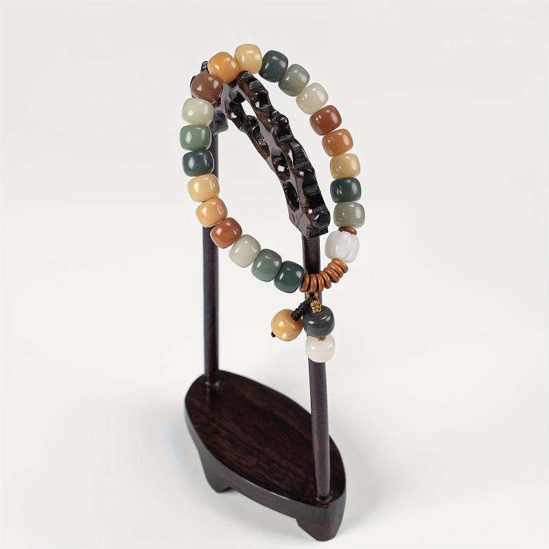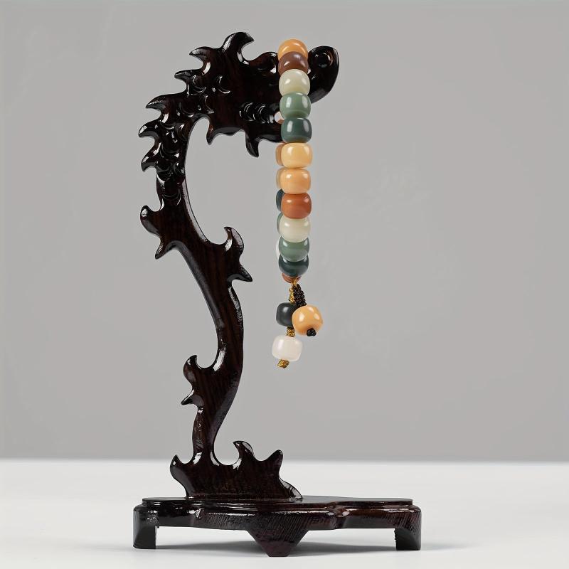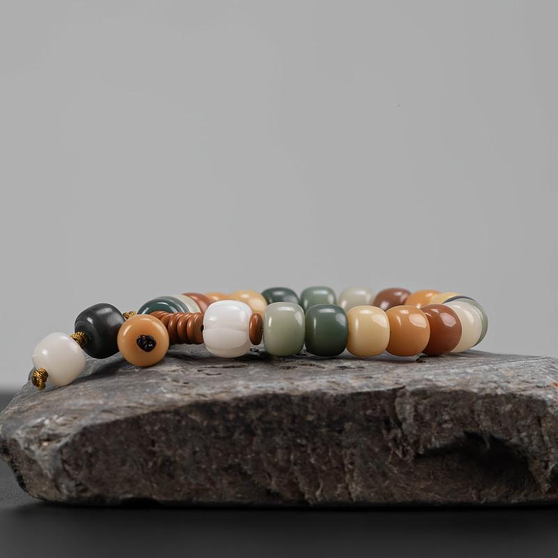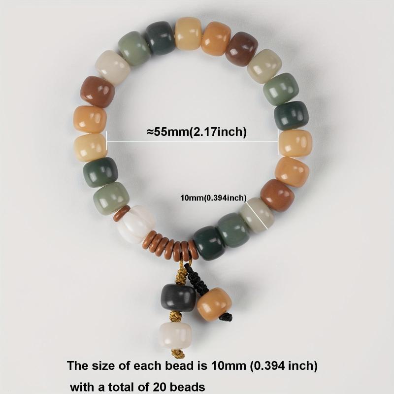 Eco-friendly bracelet made from recycled wood beads featuring peace and prosperity symbols. High-quality jewelry that adds a touch of elegance to your outfit.