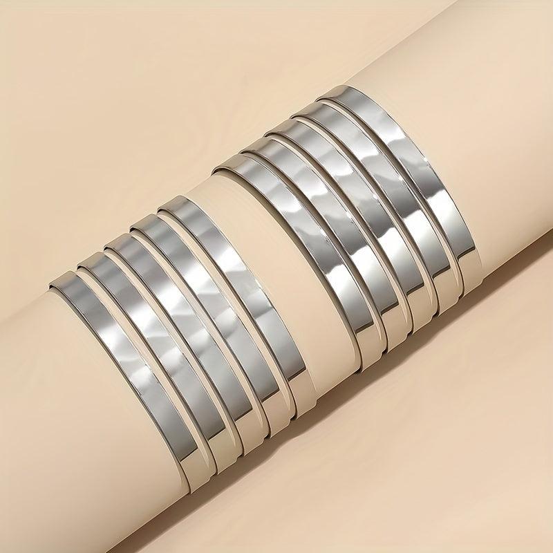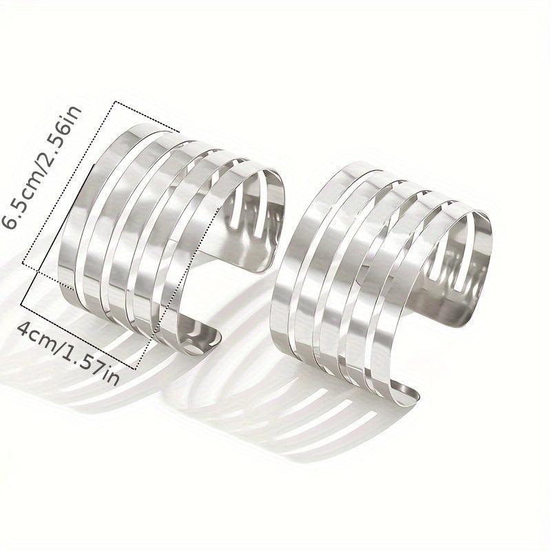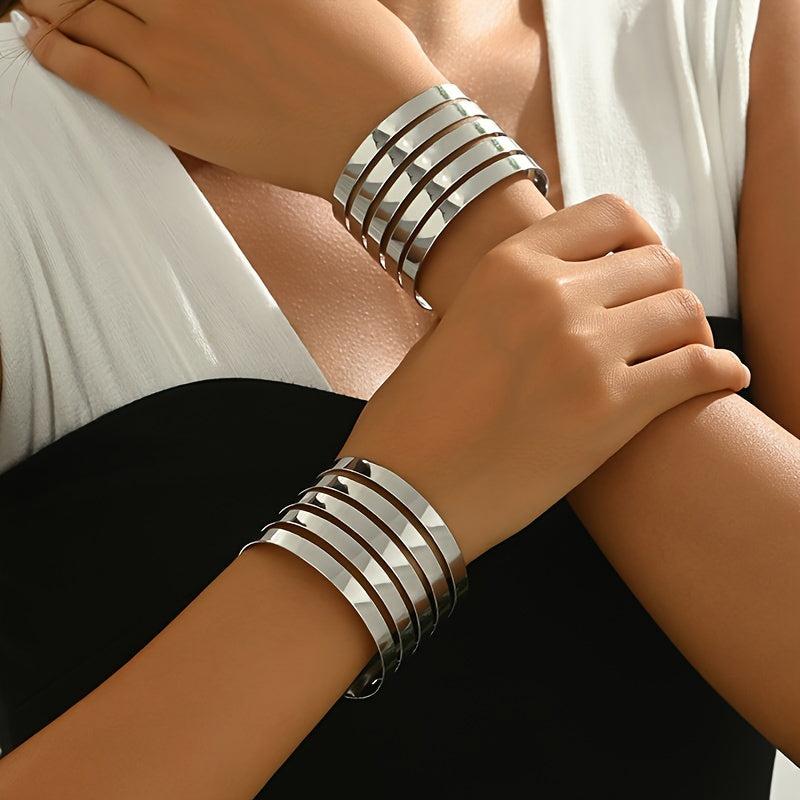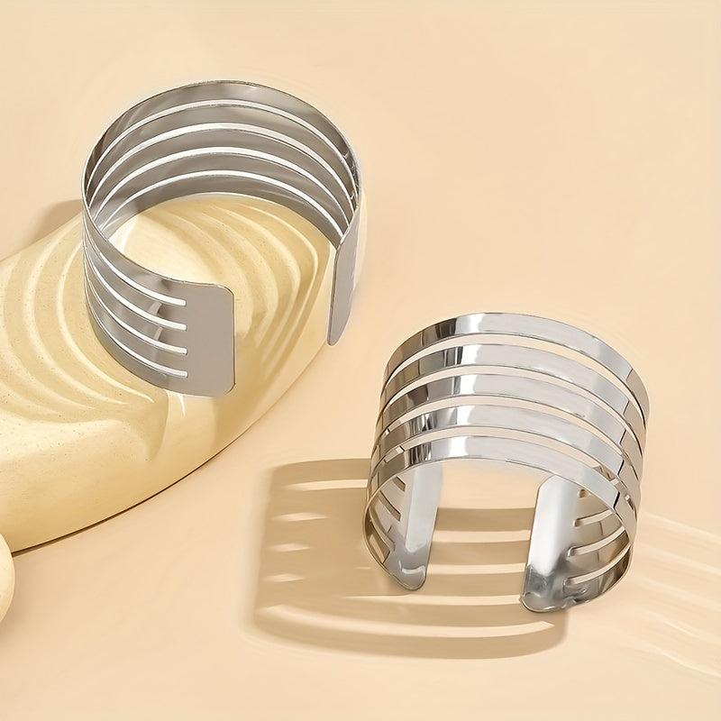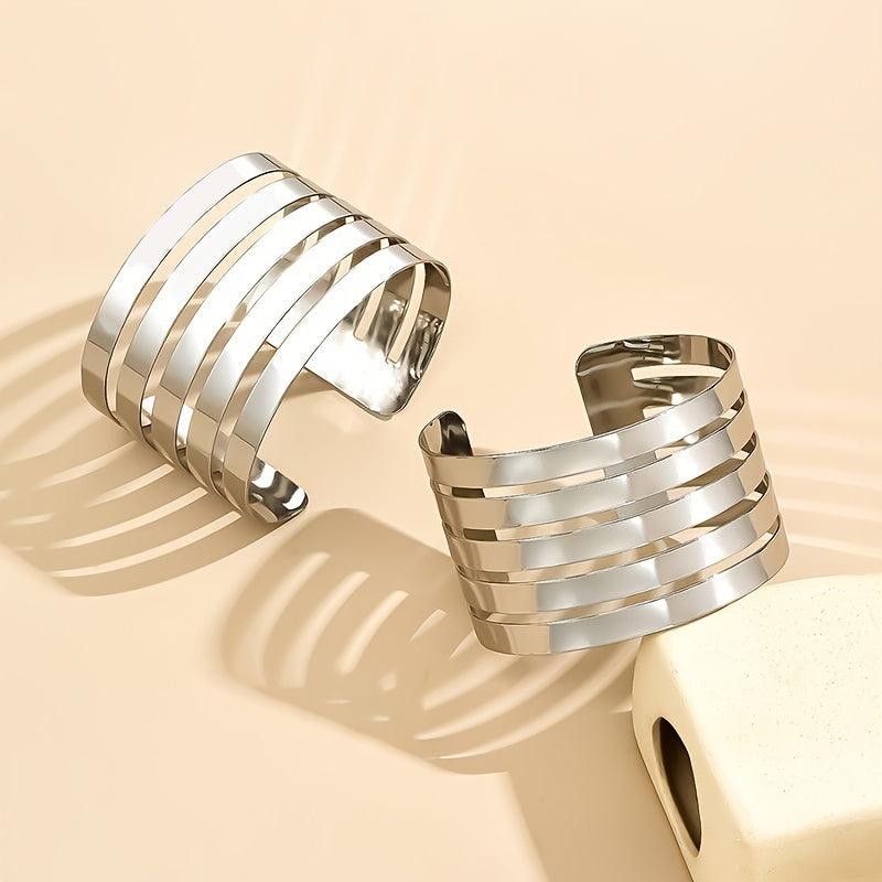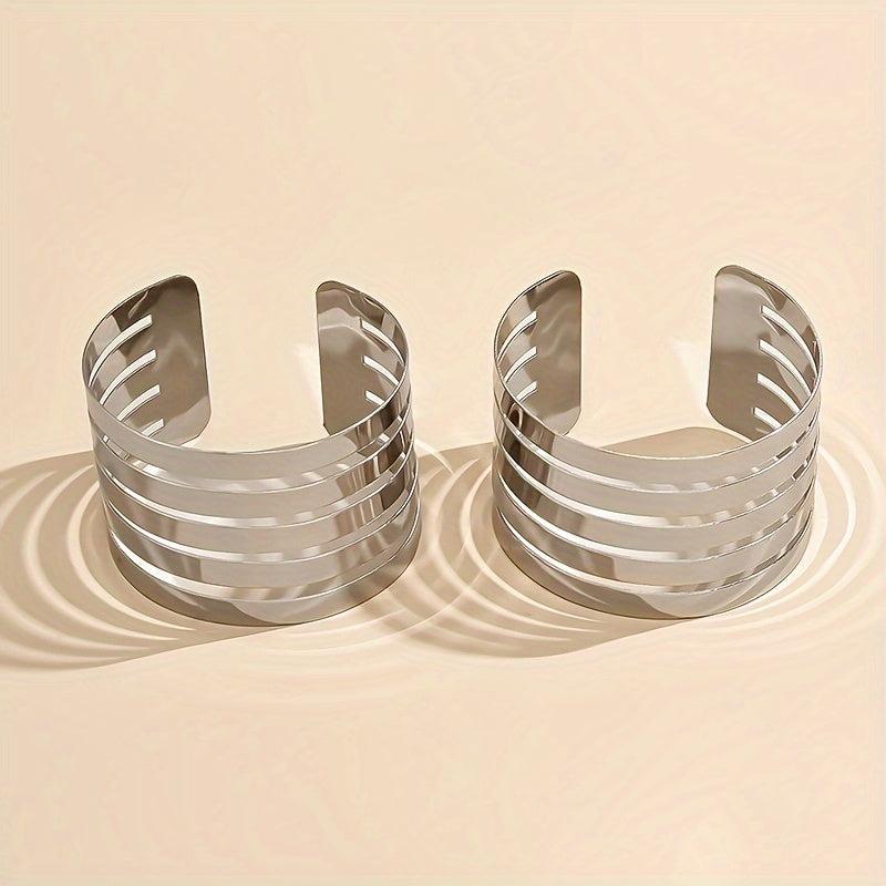 Make a bold statement with this set of open bracelets featuring exaggerated geometric designs. Perfect for adding a touch of edgy style to your outfit.