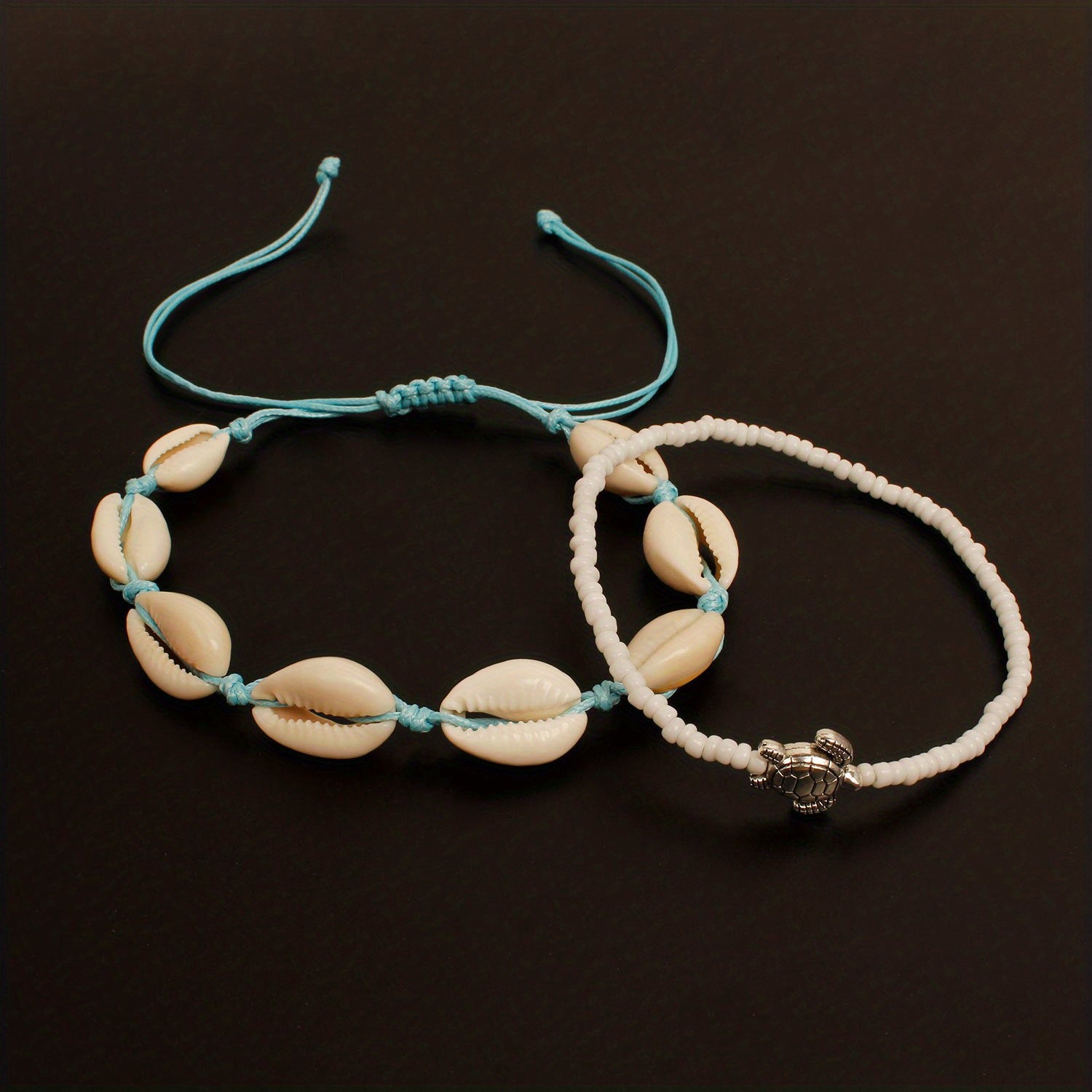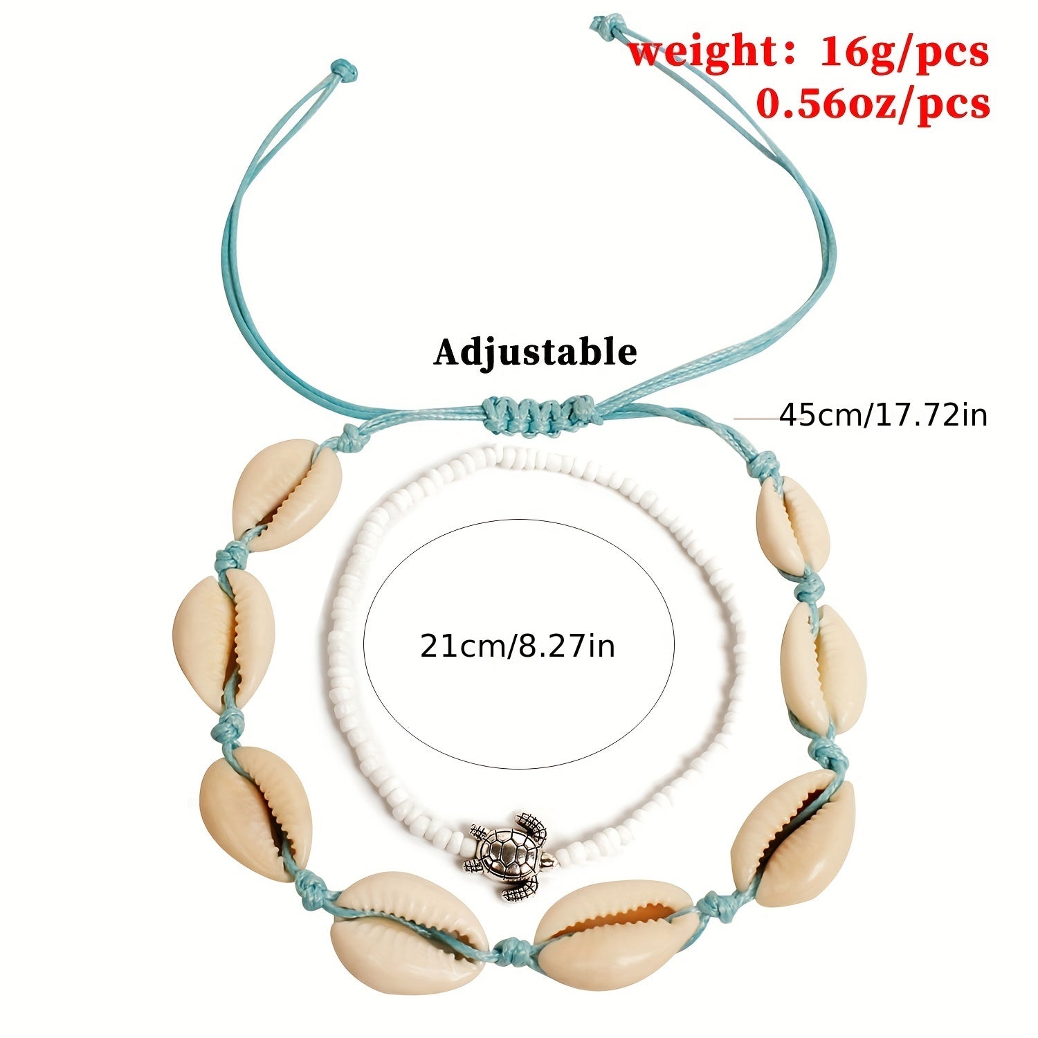 Enjoy the summer vibe with this beach and ocean-inspired anklet set. Featuring shell and turtle shape beads on waterproof wax thread, these stackable ankle bracelets are perfect for adding a touch of boho style to your outfit.