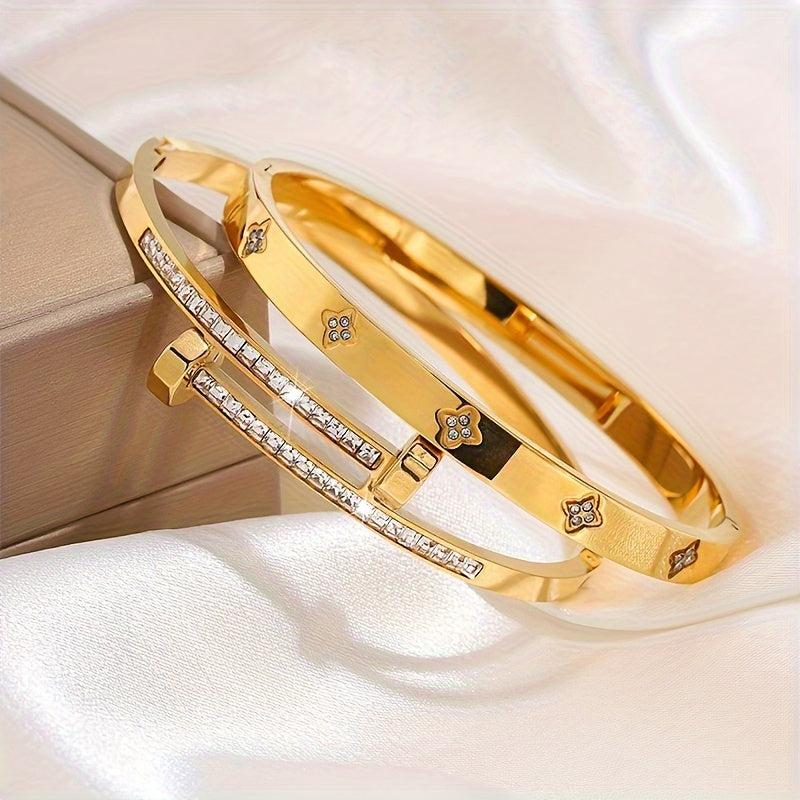 This funky style bracelet set features stainless steel construction, rhinestone embellishments, and a four-leaf clover inlay. Perfect gift for your girlfriend.