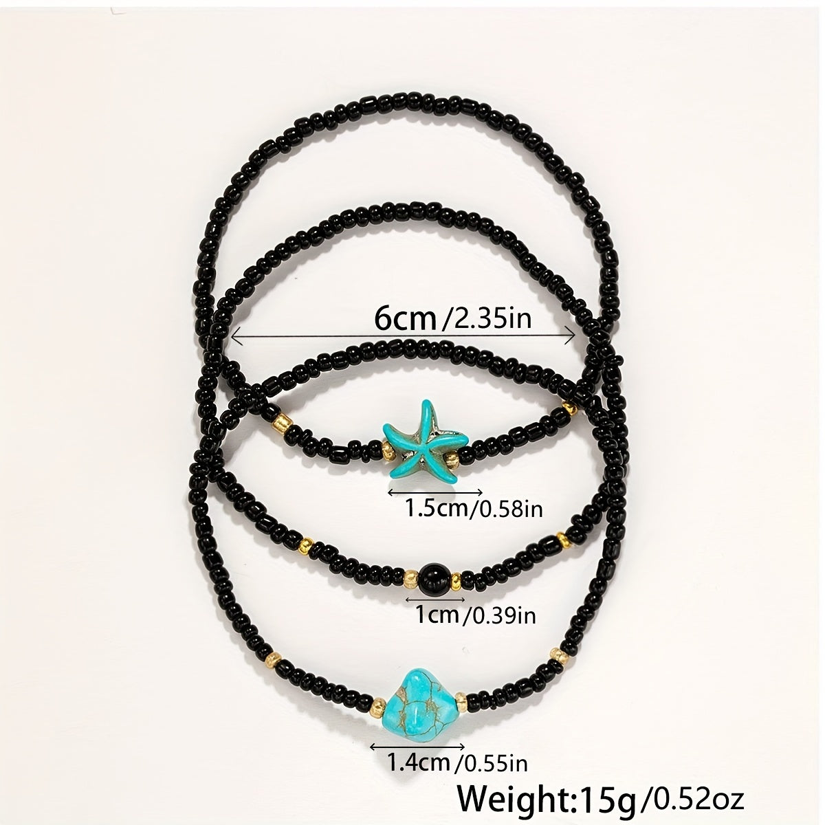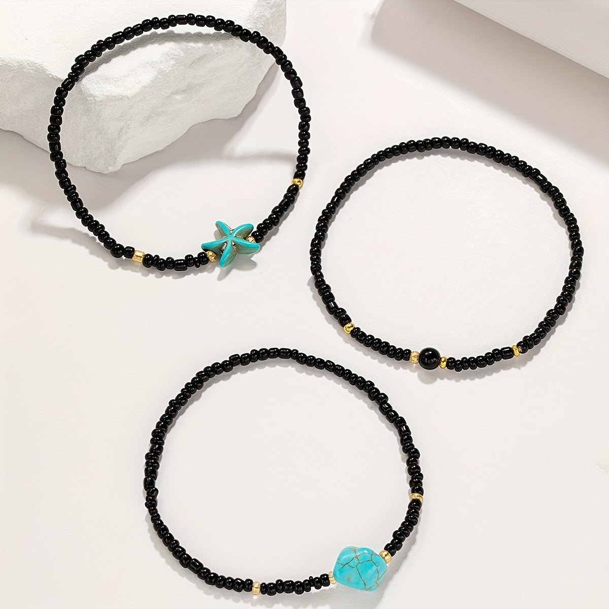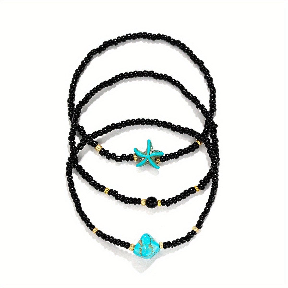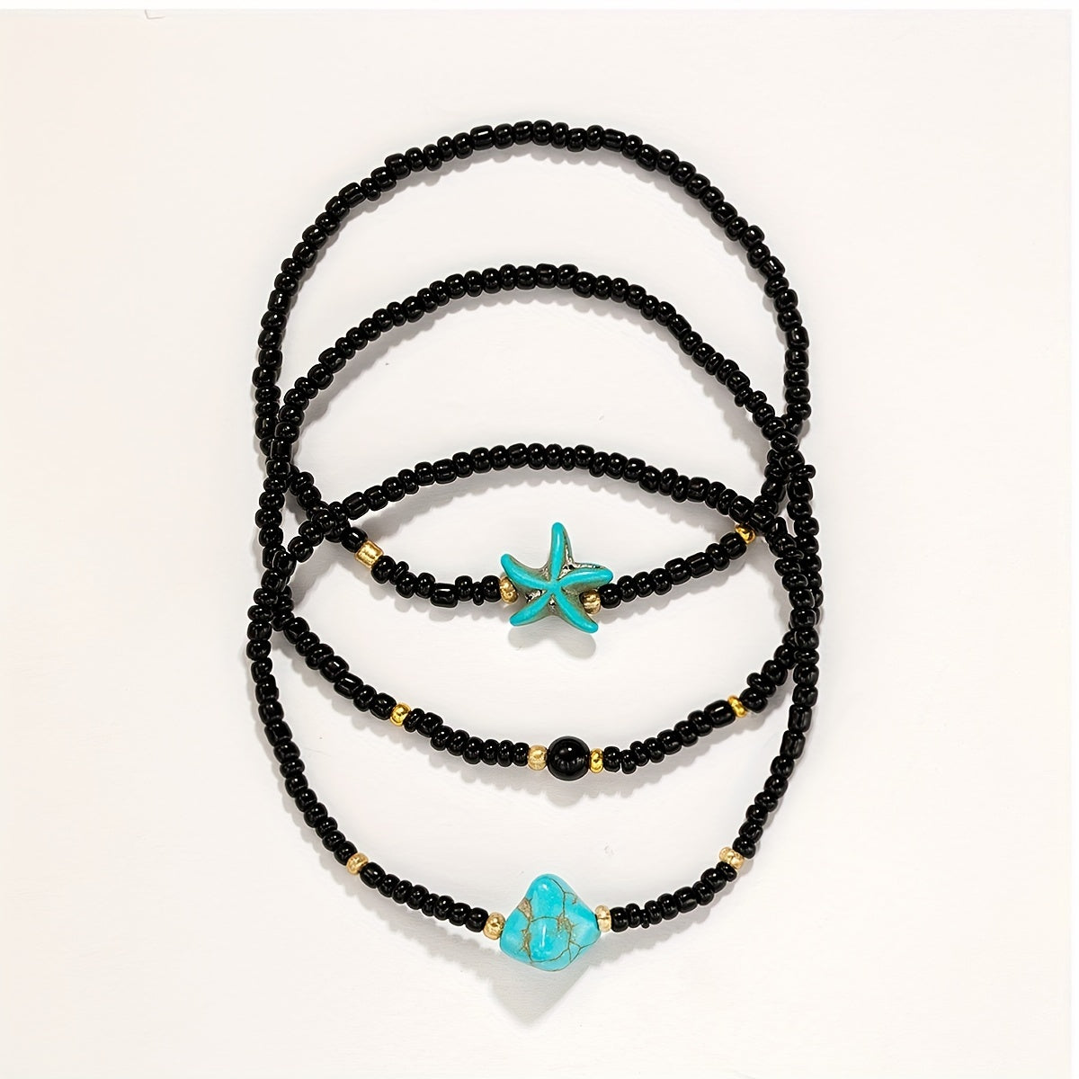 Elevate your beach look with this set of 3 vintage-style anklets featuring starfish charms and beaded design. Perfect for adding a touch of boho-chic to your summer outfits.