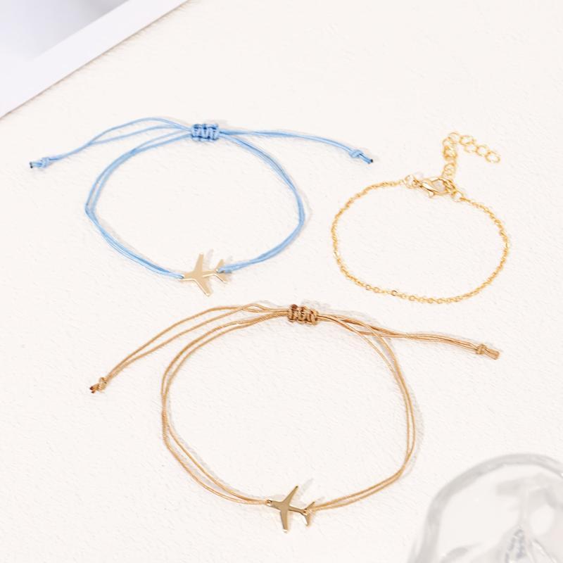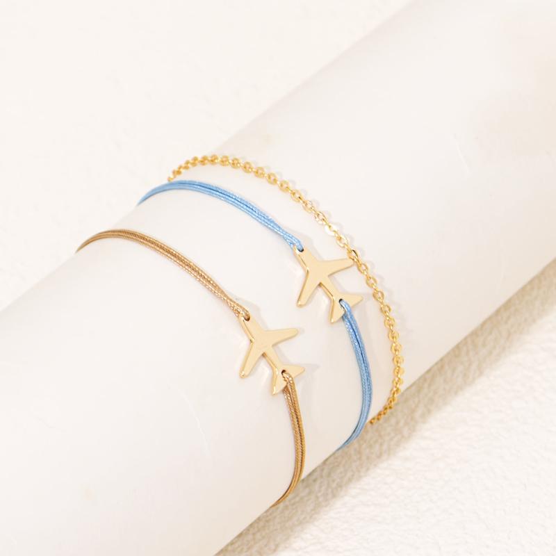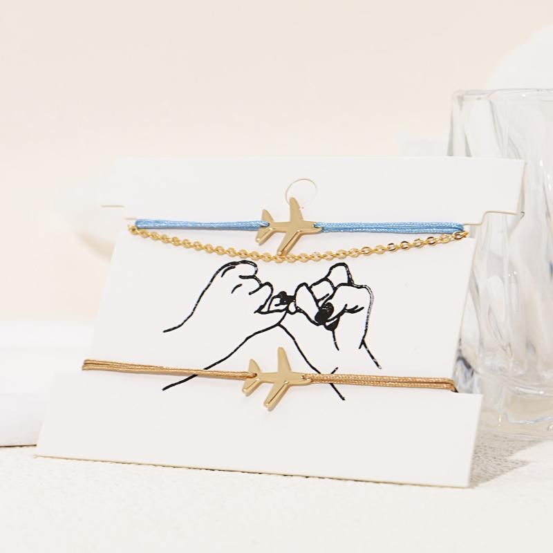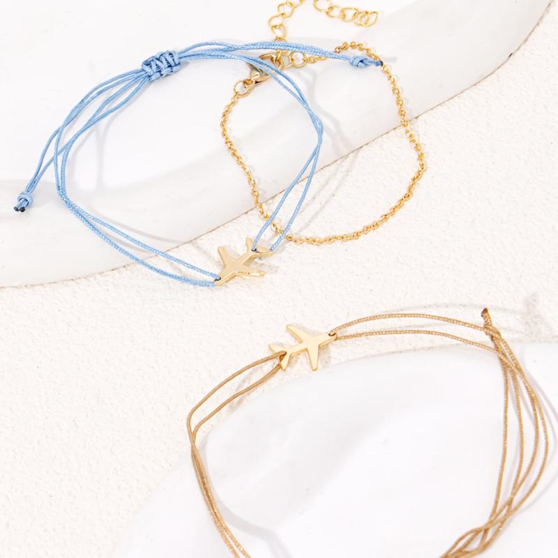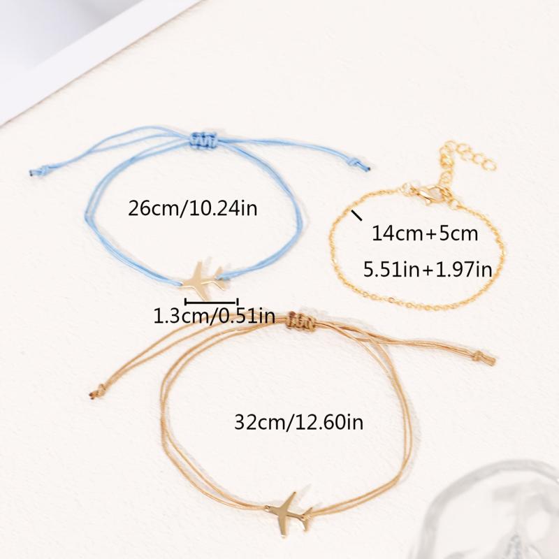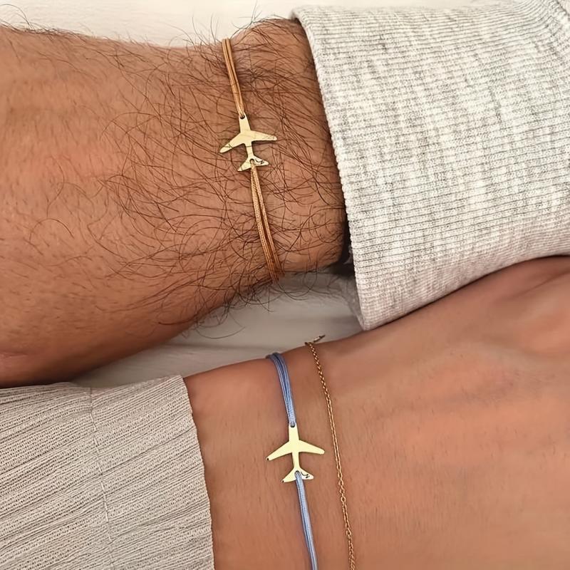 This set includes 3 adjustable copper airplane charm bracelets with a vintage boho style woven rope design. Perfect for couples to wear daily or for special occasions.