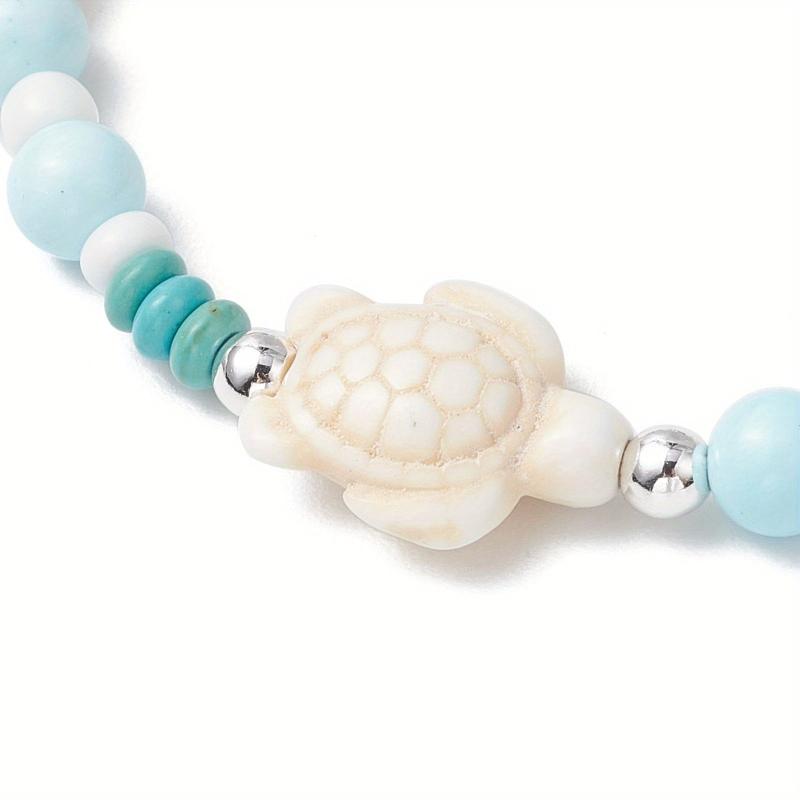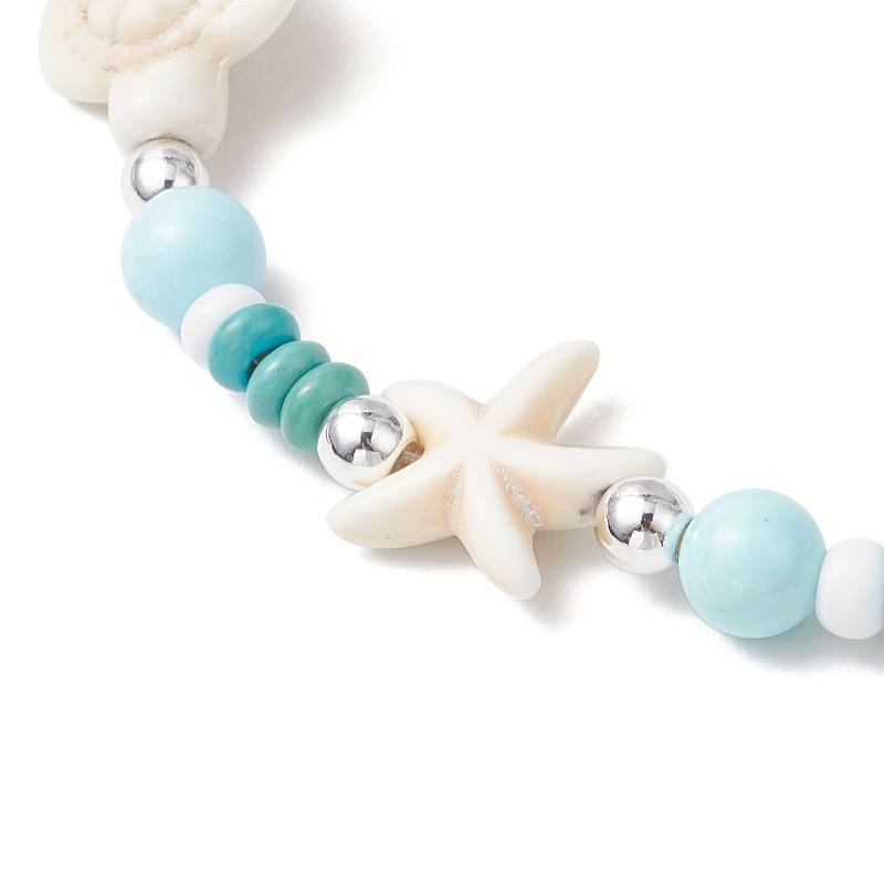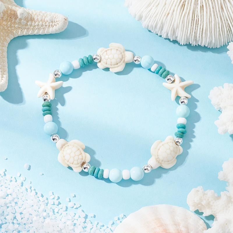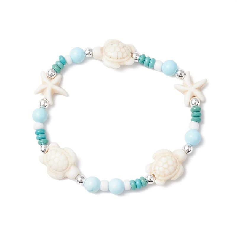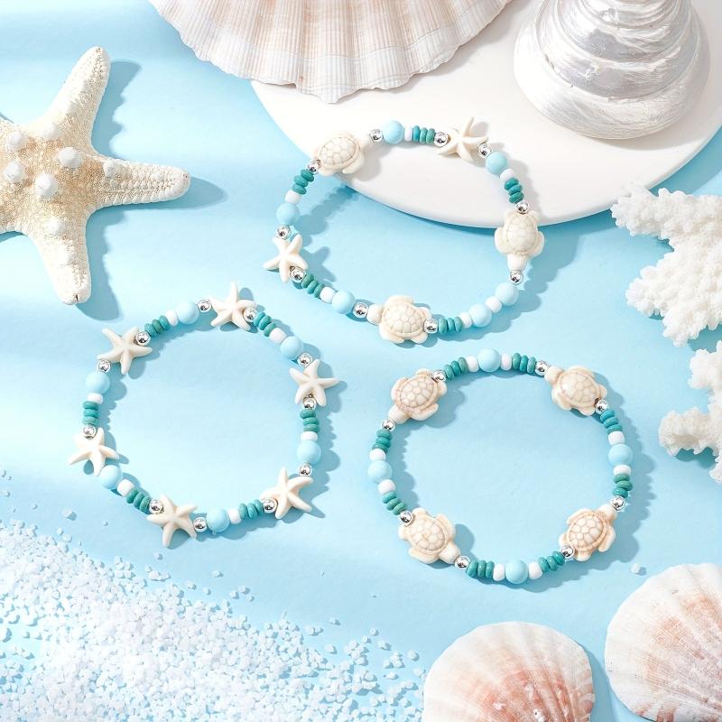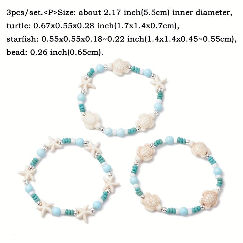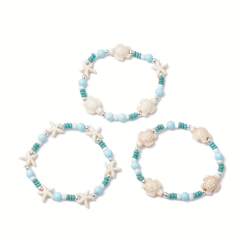 Add a touch of beachy charm to your look with these 3 stretch wristbands featuring synthetic turquoise beads in starfish and turtle designs. Perfect for daily wear or beach vacations.
