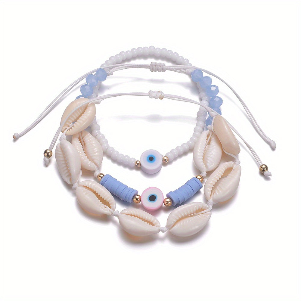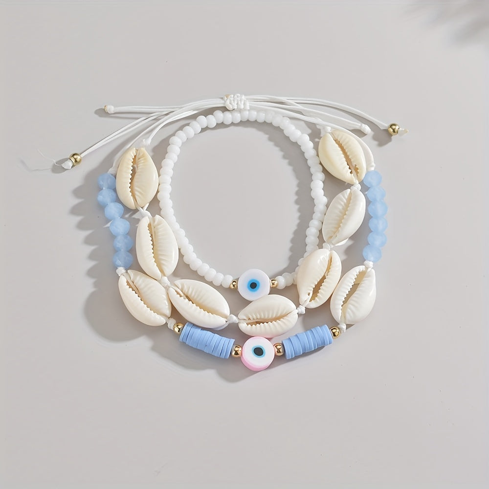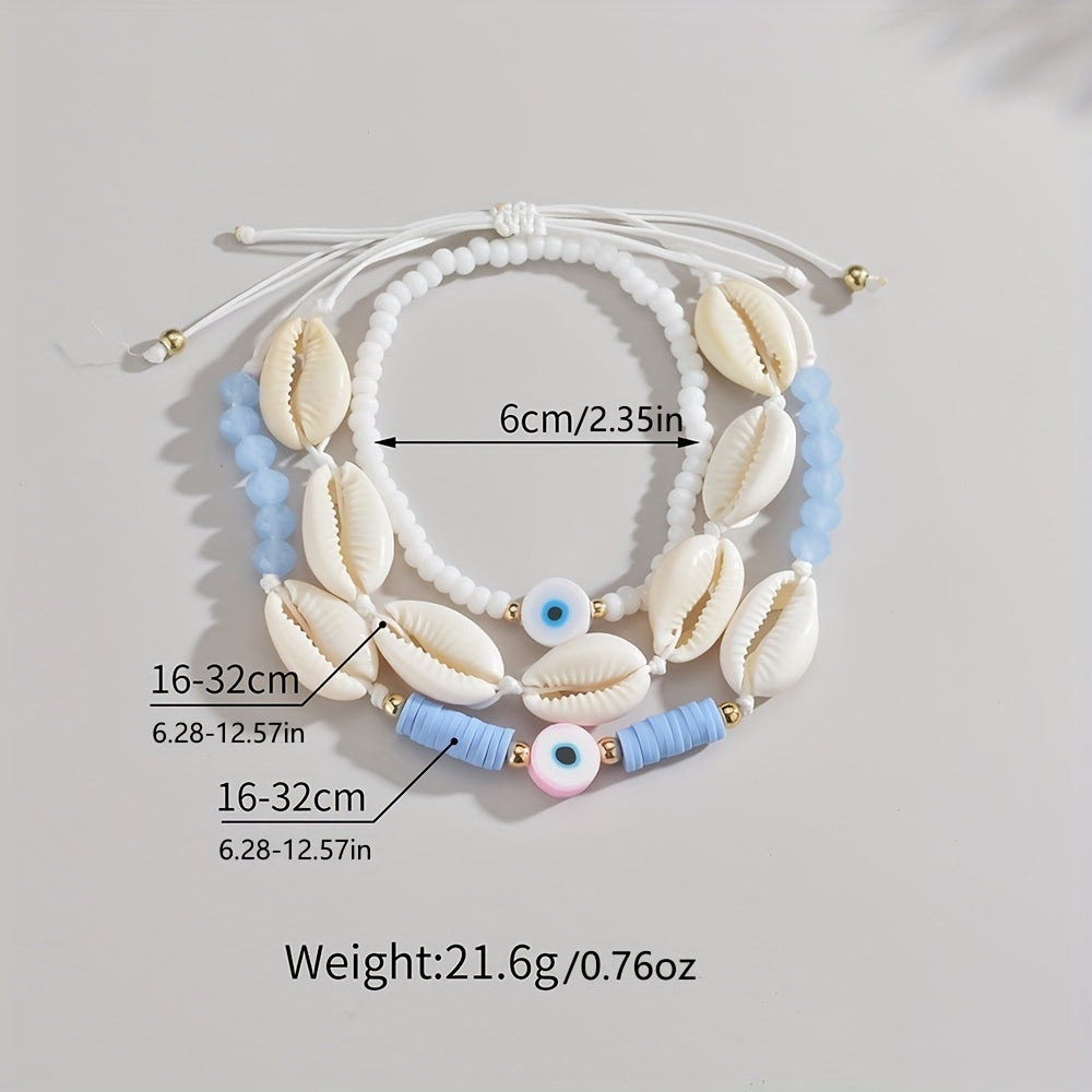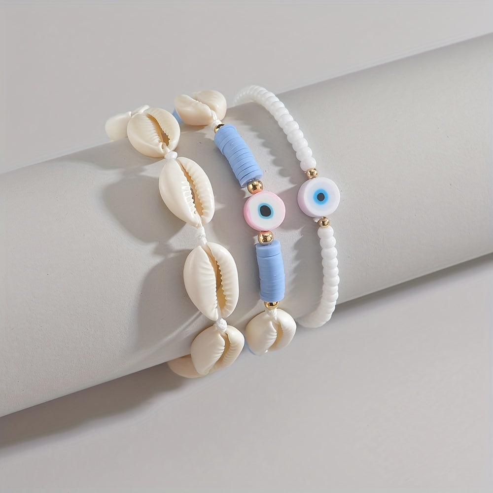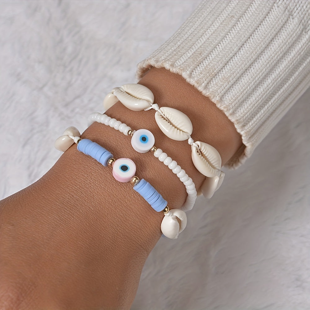 This set includes 3 adorable cartoon soft pottery evil's eye beads bracelets made with natural shell. Perfect for women who love unique jewelry.