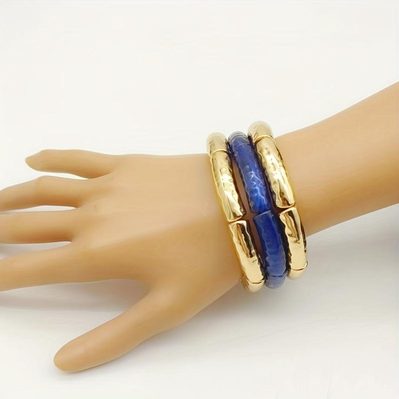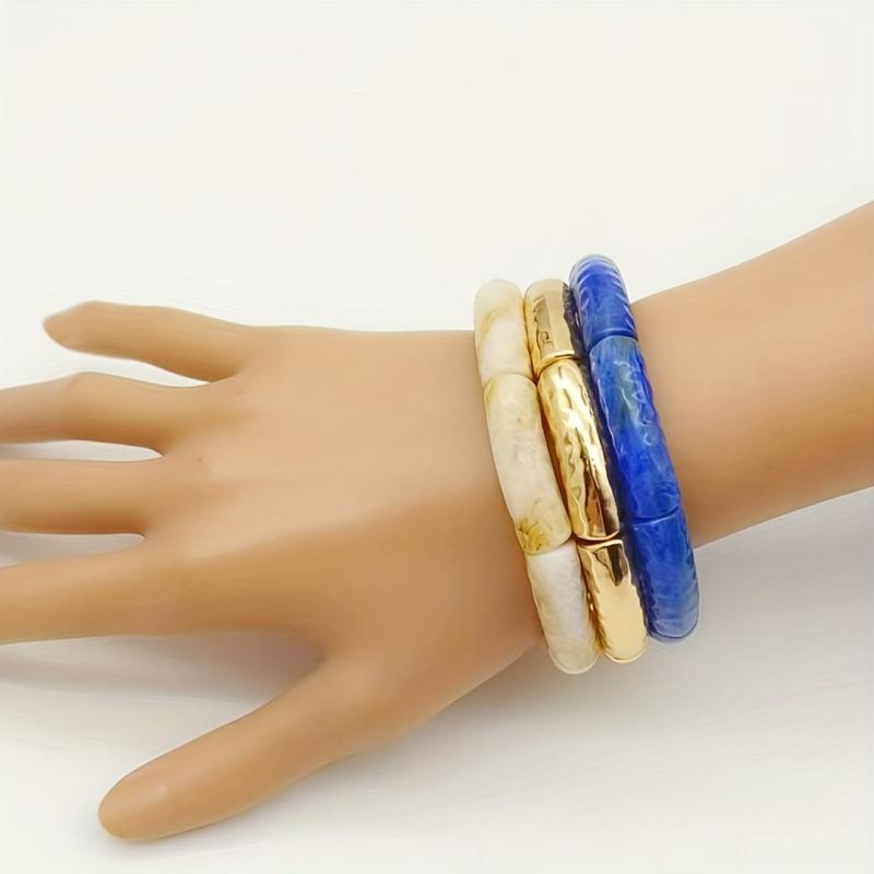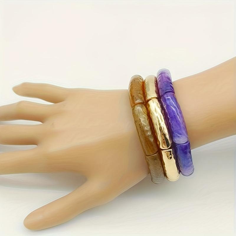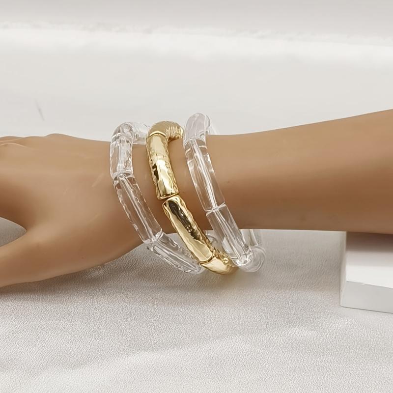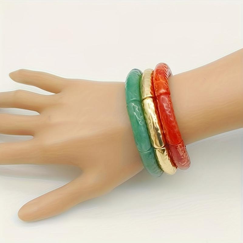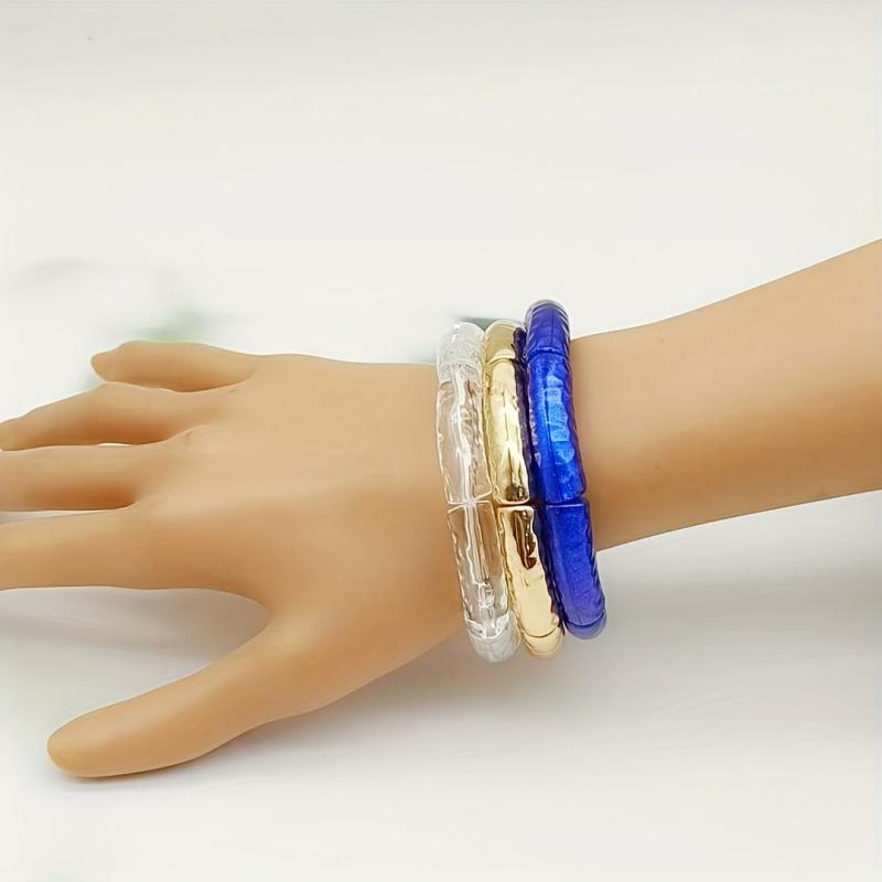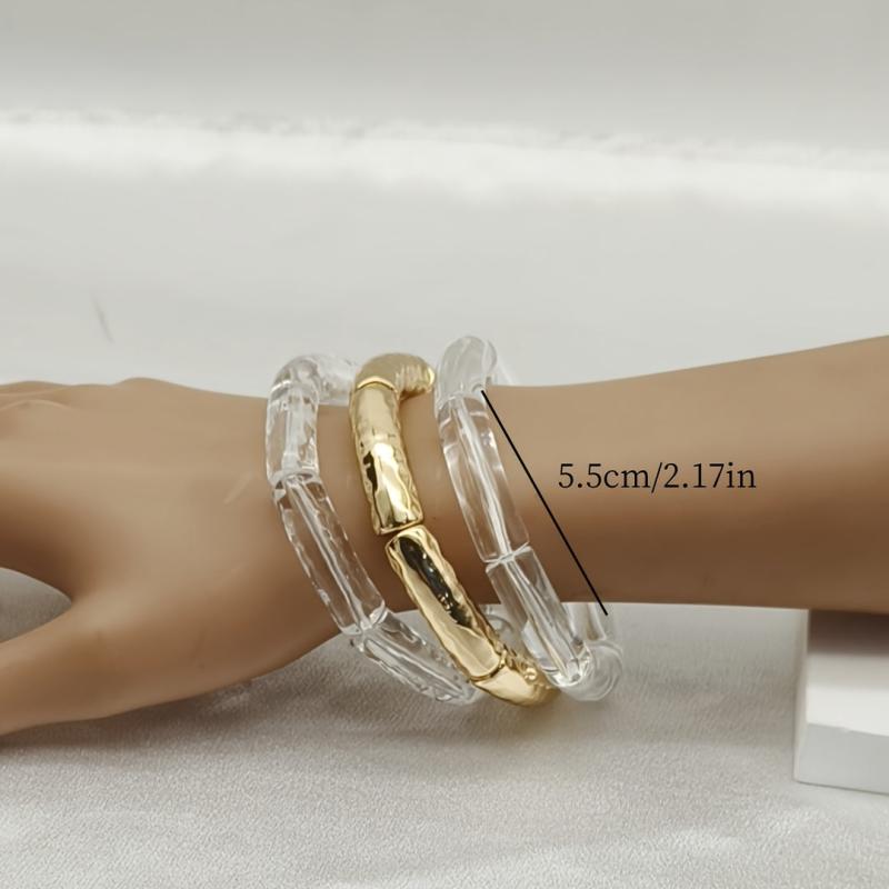 Elevate your daily style with this set of 3 transparent resin CCB elastic bracelets. The retro geometric design and youthful vibe make them perfect for any occasion.
