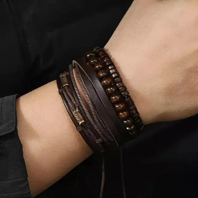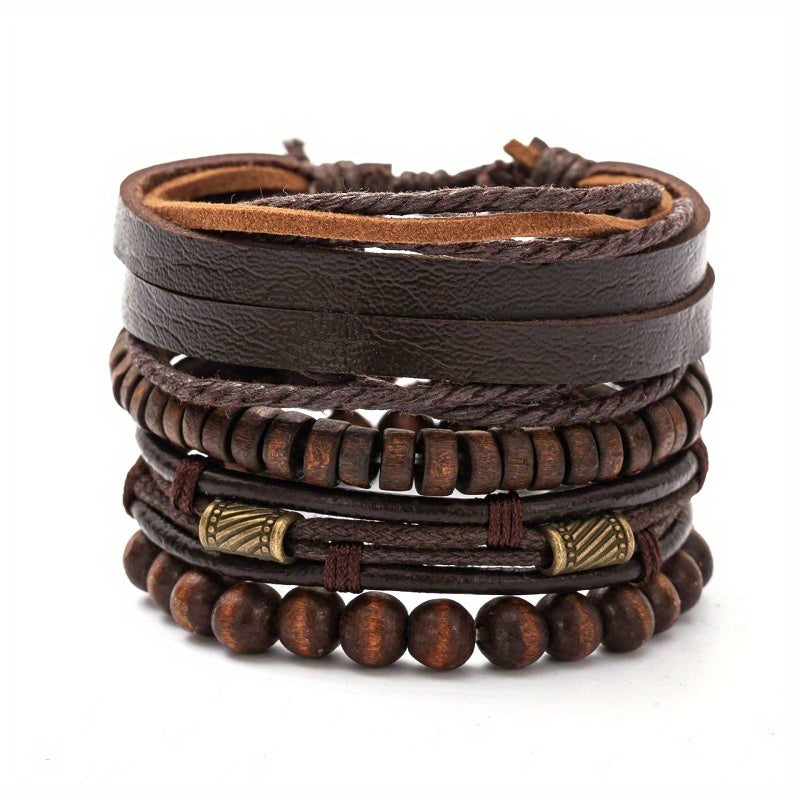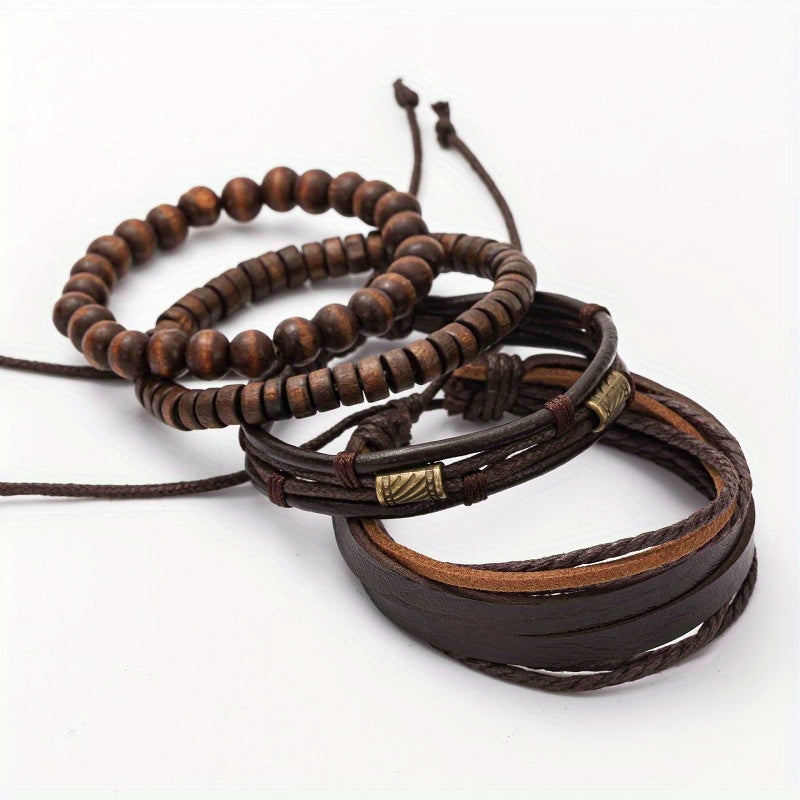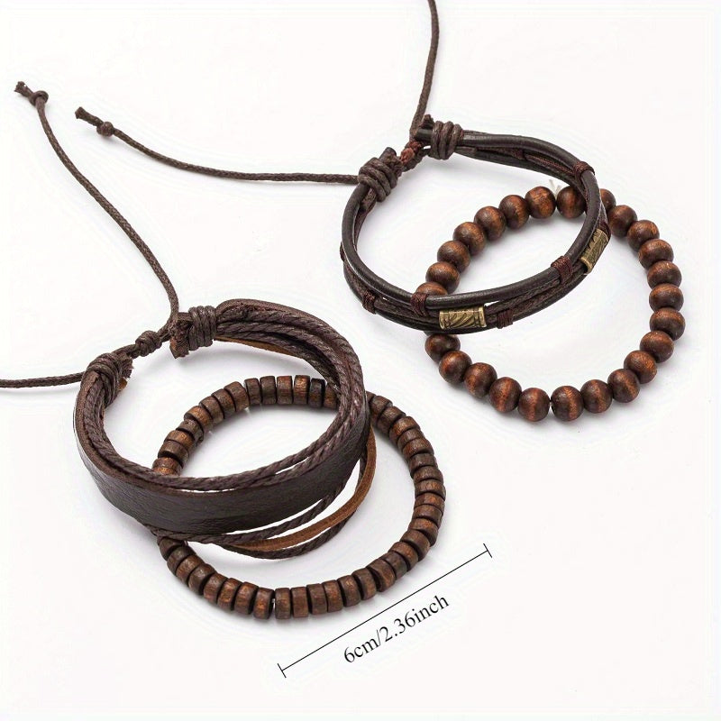 This set includes 4 brown faux leather bracelets with wooden beads. Perfect for a bohemian or surfer-inspired style.