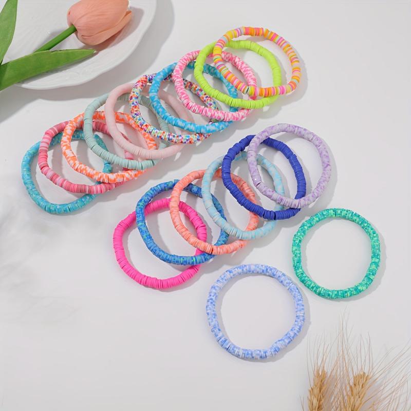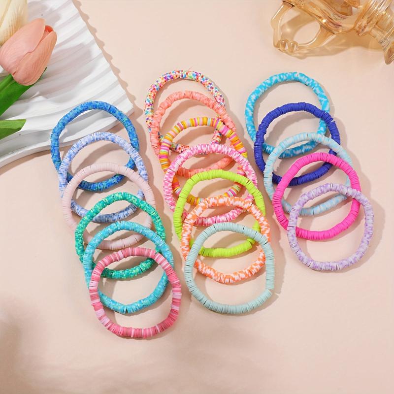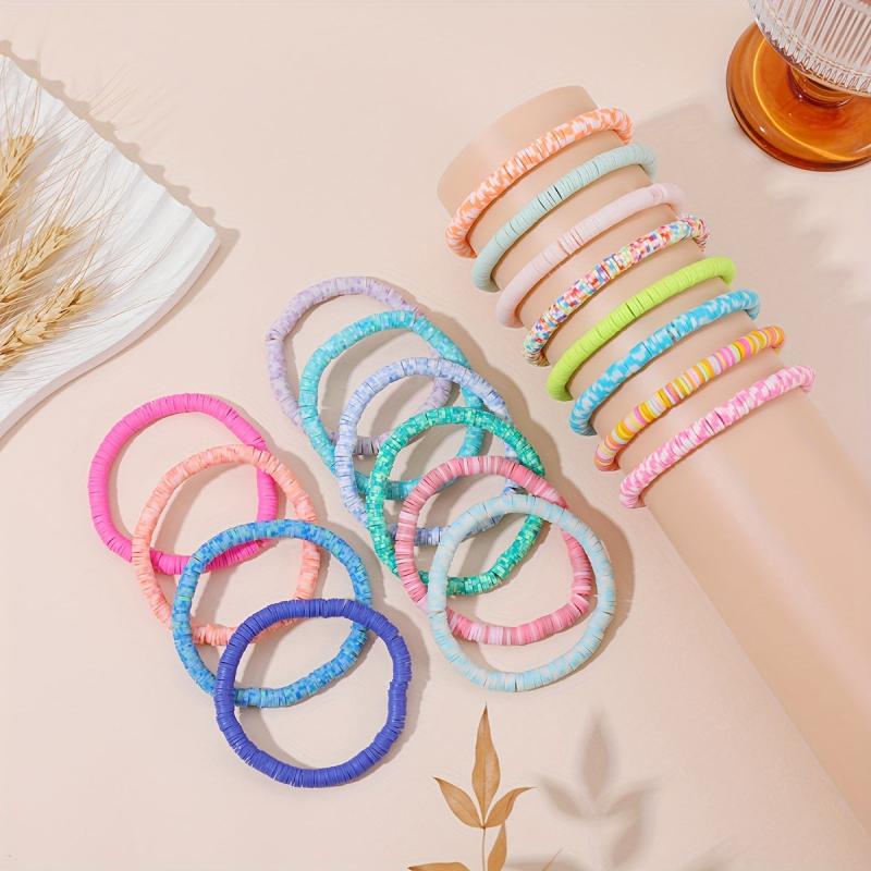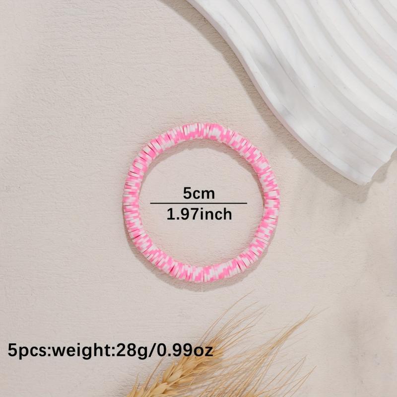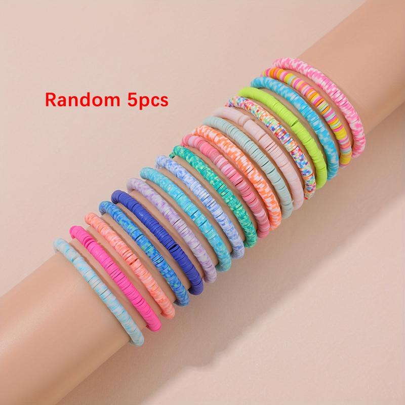 Embrace a bohemian vibe with this set of 5 soft clay bracelets, perfect for casual layering on your vacation. Each bracelet features slight variations for a unique look.