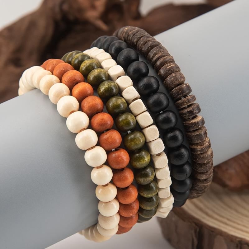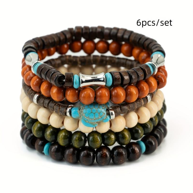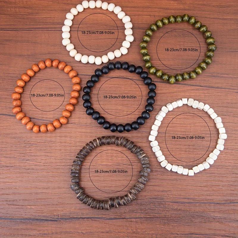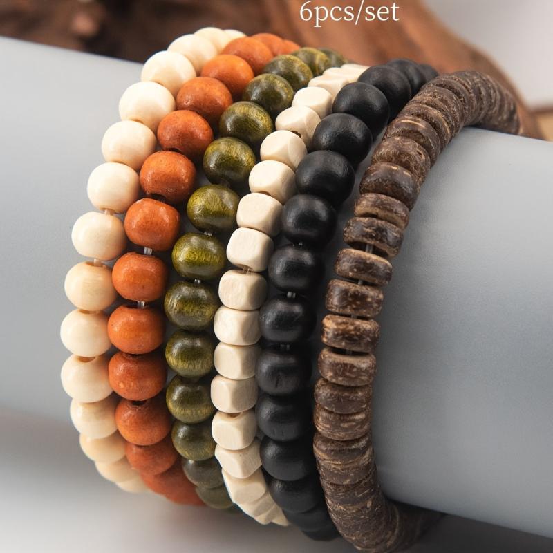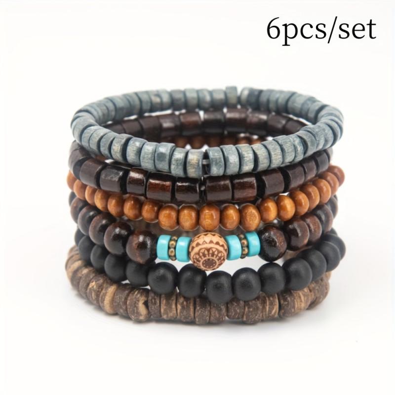 Add a touch of vintage charm to your look with this 6-piece set of wooden beaded bracelets. These unisex bracelets feature a rustic bohemian style that is perfect for men and women alike.