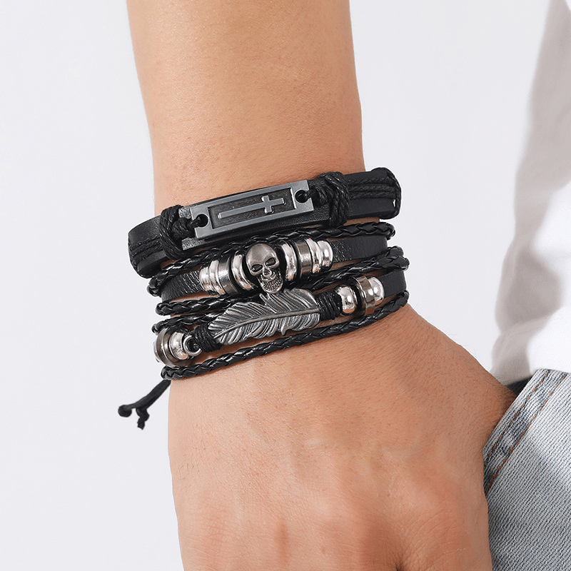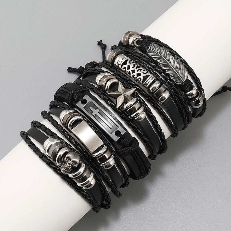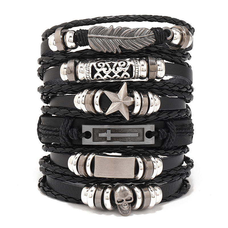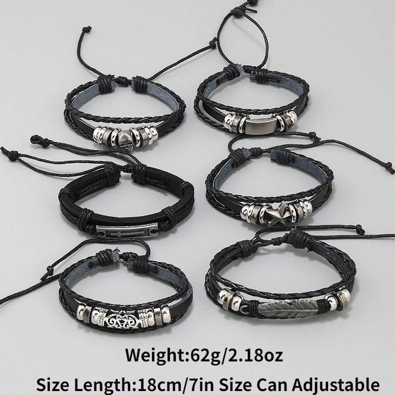 Add a touch of rugged elegance to your style with this set of 6 leather bracelets for men. Each bracelet is adjustable and features a layered design for a trendy look.