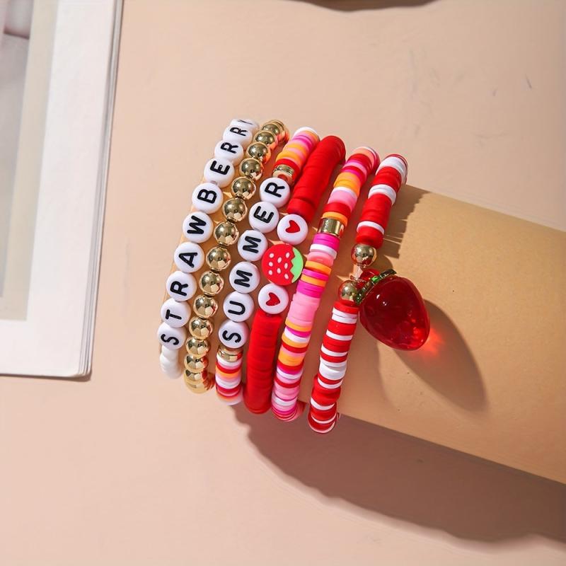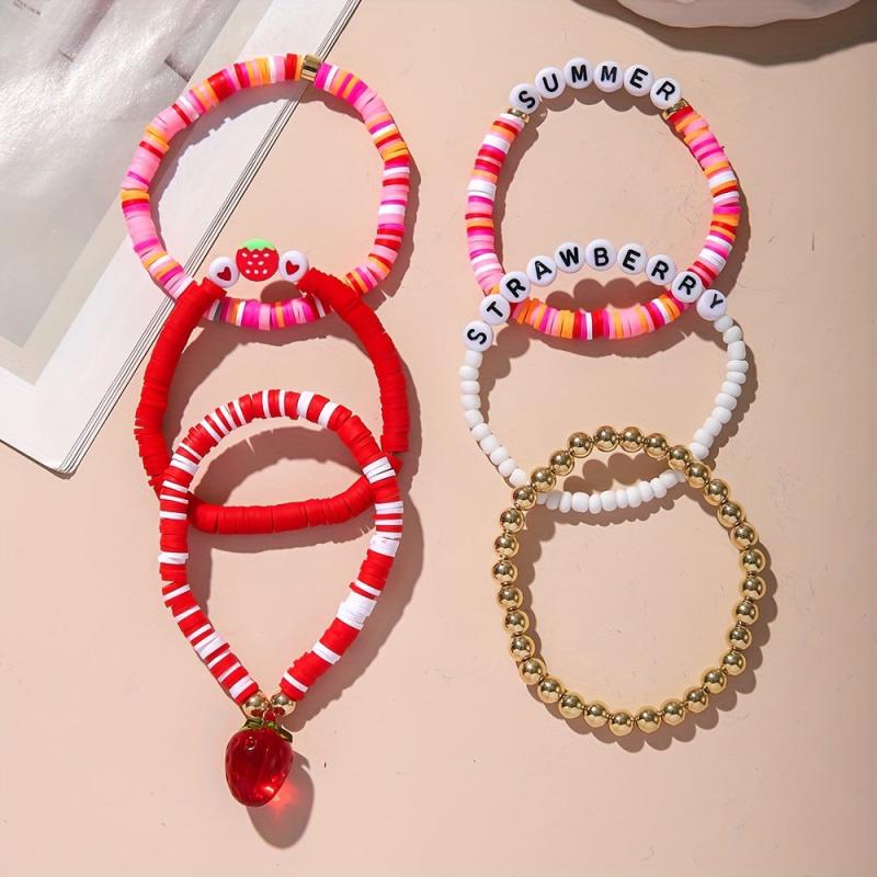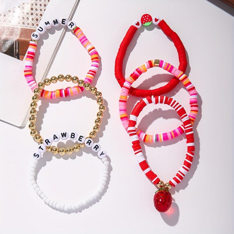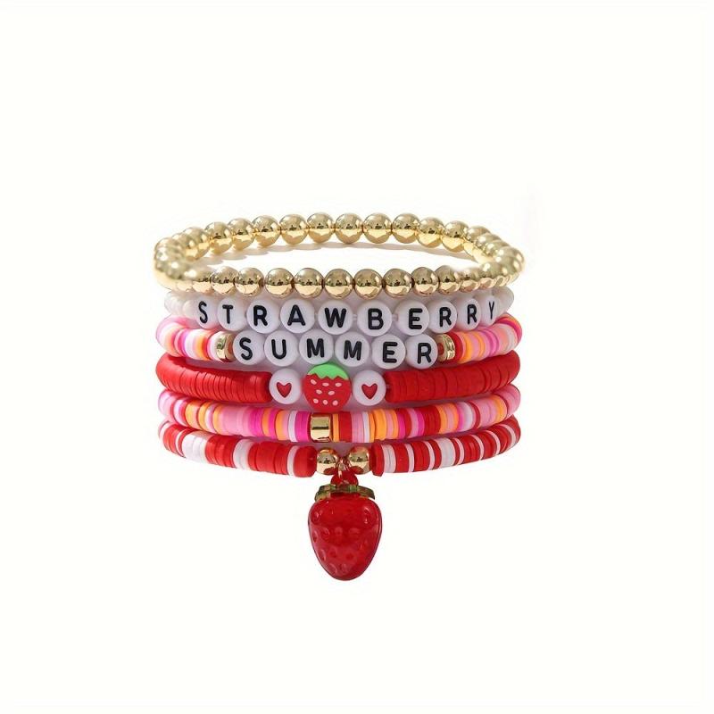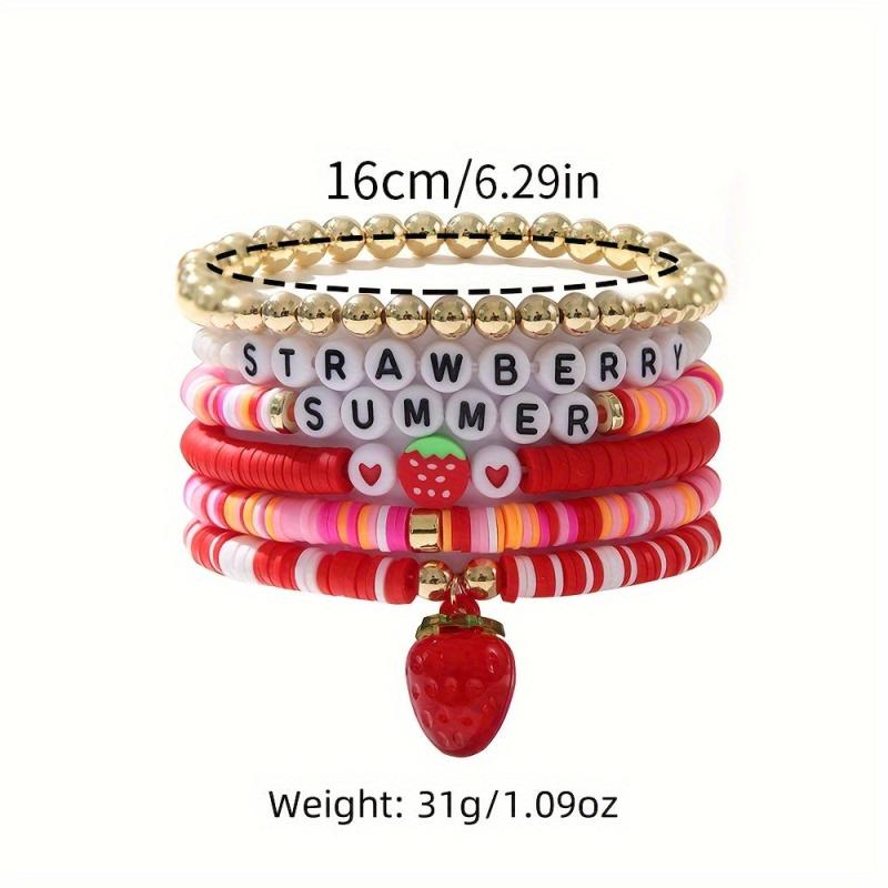Add a touch of summer to your look with this set of 6 colorful tribal style polymer clay beaded bracelets featuring a strawberry pendant charm. Perfect for daily wear and stacking.