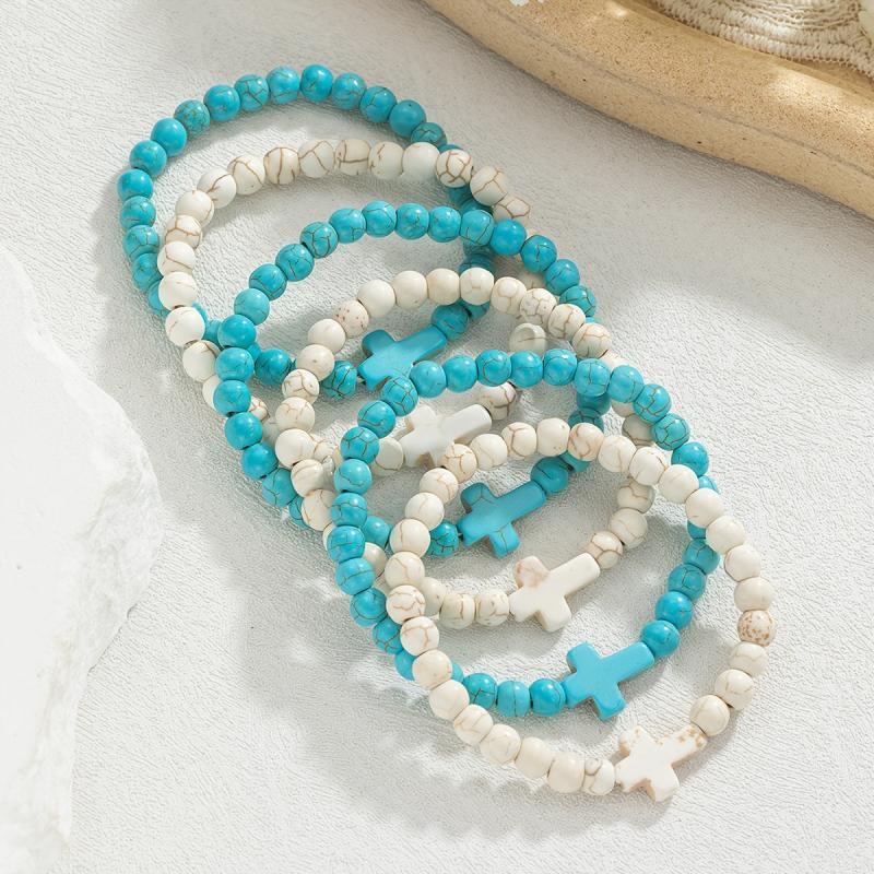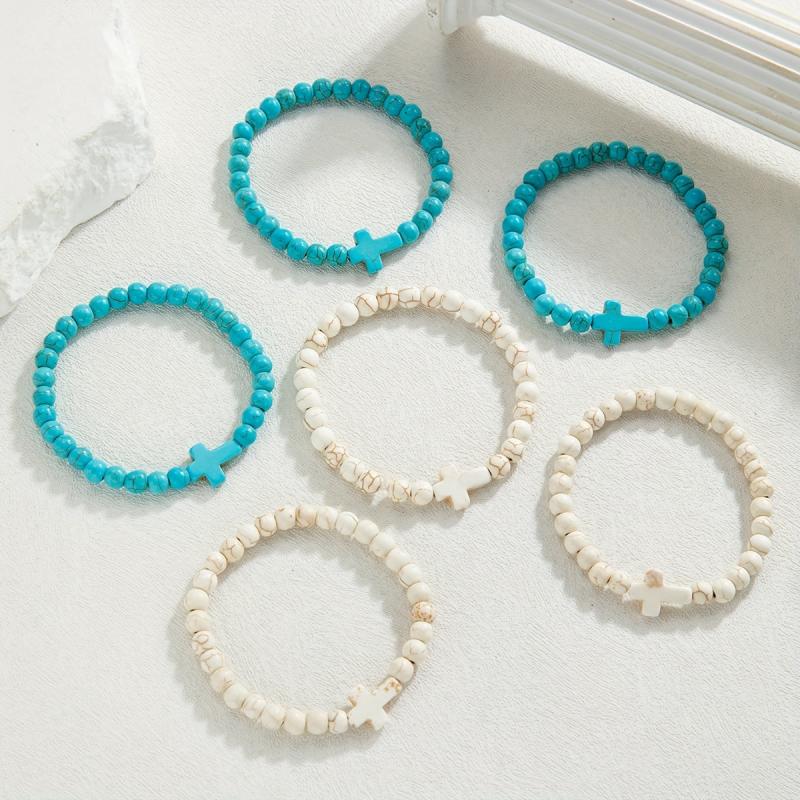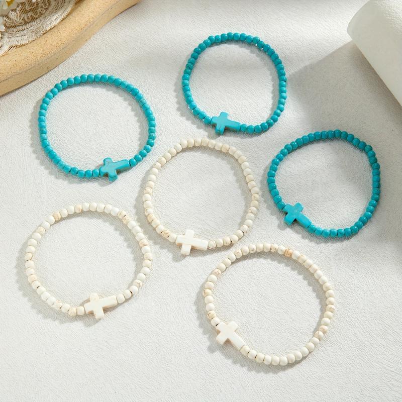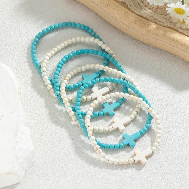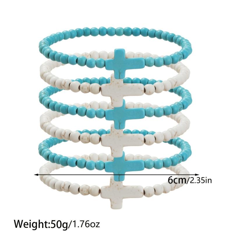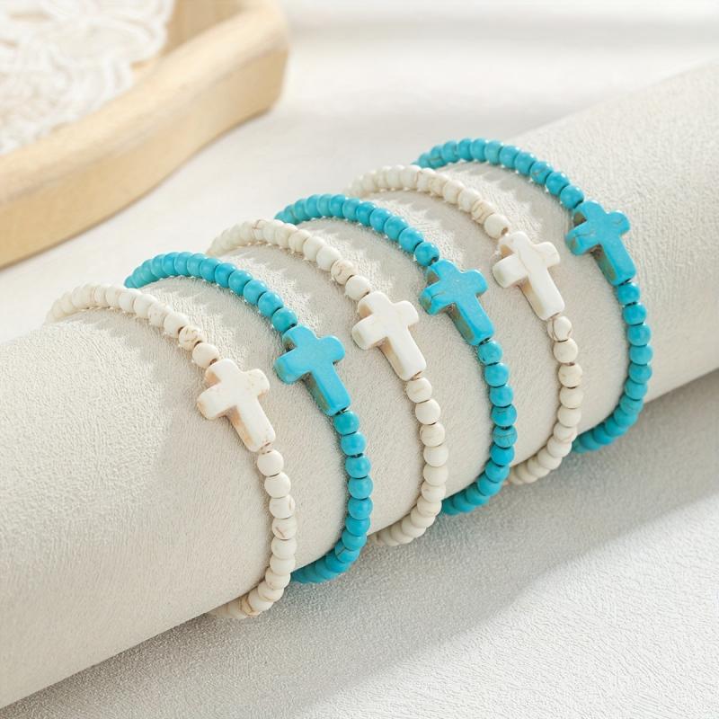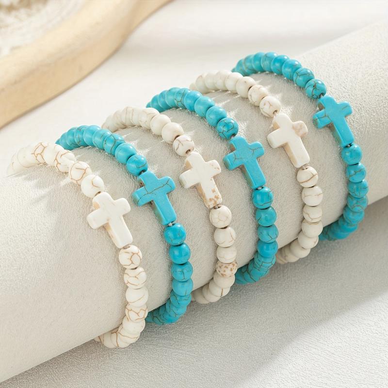Add a touch of vintage charm with this set of 6 turquoise beaded bracelets featuring cross charms. Versatile for casual attire or as a thoughtful gift.
