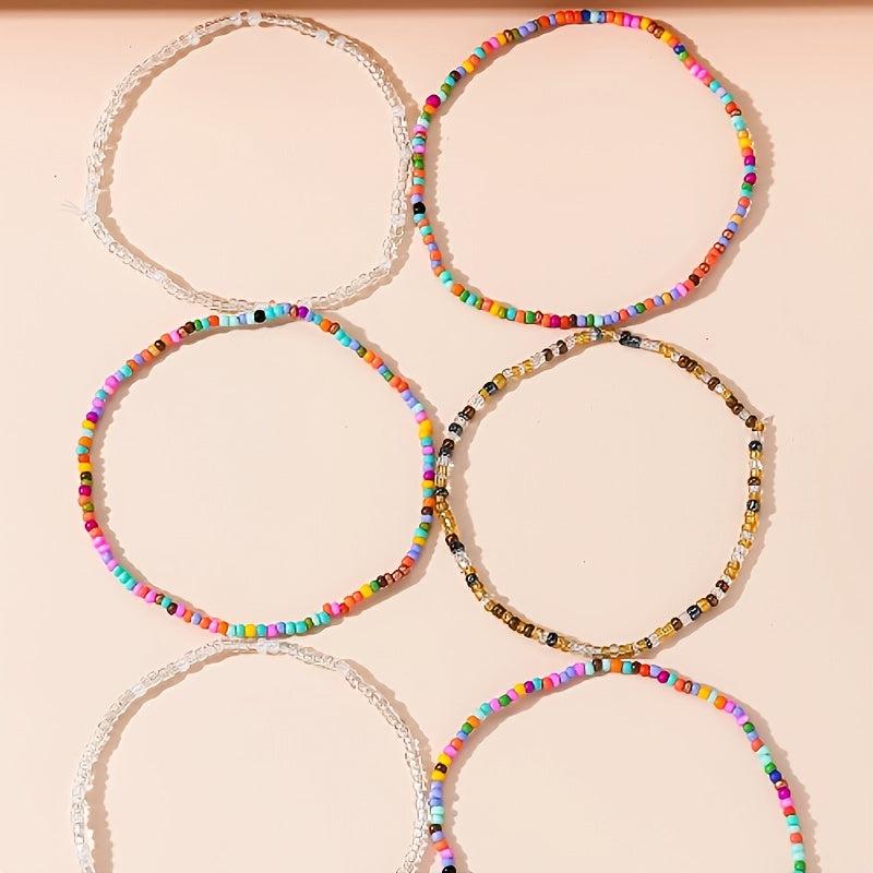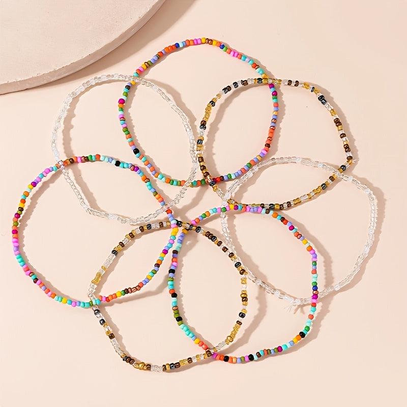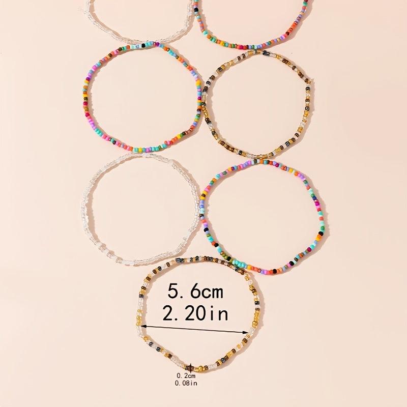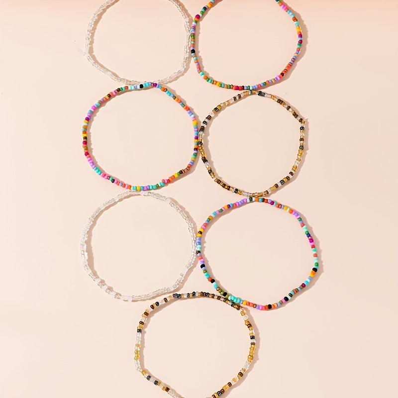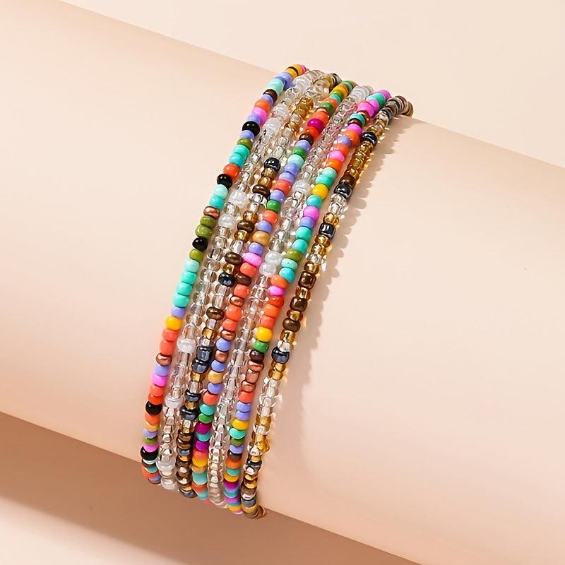Add a pop of color to your outfit with this 7-piece bracelet set featuring vibrant rice bead designs. Perfect for a women's niche style or party accessory.