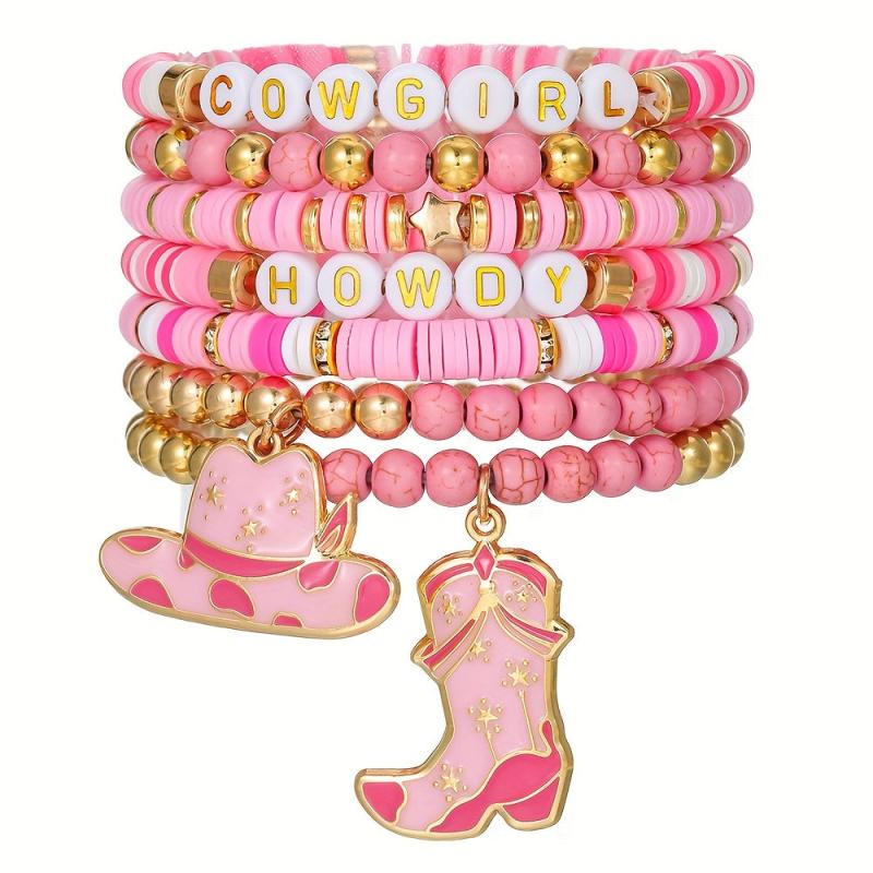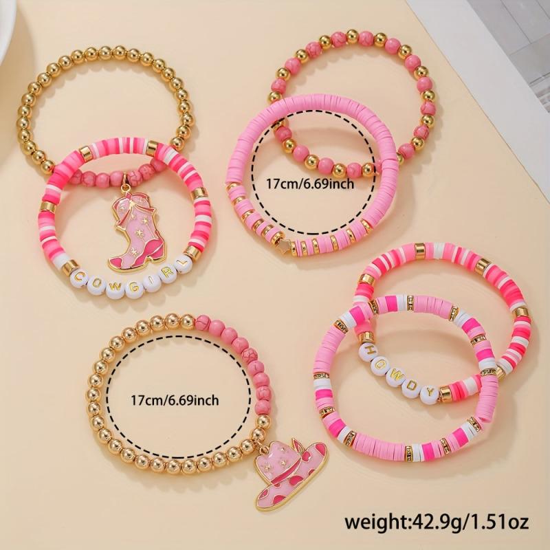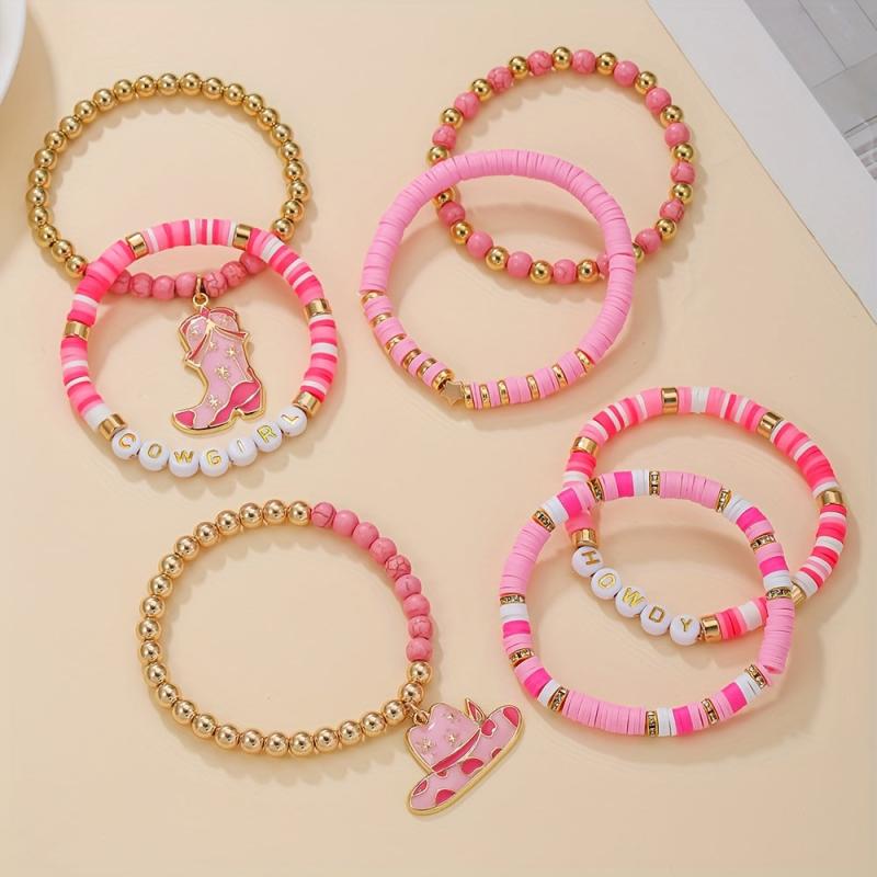 This 7-piece bracelet set features letter and cowgirl designs, made with soft clay and elastic bands. Suitable for daily wear or as a thoughtful gift for friends or girlfriends.