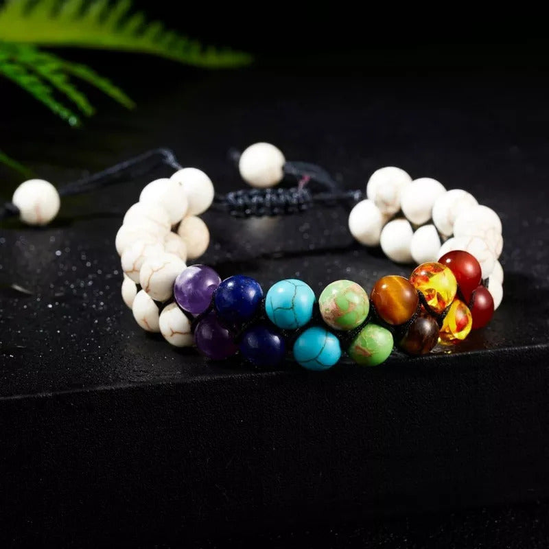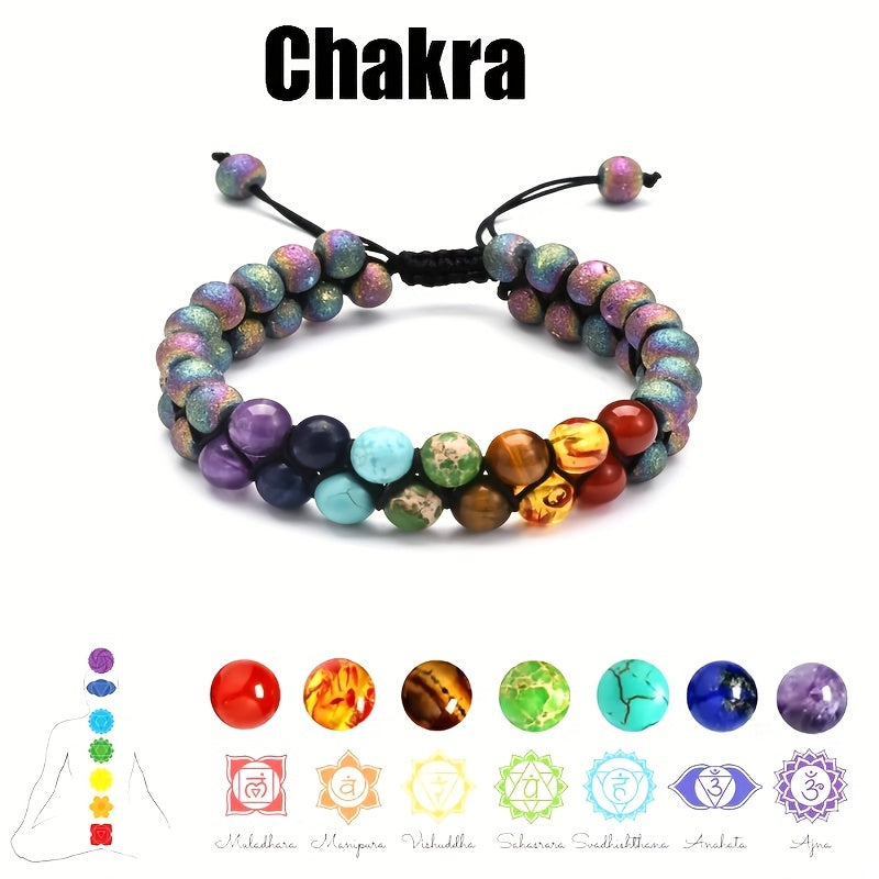 Enhance your energy flow with this 8mm double braided bracelet featuring 7 chakra stones. Perfect for yoga enthusiasts!
