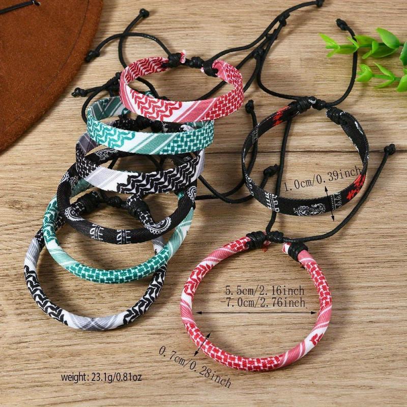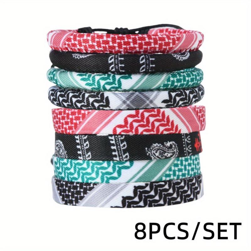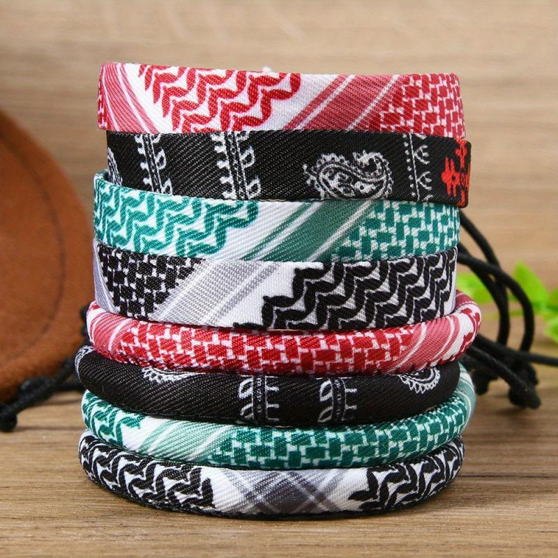 Enhance your wrist with this set of 8 vibrant Arab scarf style fabric bracelets. Each bracelet features unique, ethnic patterns for a bold and stylish look.