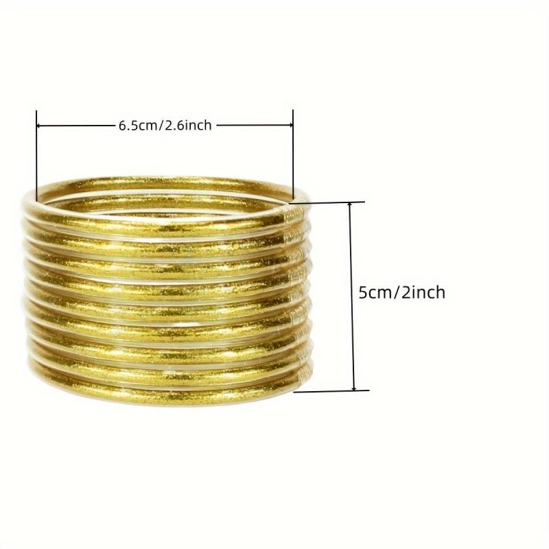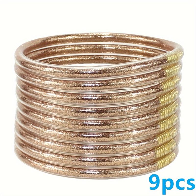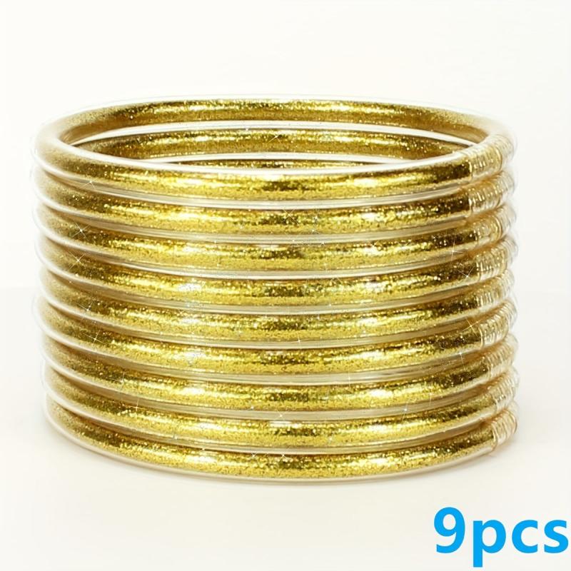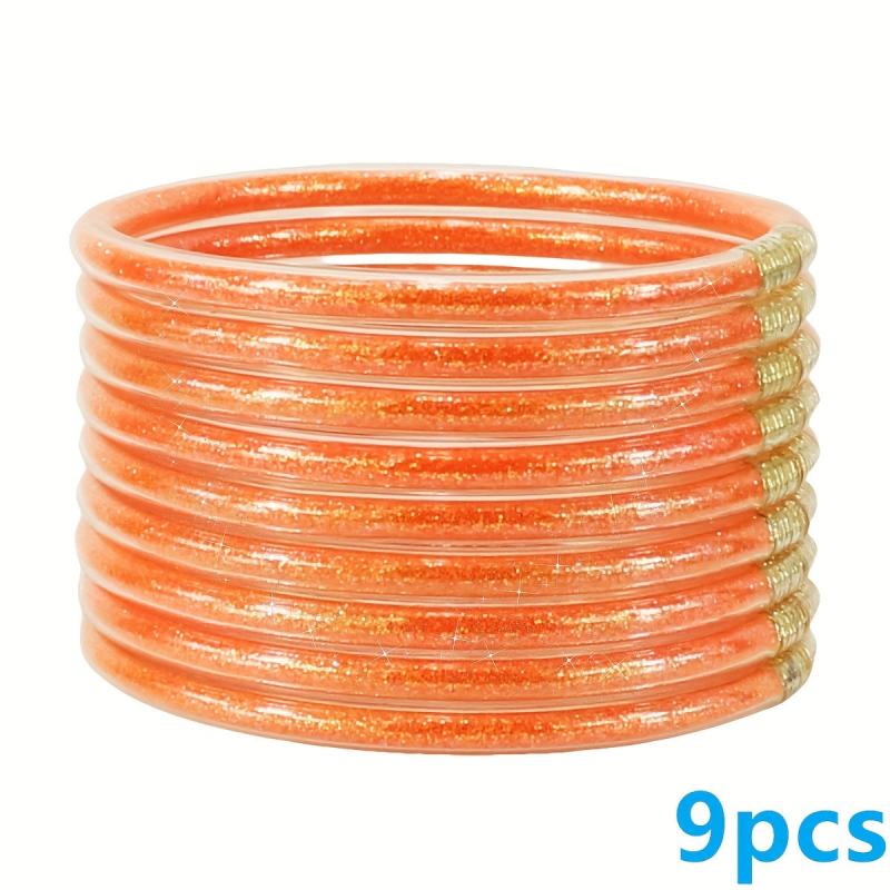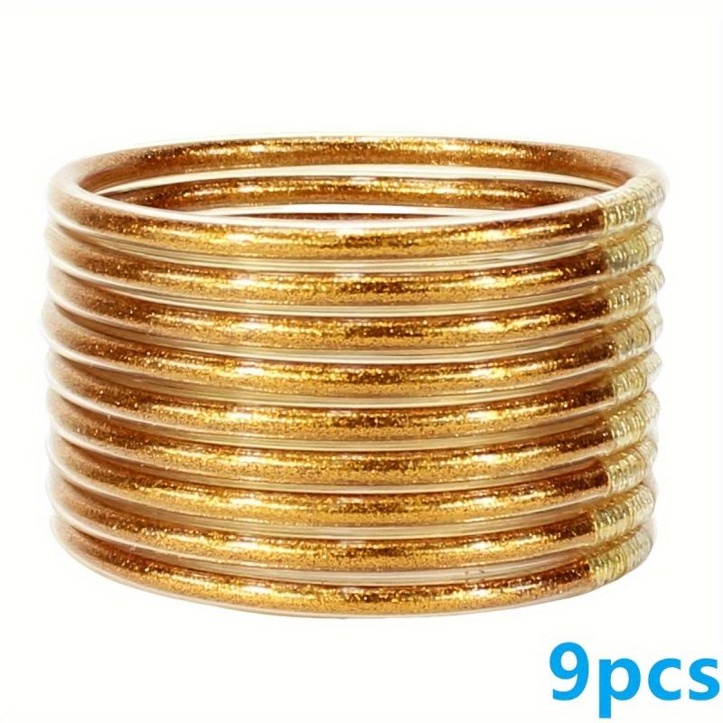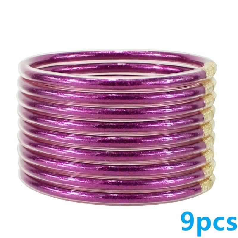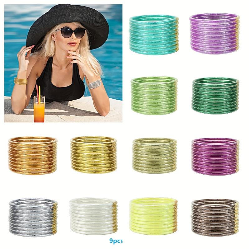 Surprise the women and girls in your life with this set of 9 soft filled jelly silicone bracelets that are stylish and sparkling. These bangles make the perfect gift for any occasion.