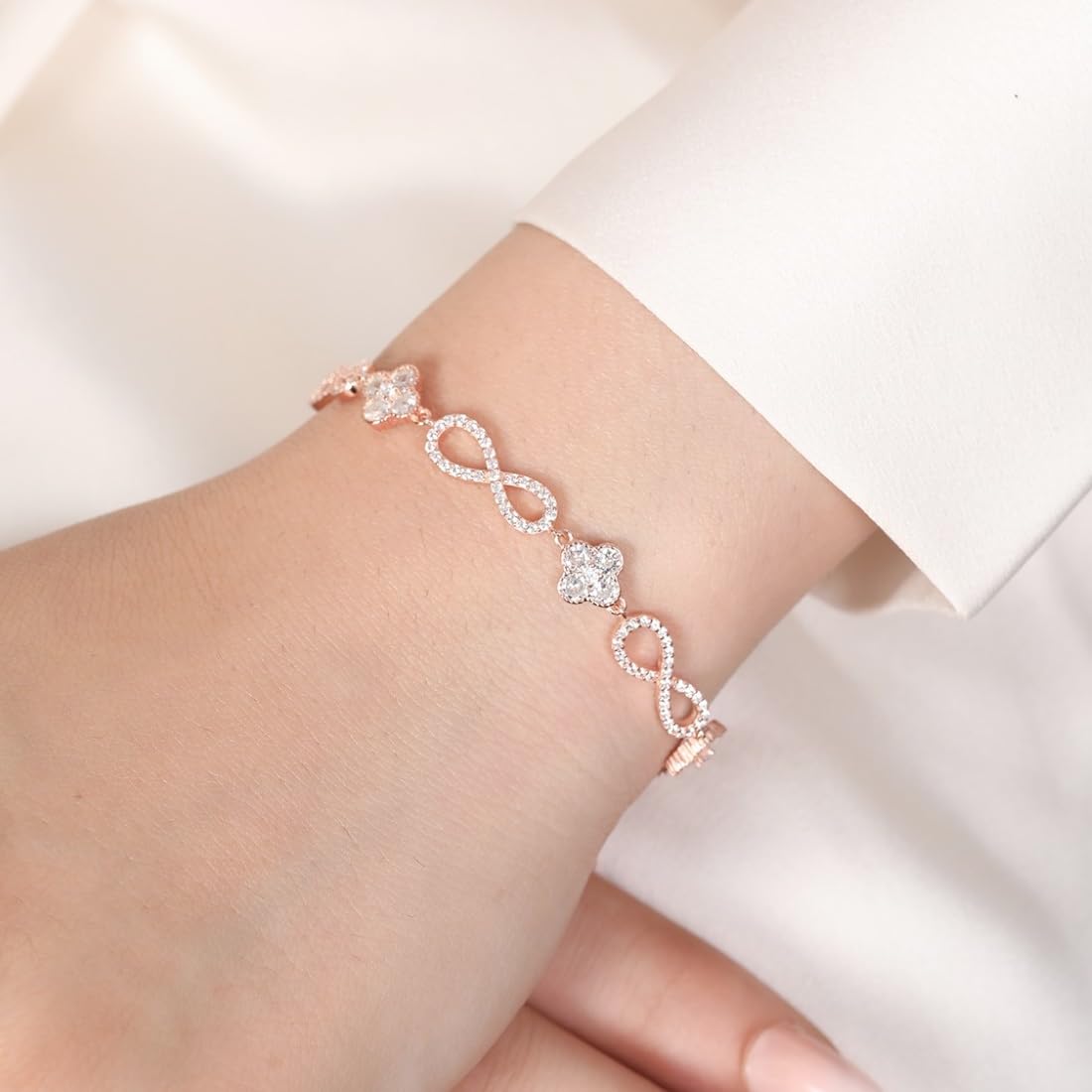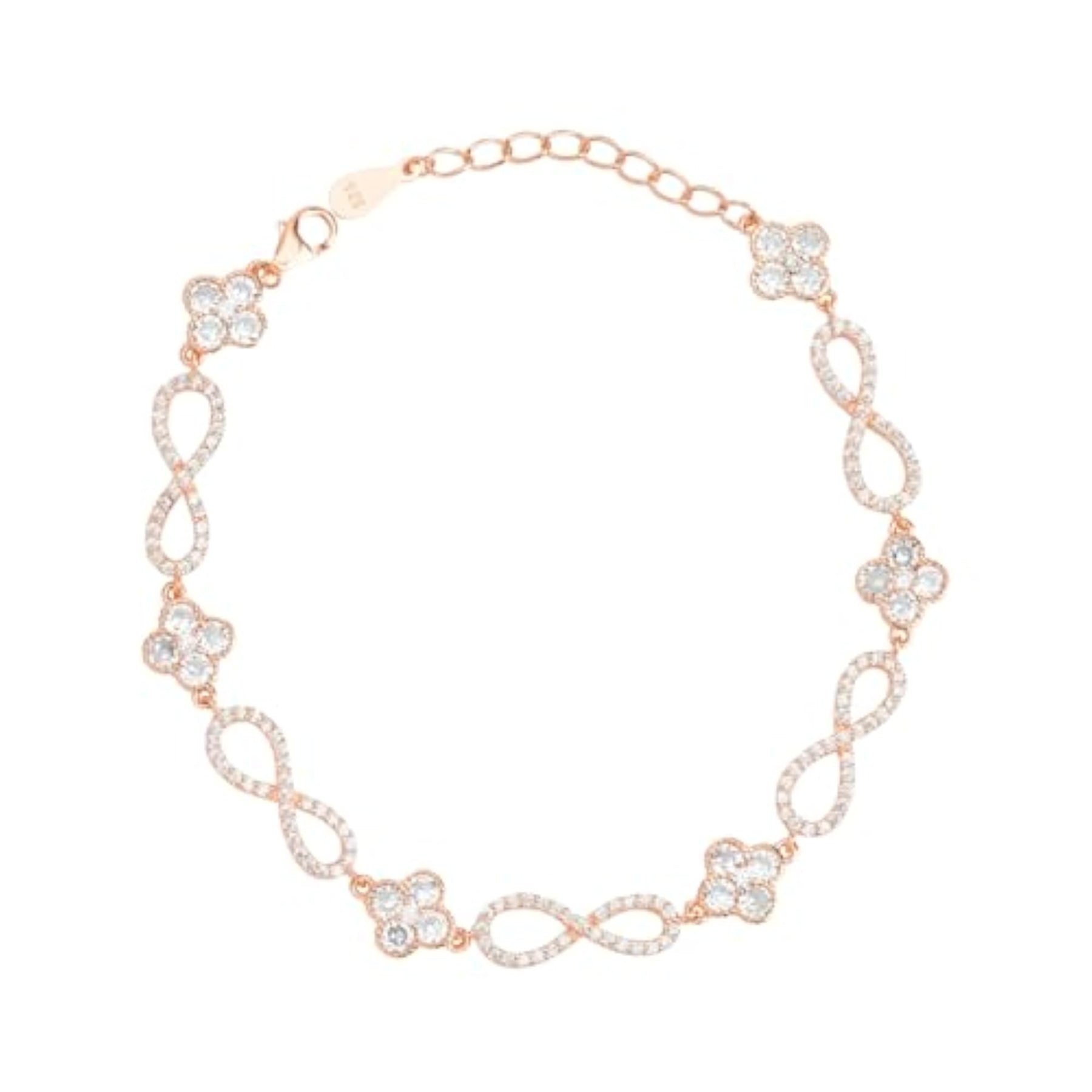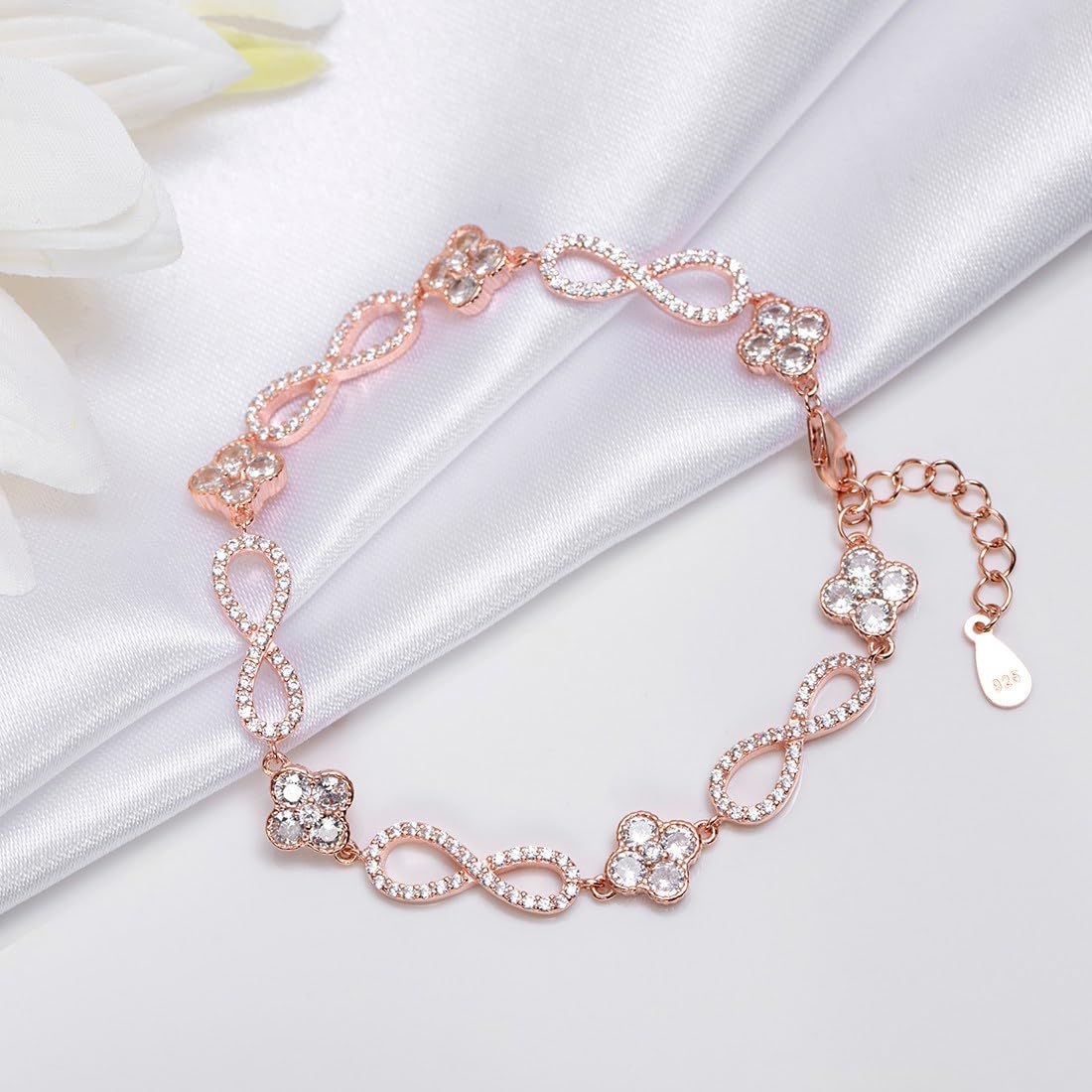 This elegant bracelet features a floral and infinity design, made of 925 sterling silver with rose plating. It is adjustable to fit most wrist sizes.