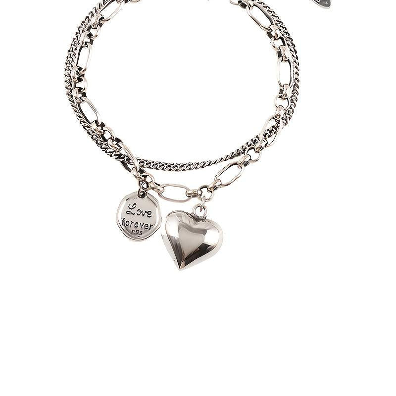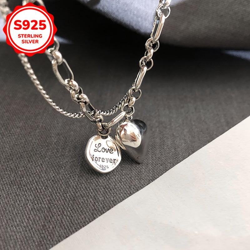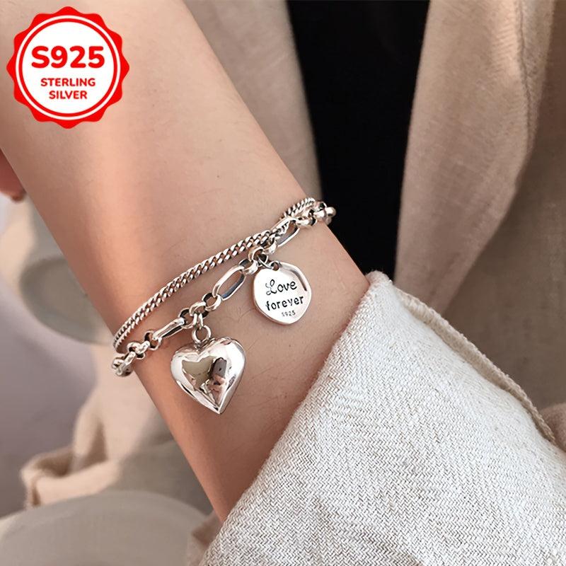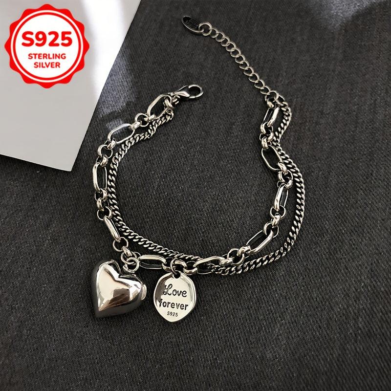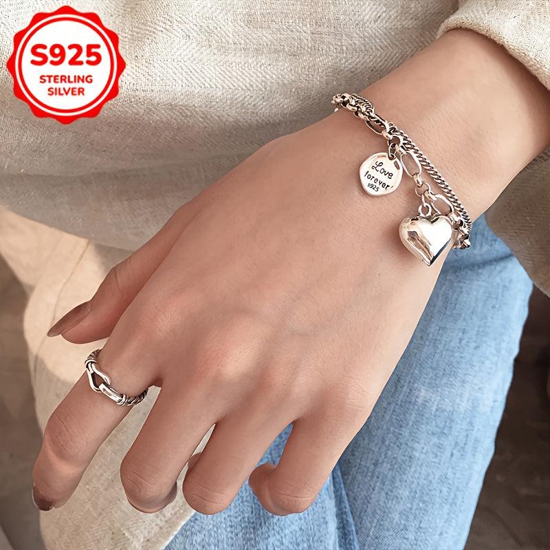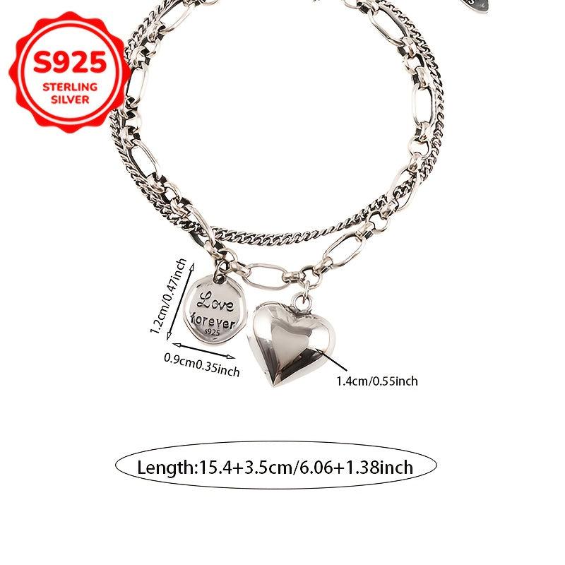 This 925 sterling silver charm bracelet features a double-layer design with an engraved 'Love You Forever' heart pendant, perfect for vintage style lovers. Hypoallergenic and ideal for gifting.