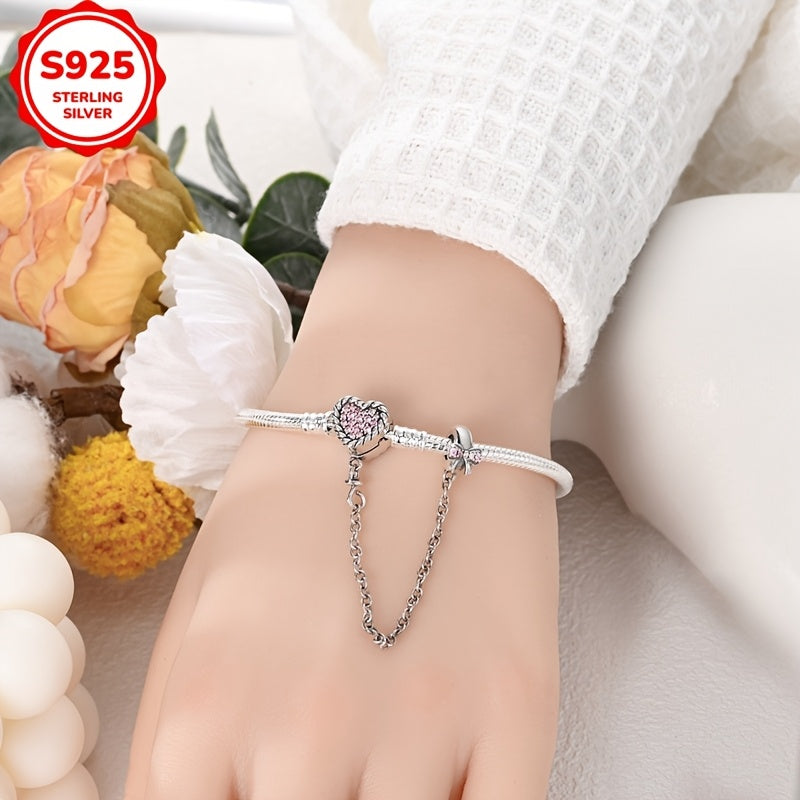 Elegant 925 silver snake bone bracelet featuring sparkling love and bow design. Perfect for daily wear and DIY charm beads. Ideal gift for women.