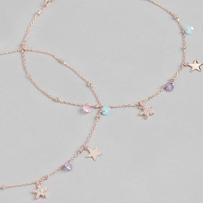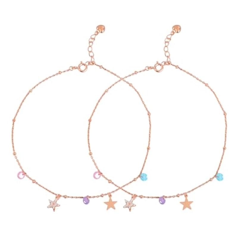 Add a touch of style to your look with this stunning pair of multicolour star and drop rose plated anklets. Made of 925 sterling silver with a hallmark, these anklets are perfect for any occasion.