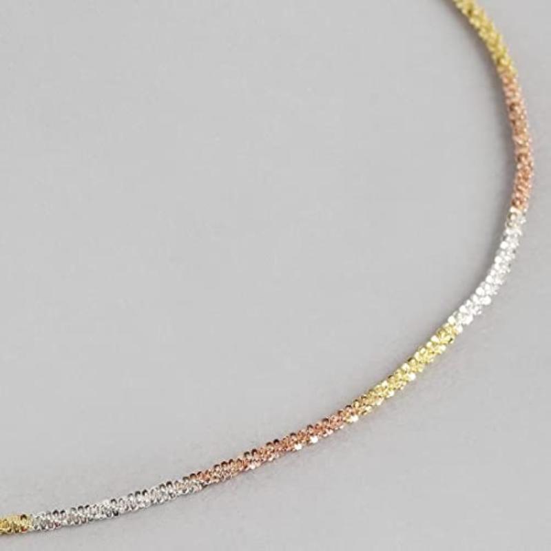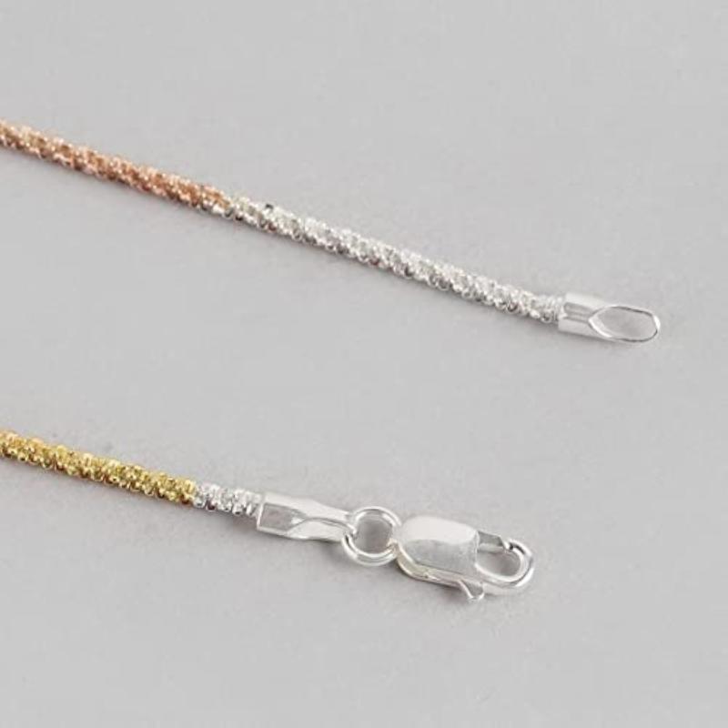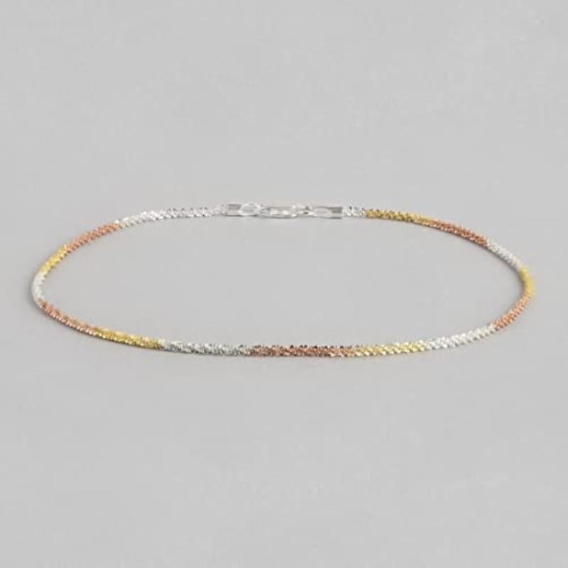 This anklet is made of 925 sterling silver with a gentle triple tone plating, ensuring a stylish and hypoallergenic accessory for your ankle. The anklet features a stamp of authenticity.