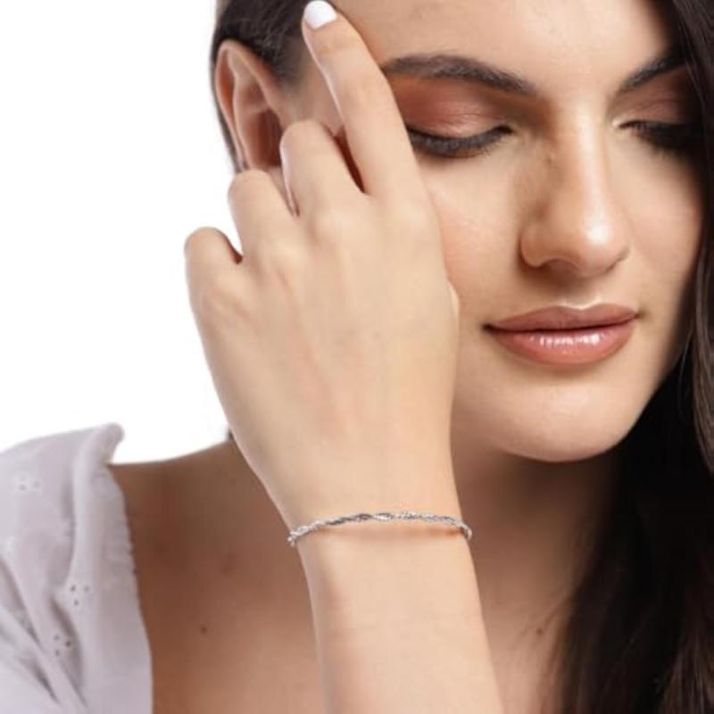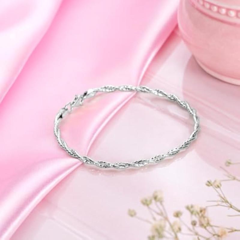This beautiful bracelet is made of 925 sterling silver with a twisted design. It is rhodium plated for extra shine and durability, making it a perfect gift for girls or mothers. The bracelet is stamped with 925 for authenticity.