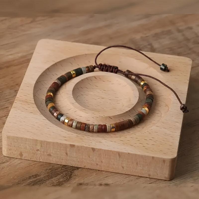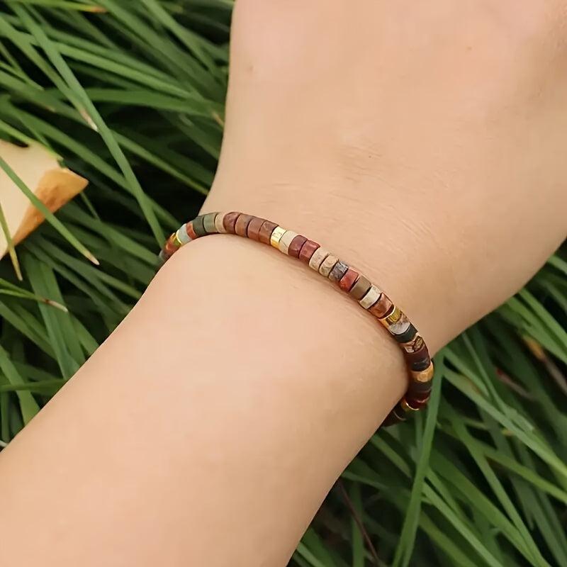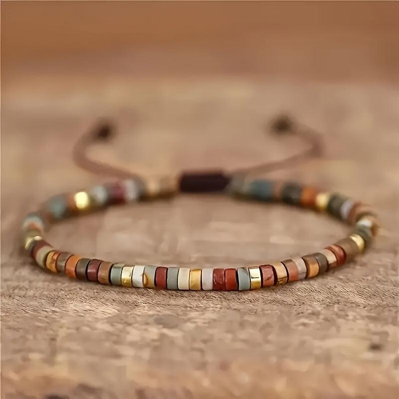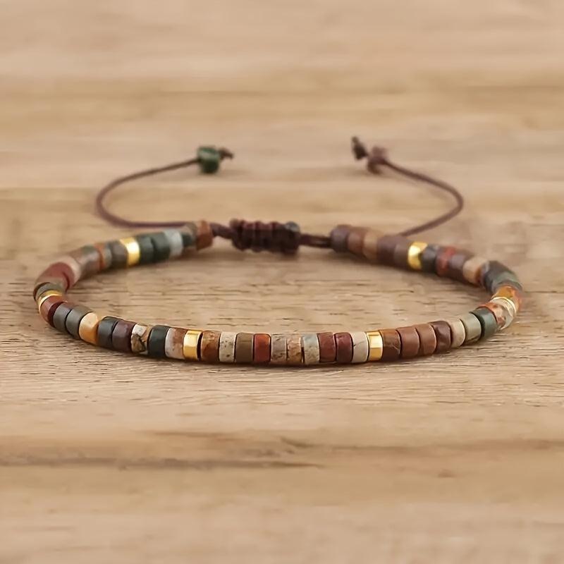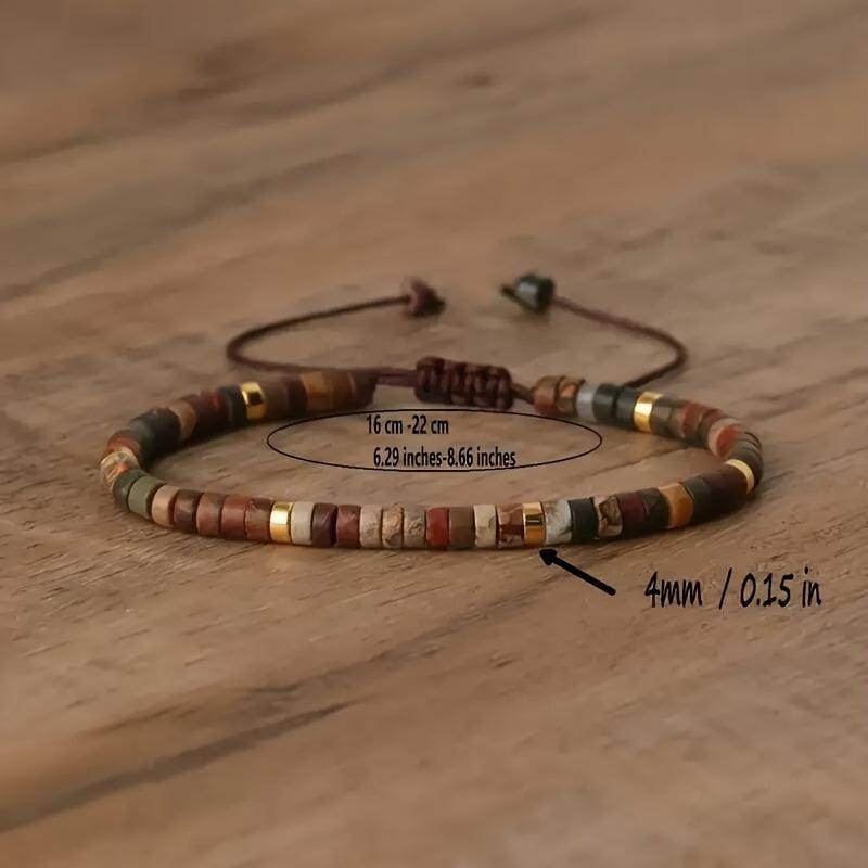 Elevate your style with this adjustable bohemian bracelet featuring natural stone beads in colorful earthy tones. The minimalist design with brown cord and green beads is perfect for both casual and formal wear.