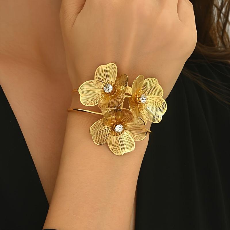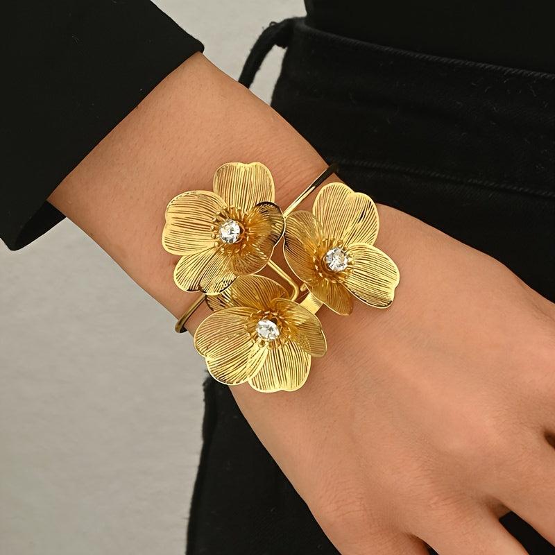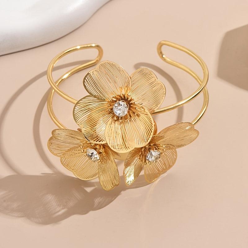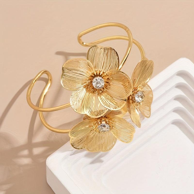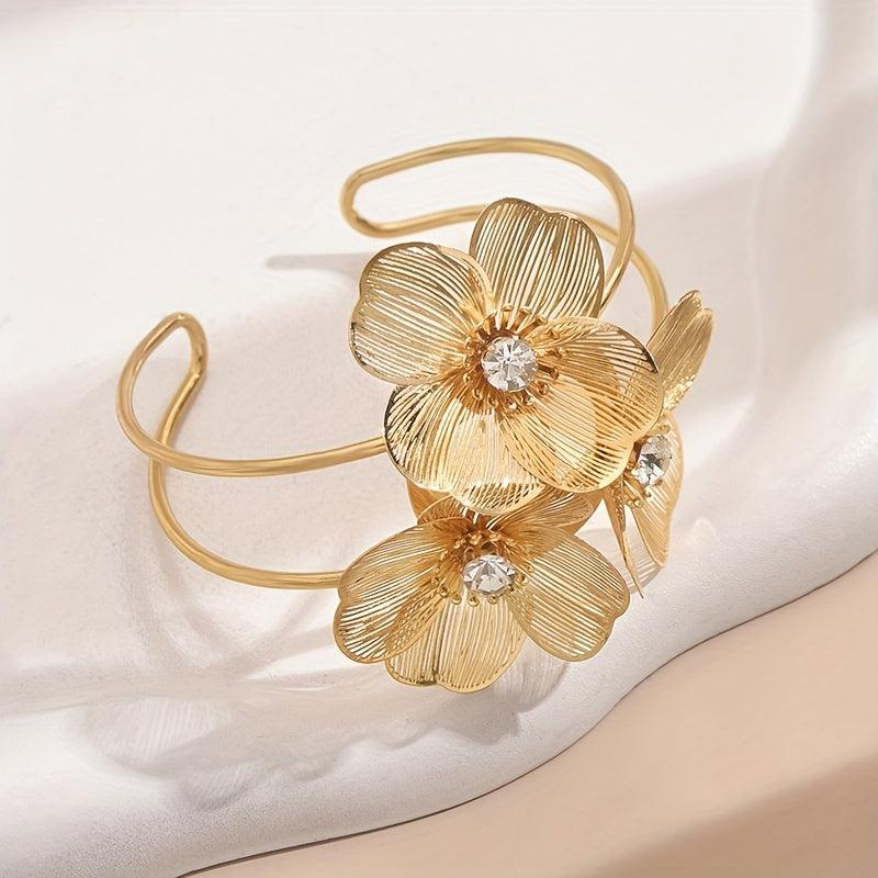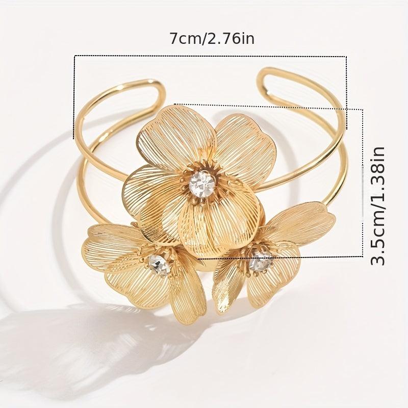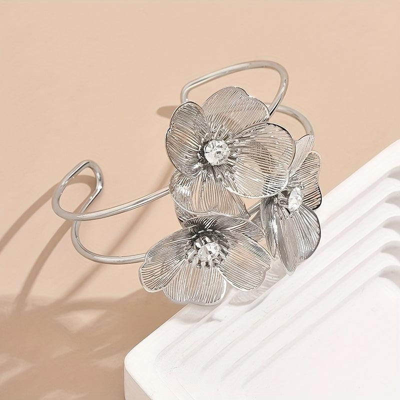 Elevate your look with this stunning 3D floral open cuff bracelet. Made of iron, it features gemstone accents that add a touch of elegance. Perfect for both casual and formal occasions.