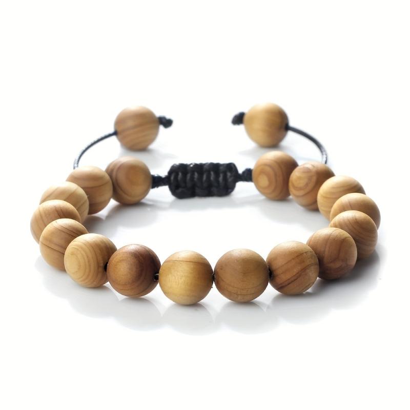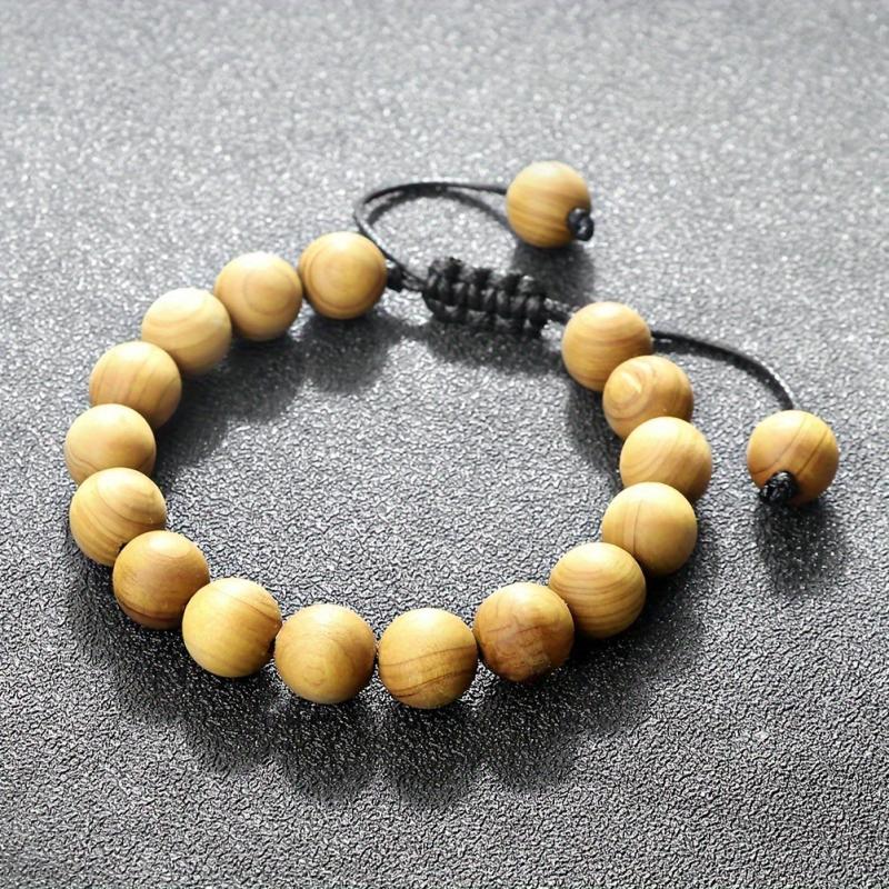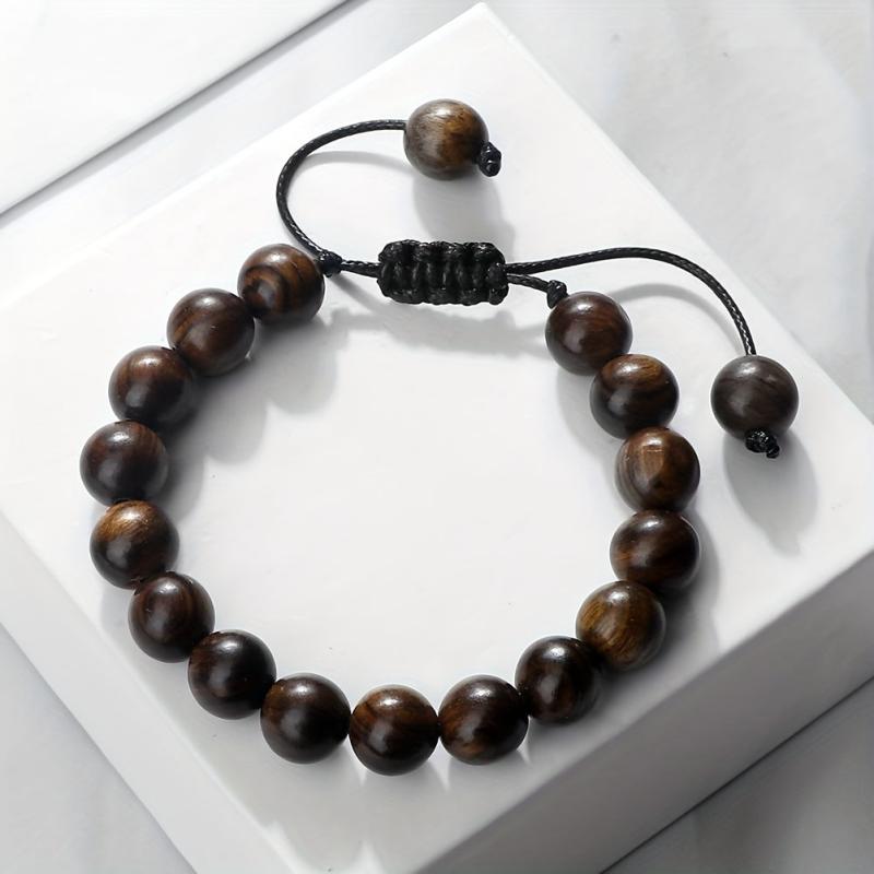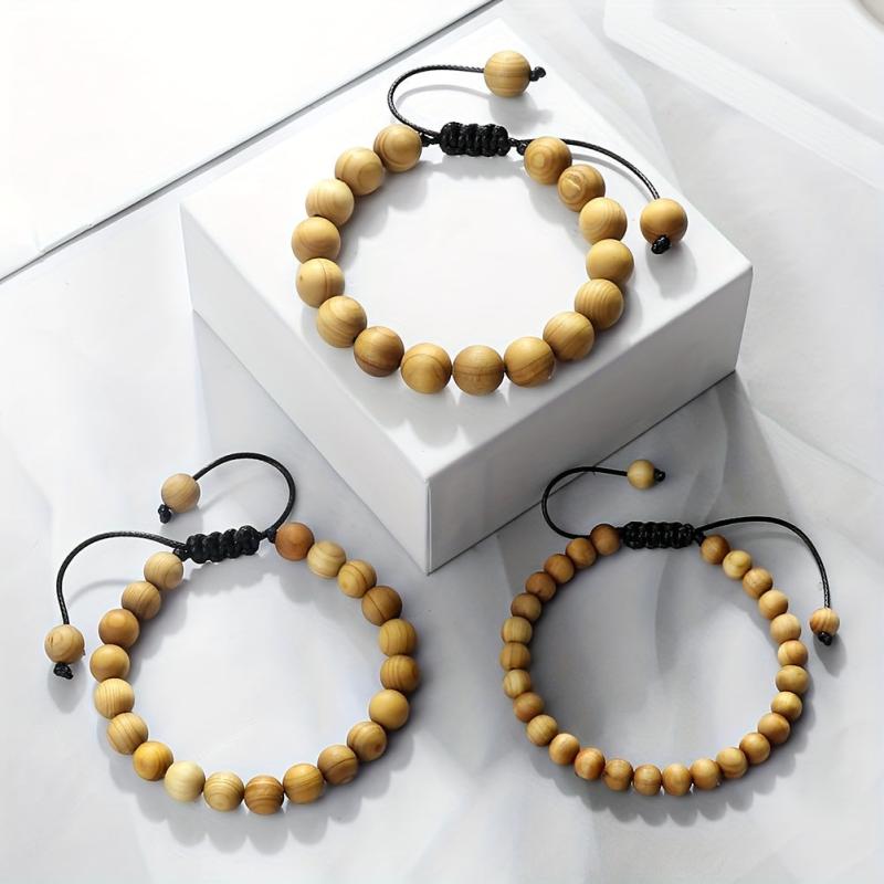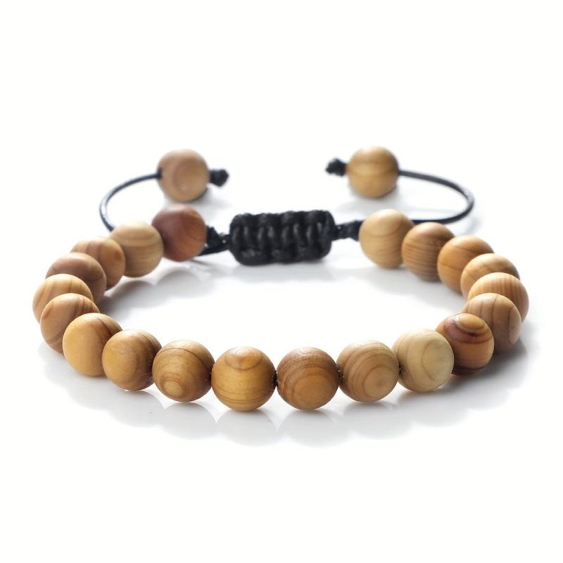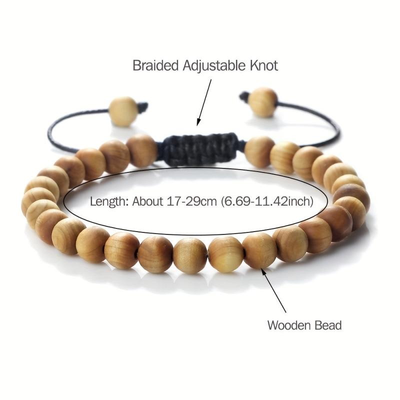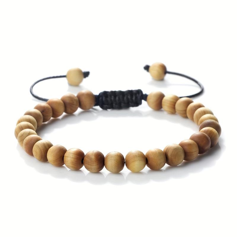 This bracelet features 6, 8, and 10mm wooden beads woven characteristically. It is adjustable for a perfect fit.