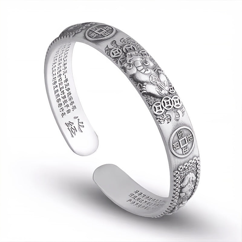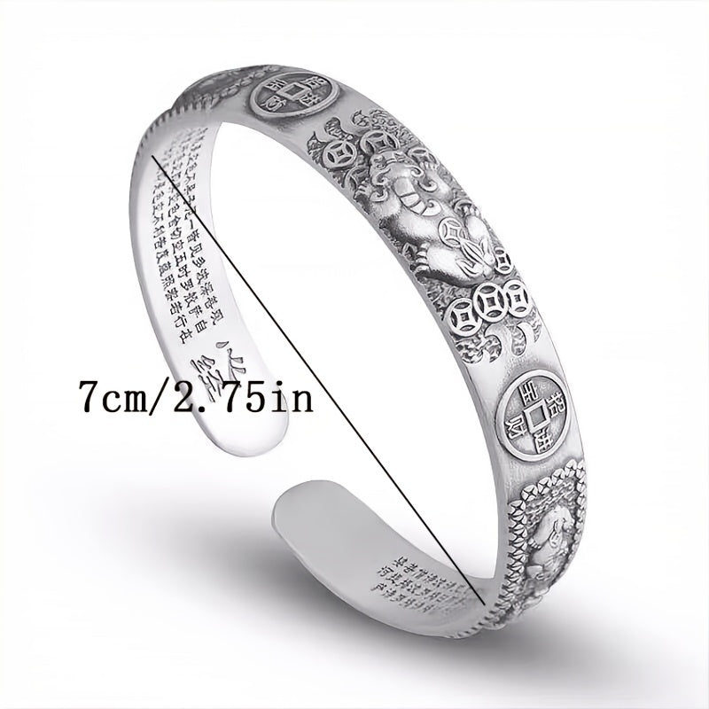 Stand out with this domineering Thai silver bracelet featuring a lucky transfer Pixiu design. The copper money accents add a bold touch.