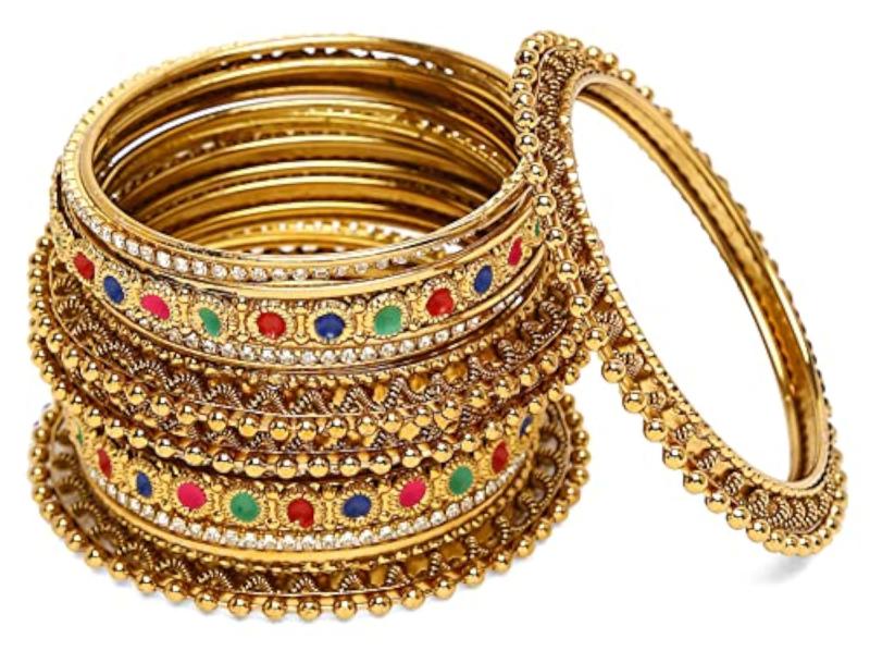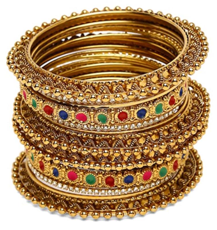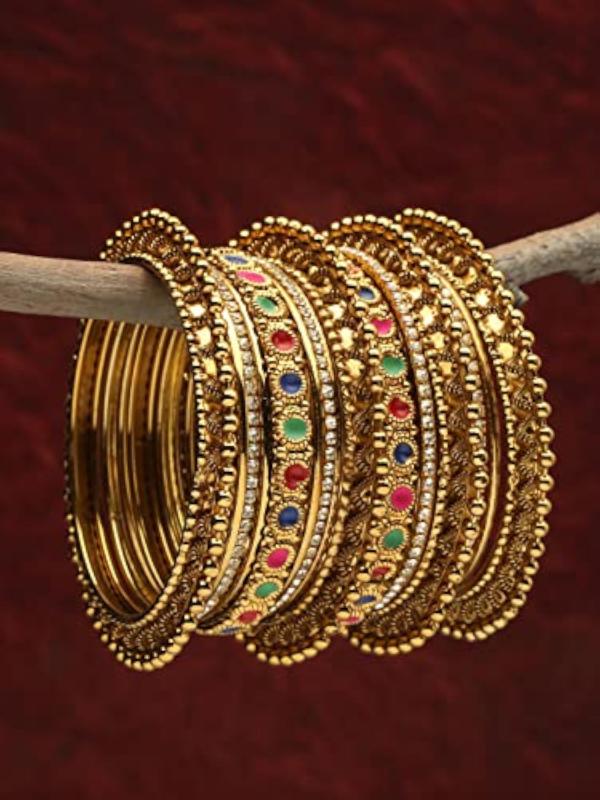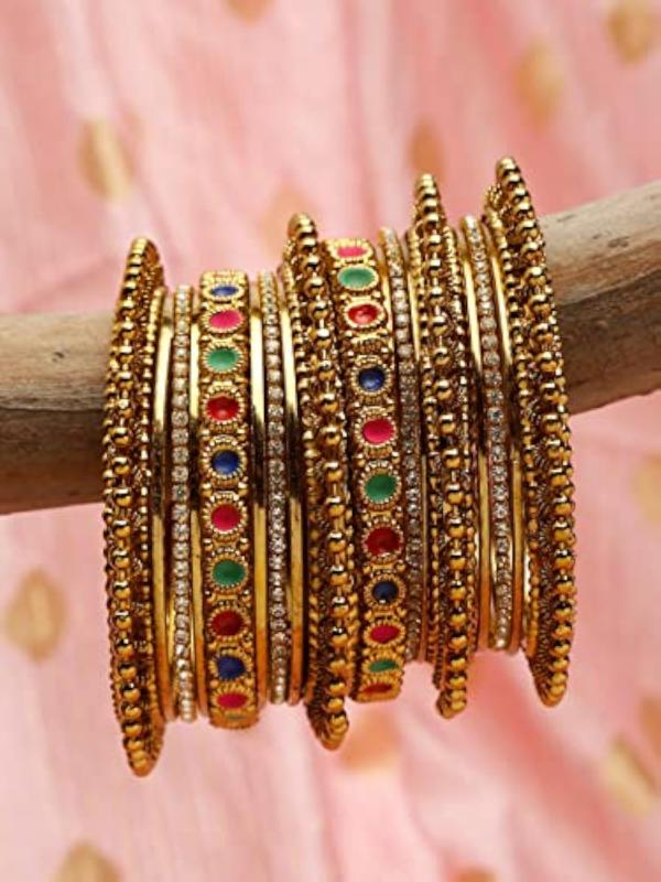 Enhance your traditional look with this set of 18 stylish bangles featuring antique plating. Perfect for festive occasions or everyday wear.