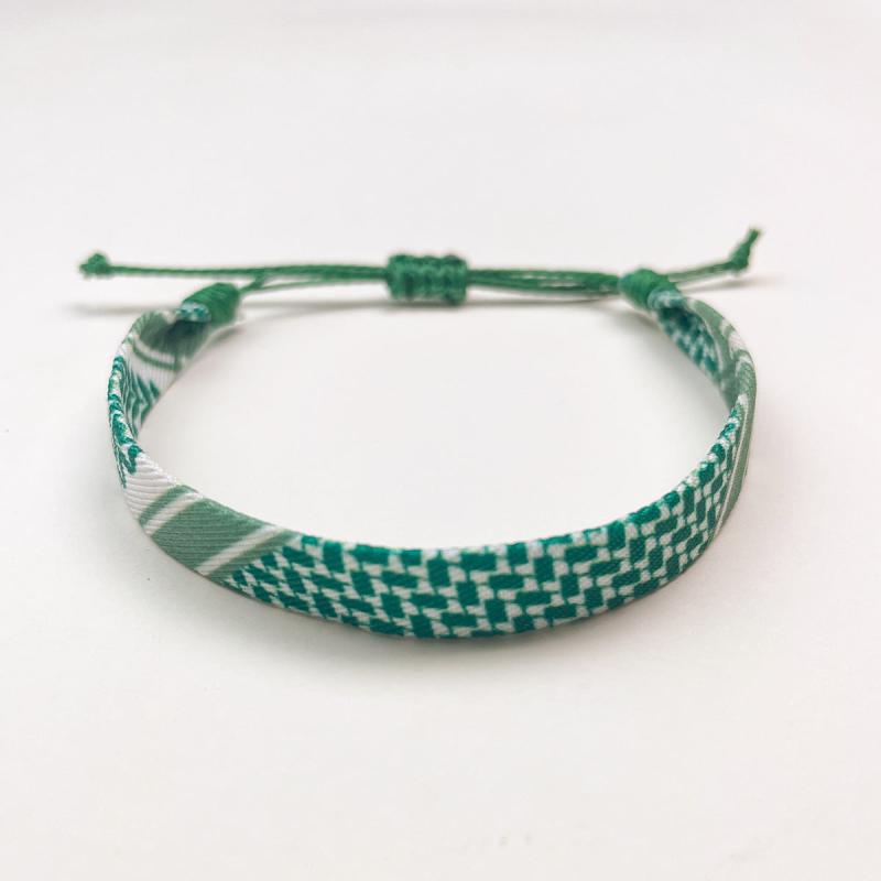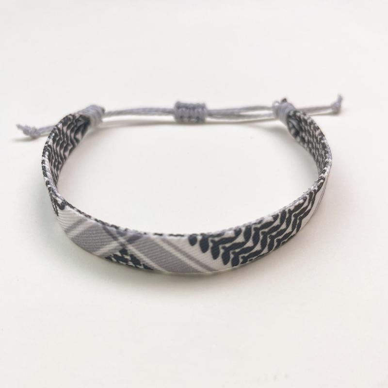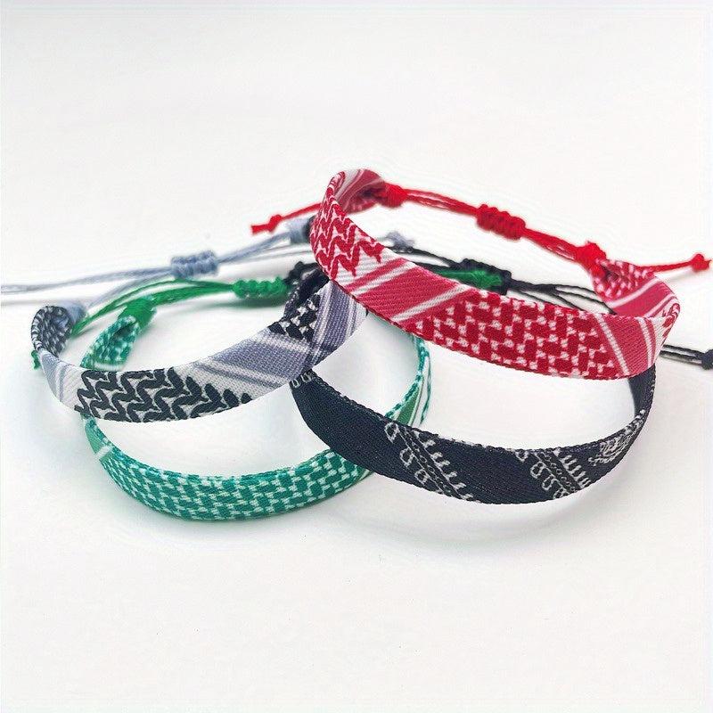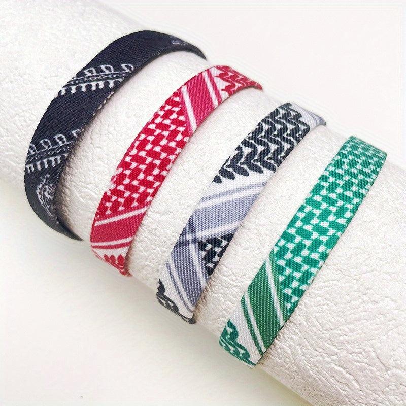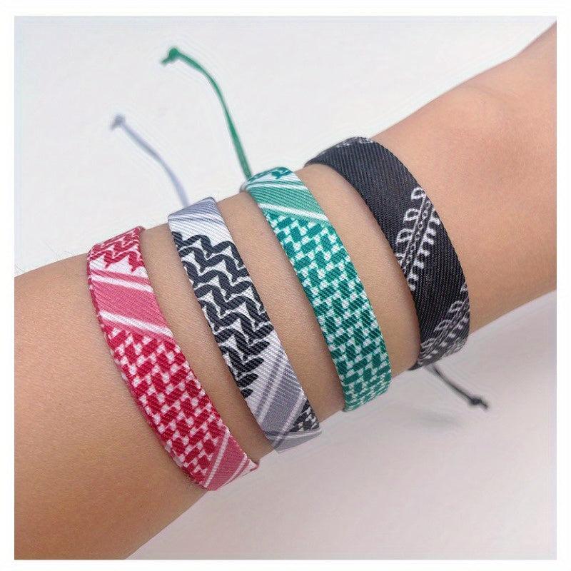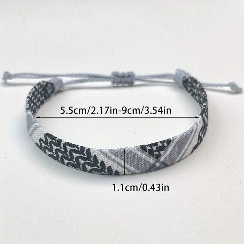 This adjustable ethnic Arab woven bracelet features a unique geometric pattern on a ribbon bangle. It has a vintage style that adds a touch of elegance to any outfit.