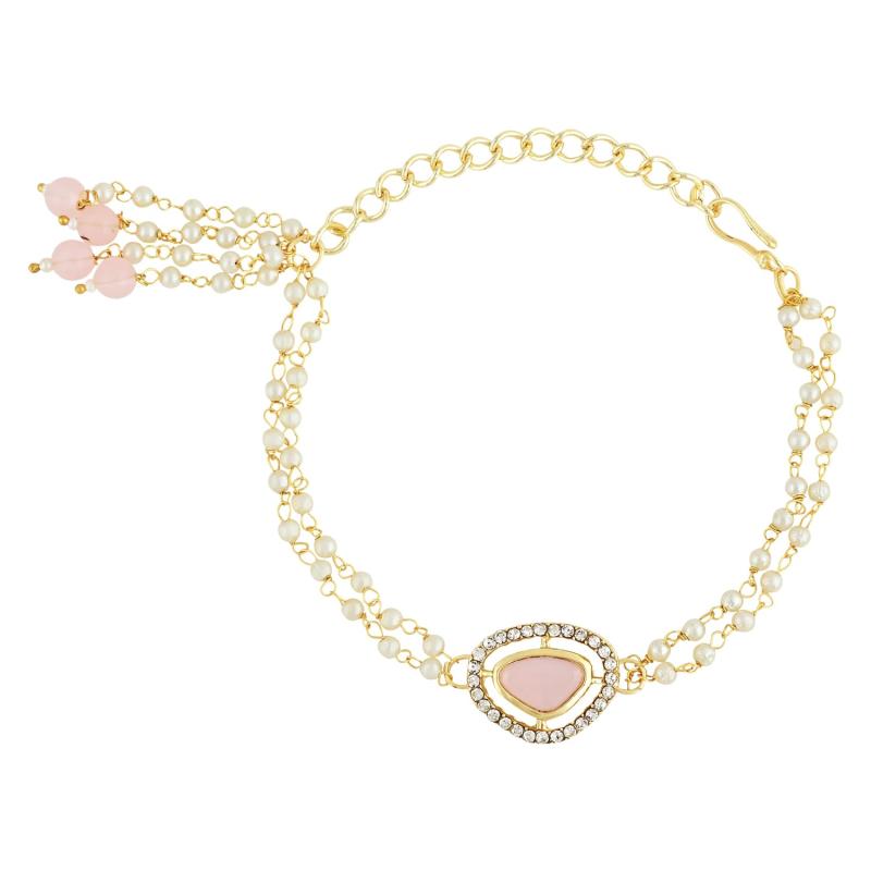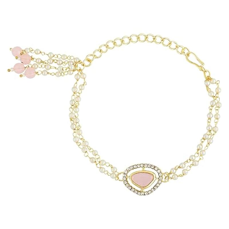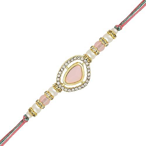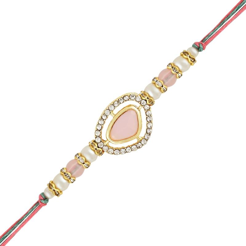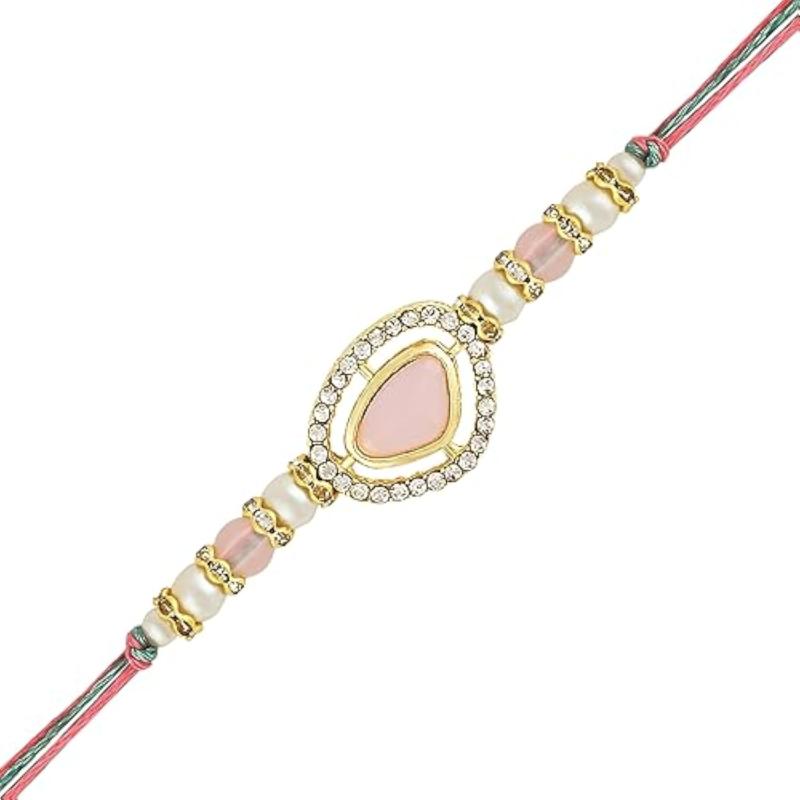 Beautiful Bhaiya Bhabhi Lumba Rakhi Set adorned with Kundan and Pearl embellishments. Perfect as a gift for Raksha Bandhan