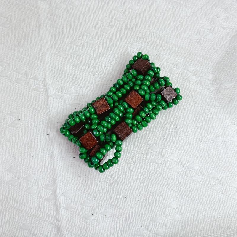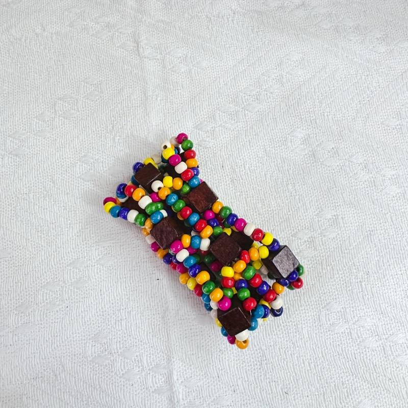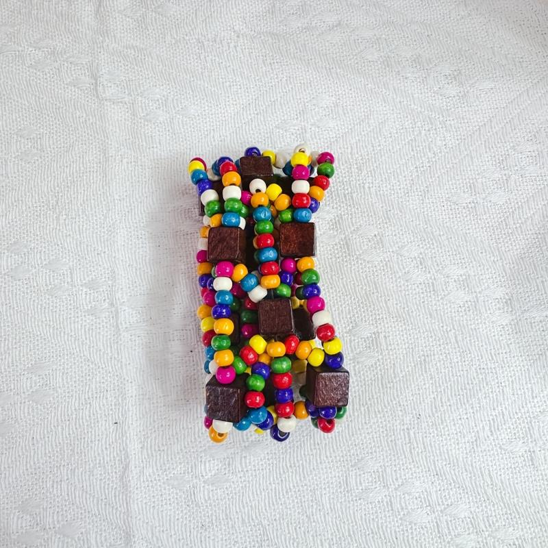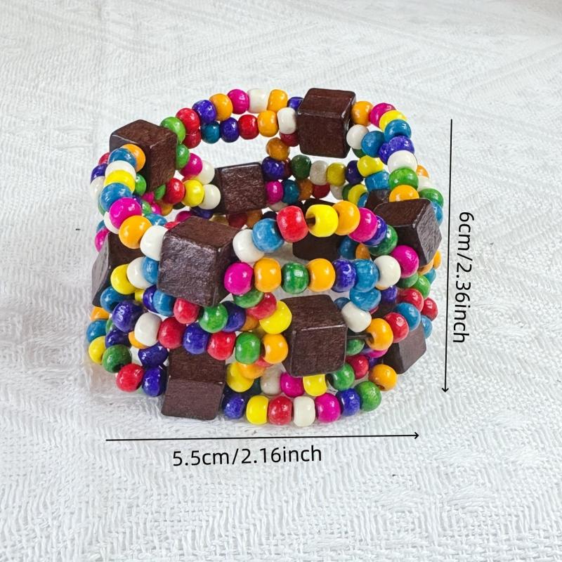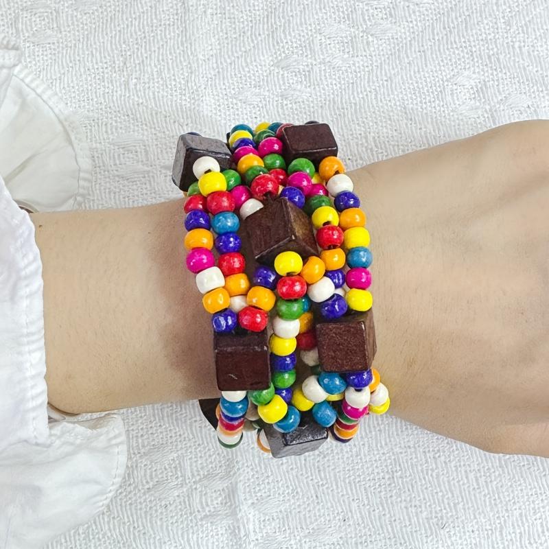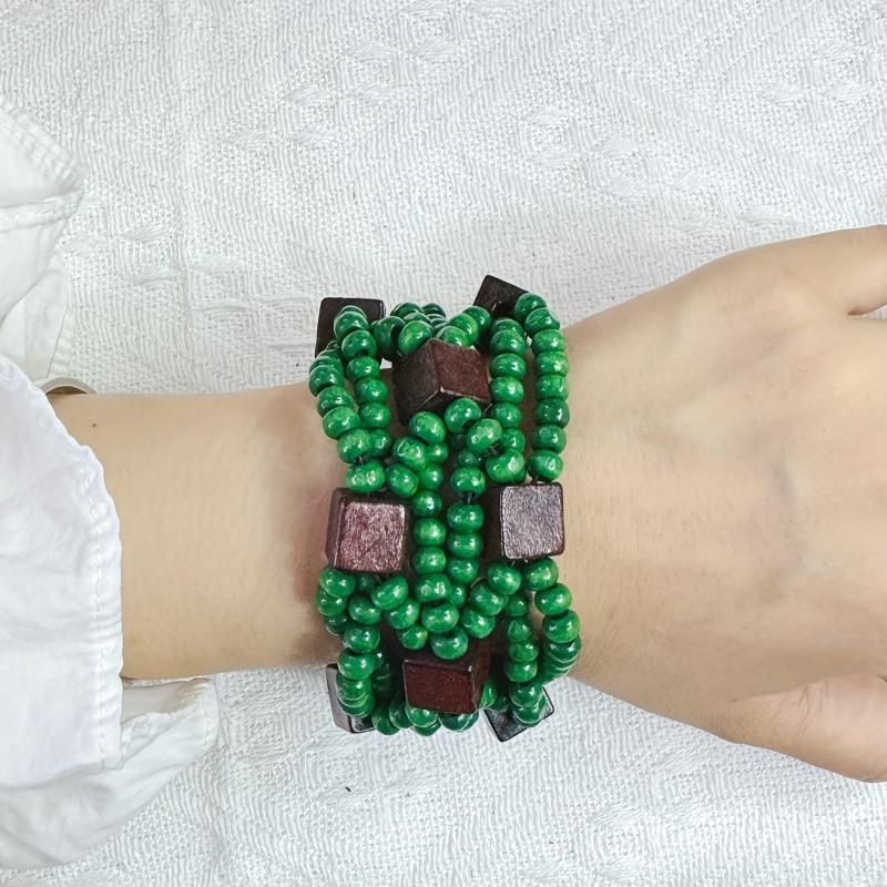 Elevate your summer vacation look with this boho-inspired layered bracelet featuring recycled wood and glass beads. A perfect accessory for beach days and music festivals.
