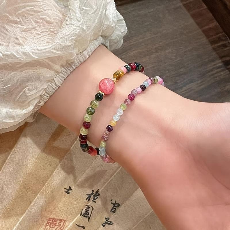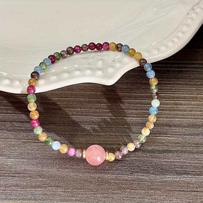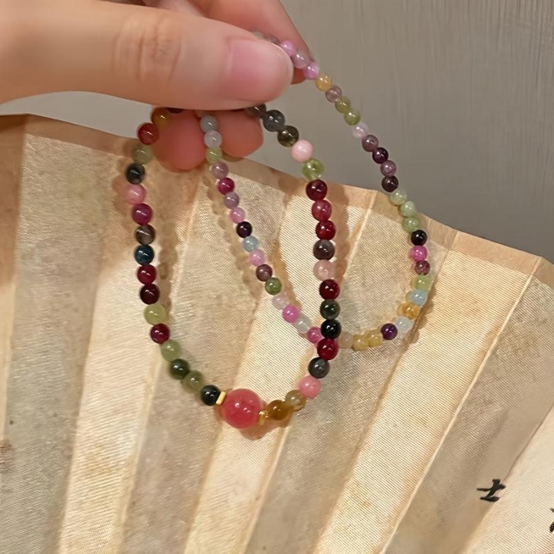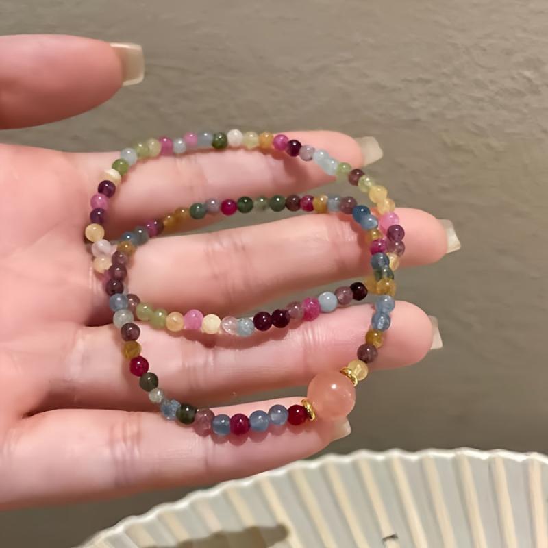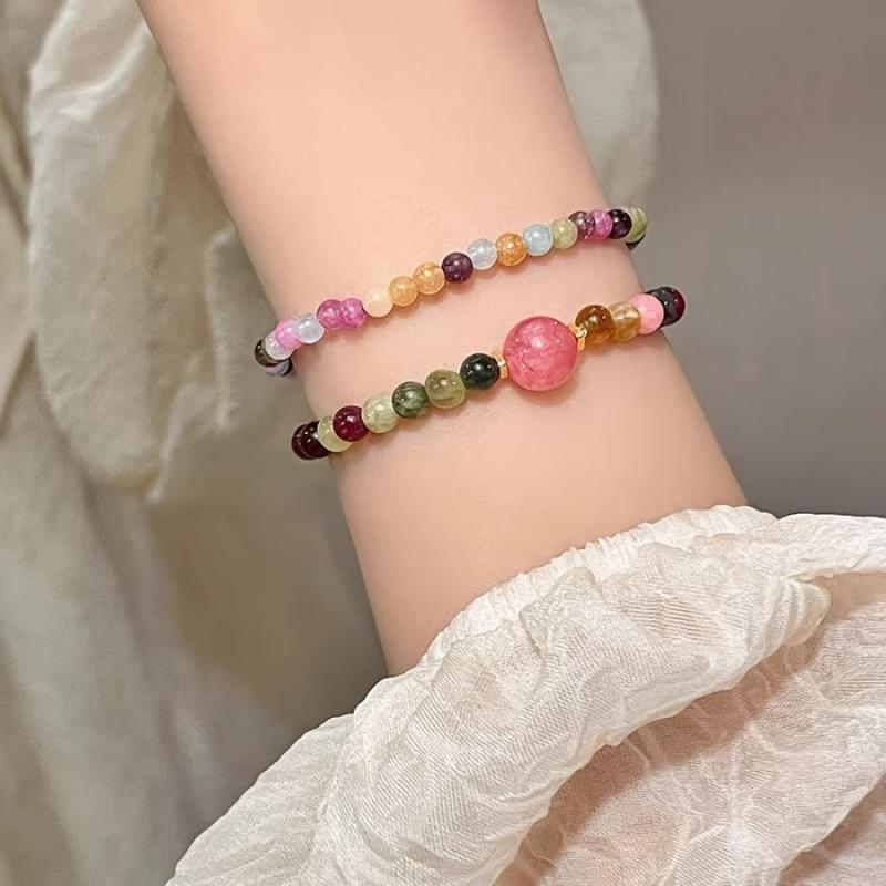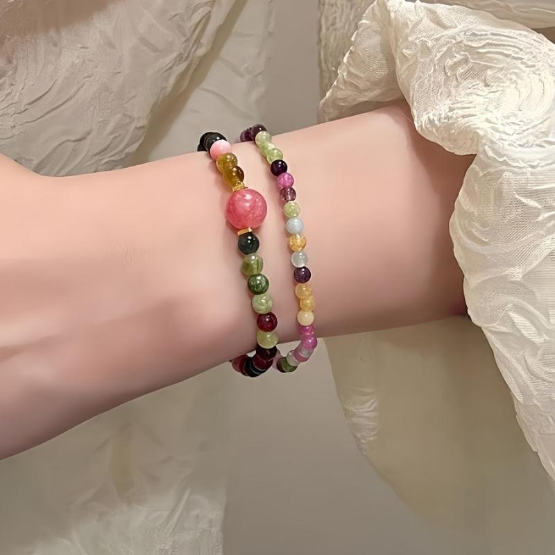 Add a pop of color with these vibrant beaded bracelets featuring pink crystals and colorful gemstones. Perfect for casual outfits or as a thoughtful gift.