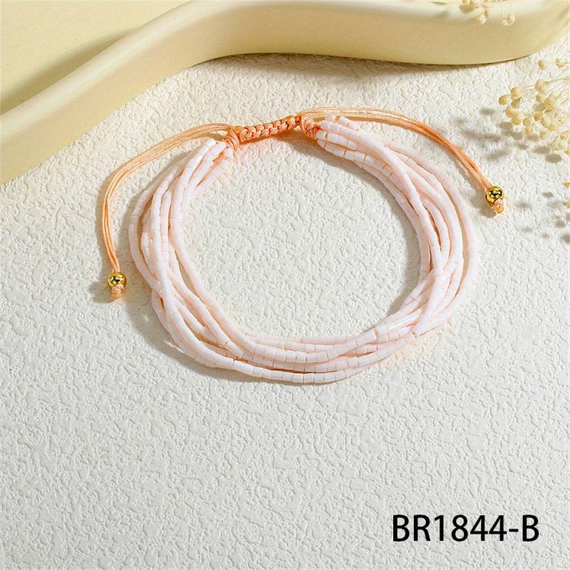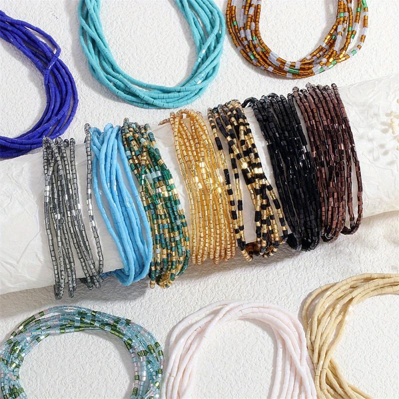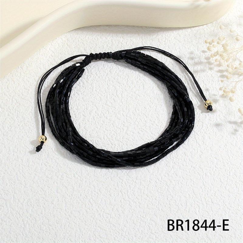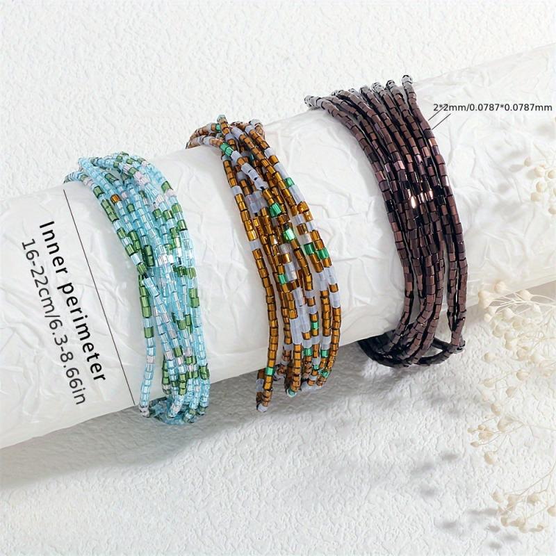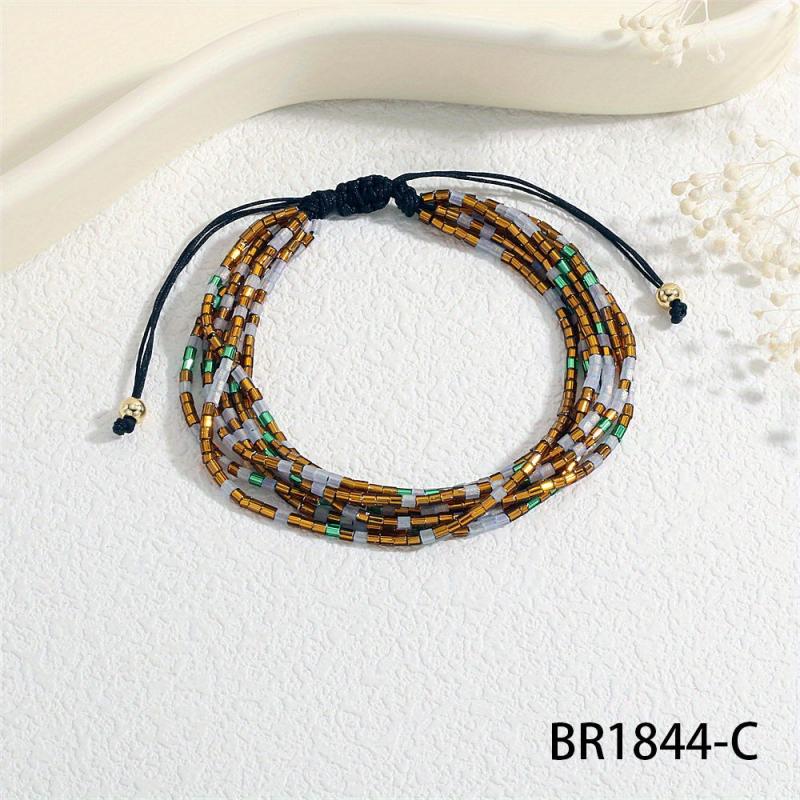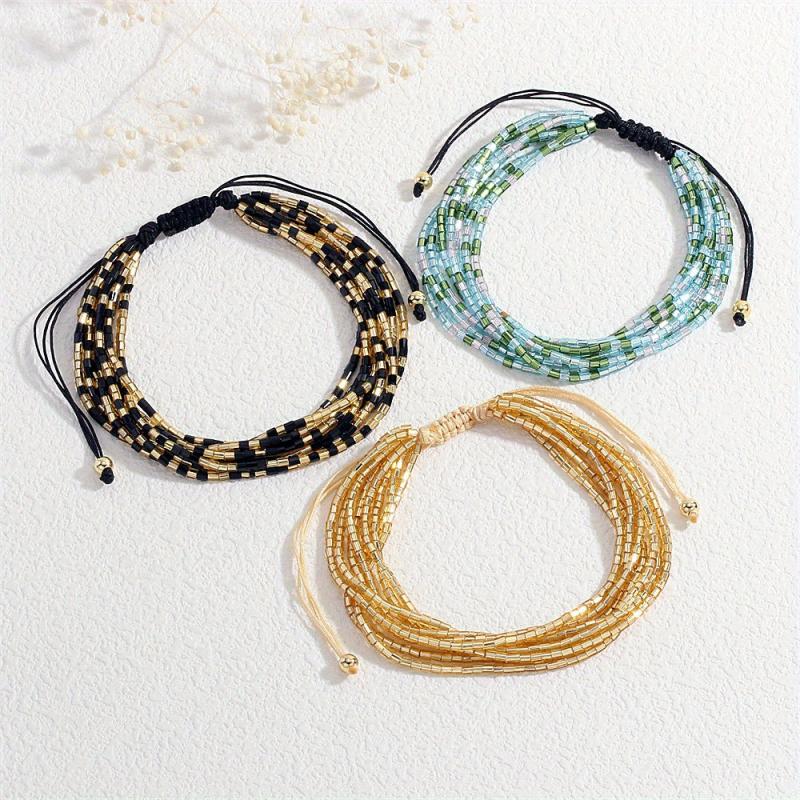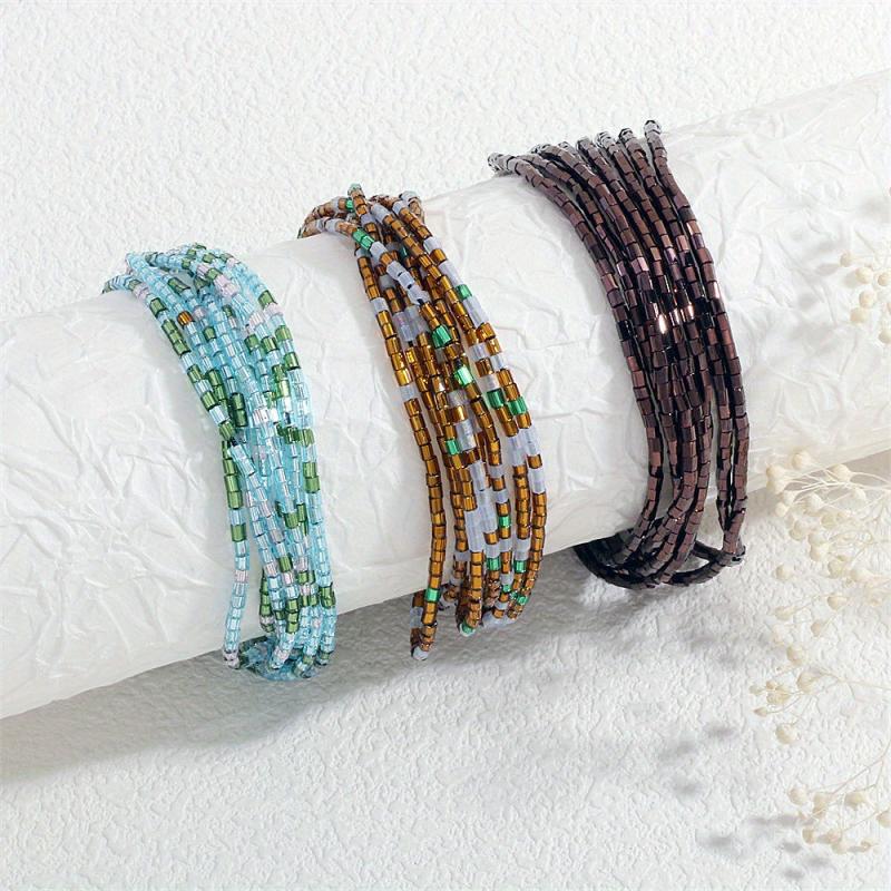 This bracelet features a contrasting layered design with stacking glass beads for a fashionable bohemian look.