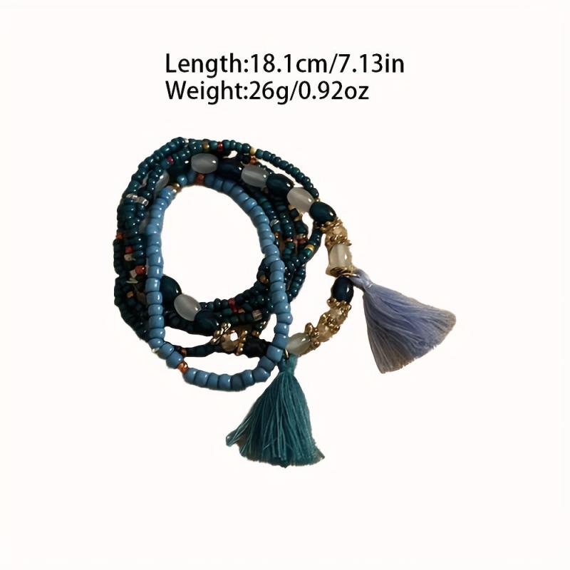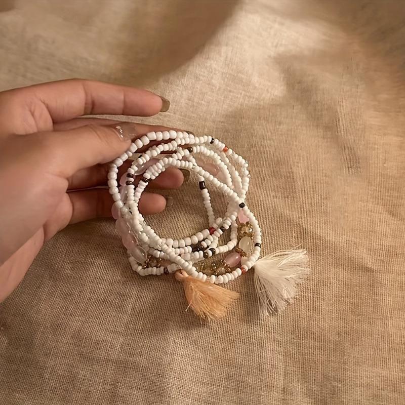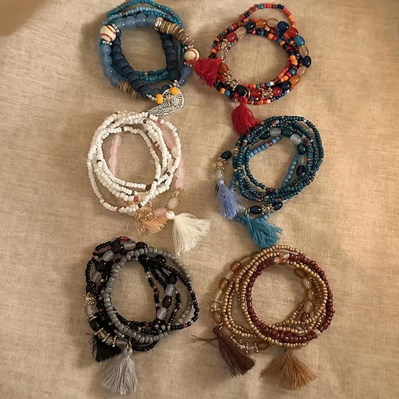 Enhance your ethnic style with this set of six Bohemian layered seed bead bracelets that bring a light, niche, and vintage touch to your hand accessories collection.