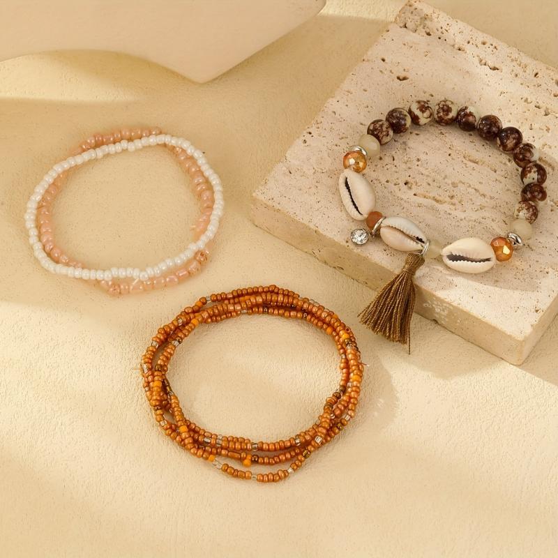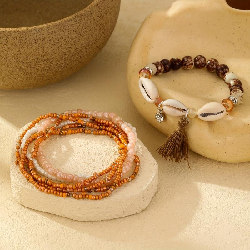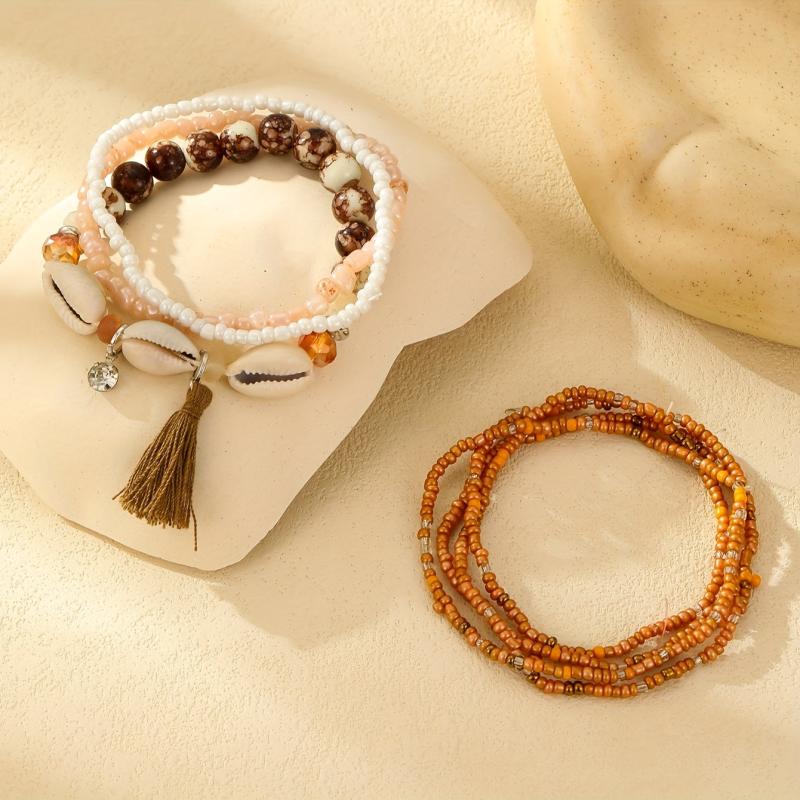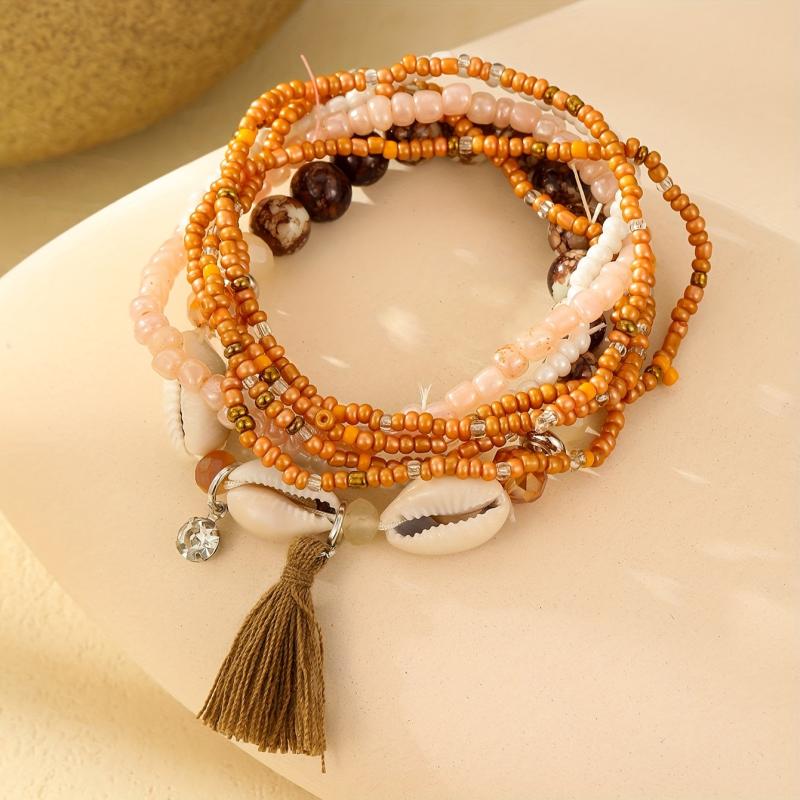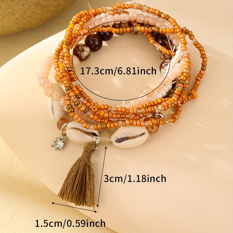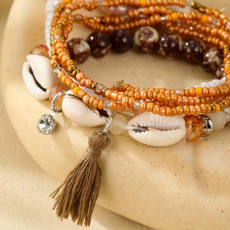 Adorn your wrist with this 7pcs bracelet set inspired by the ocean. Featuring glass beads, crystals, seashell, tassel, and dangle charms, perfect for daily wear or special occasions.