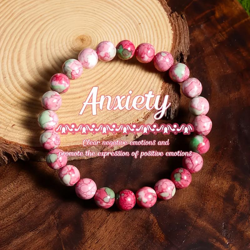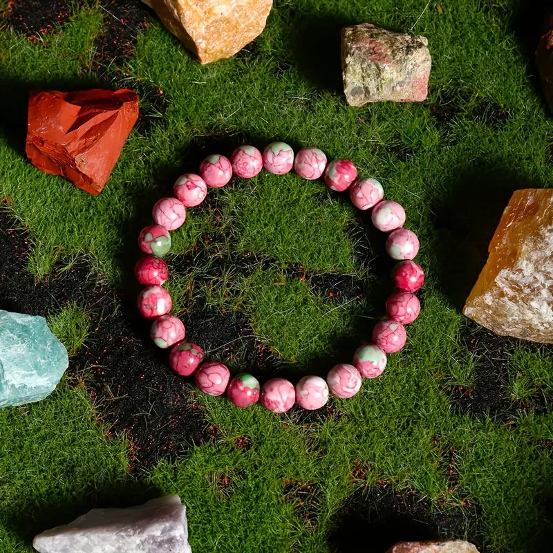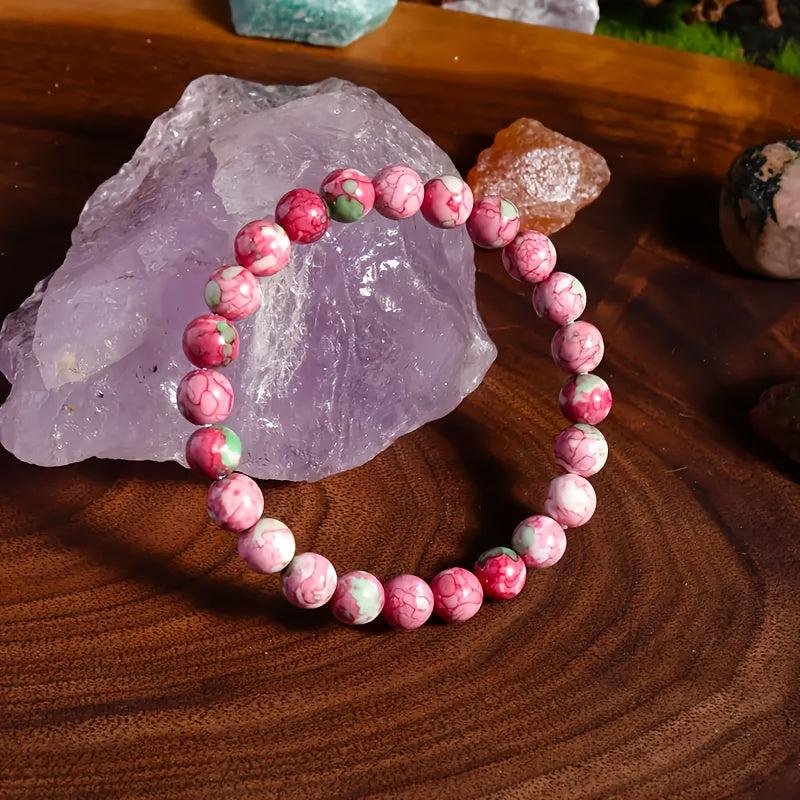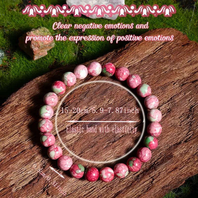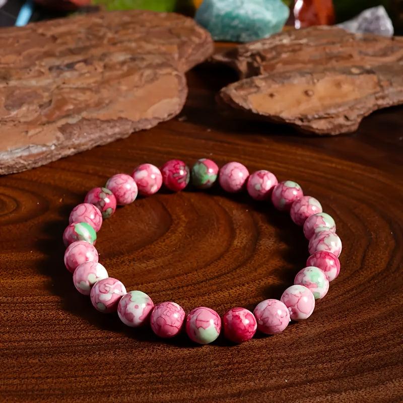 Elevate your style with this bohemian pink & green agate beaded bracelet. The 8mm beads are strung on elastic cord for easy wear. This jewelry piece supports anxiety and features vintage charm, making it ideal for daily wear or gifting.