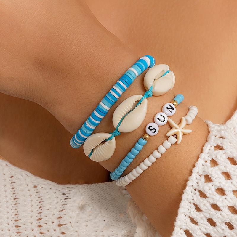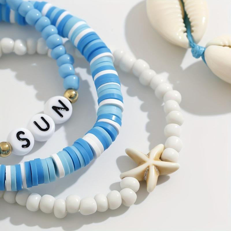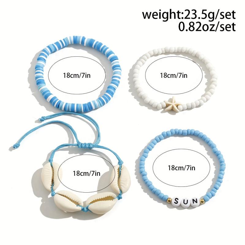 This set includes 4 bohemian style stretch bracelets with shell beads, perfect for summer vacation, beach parties, and holidays. Random matching of rice beads adds a unique touch.