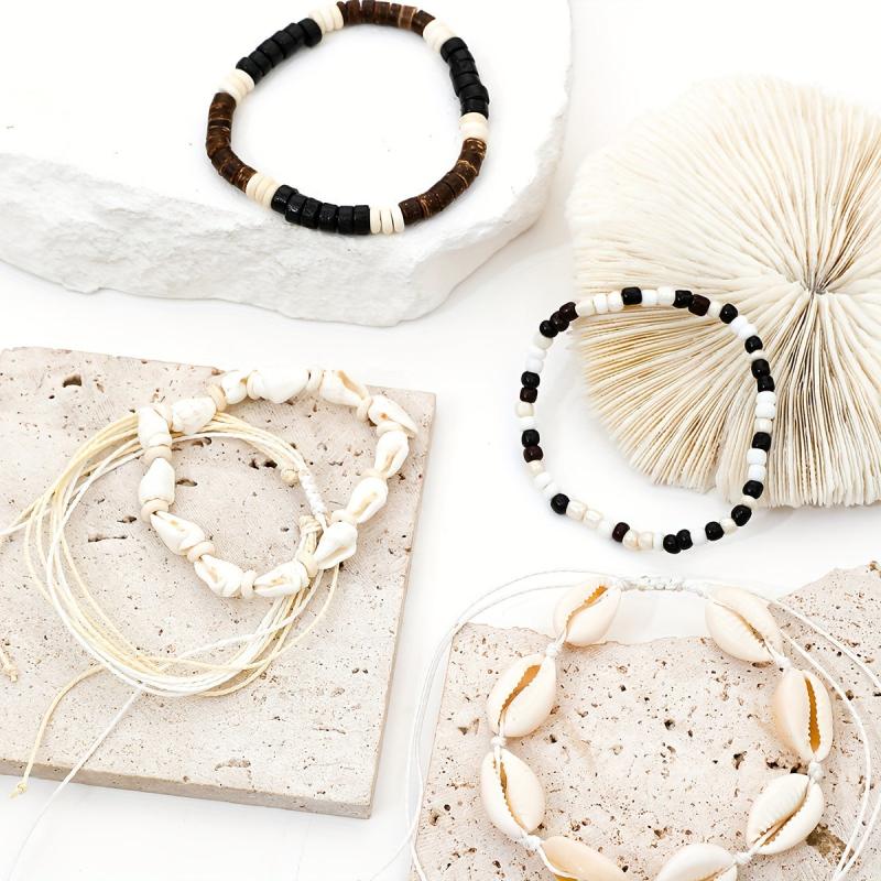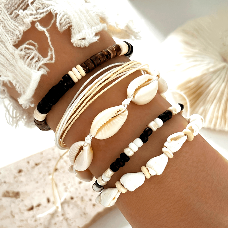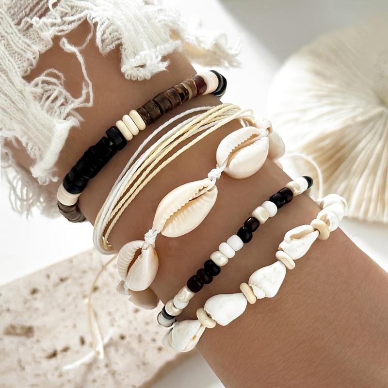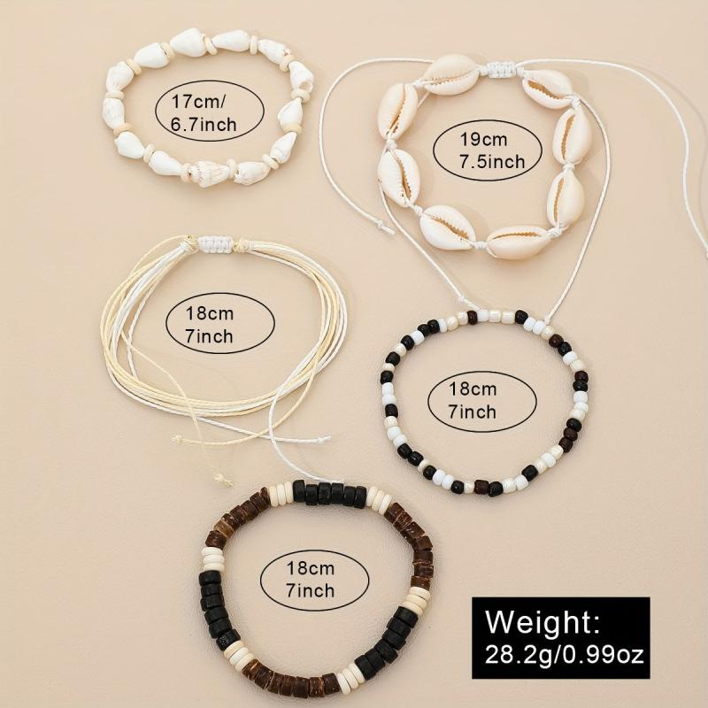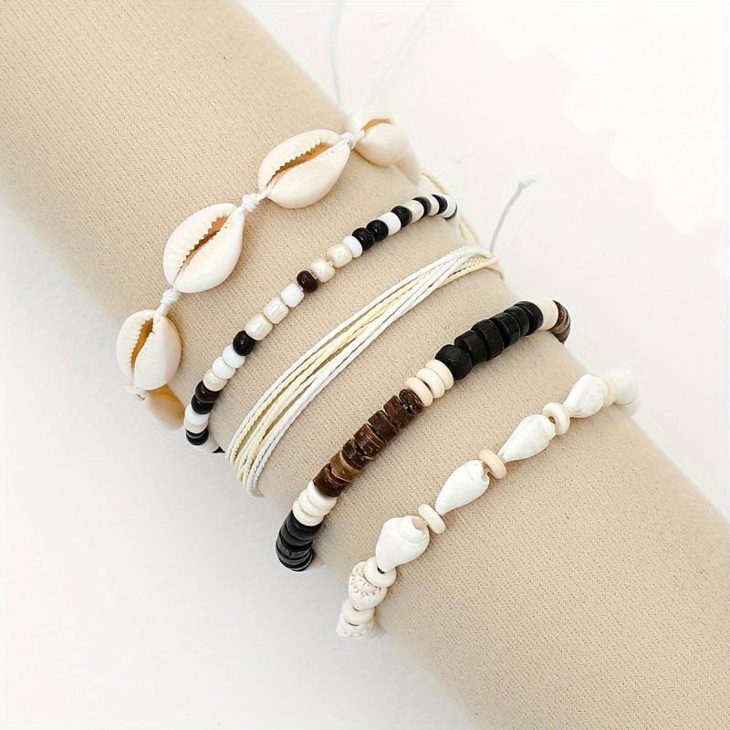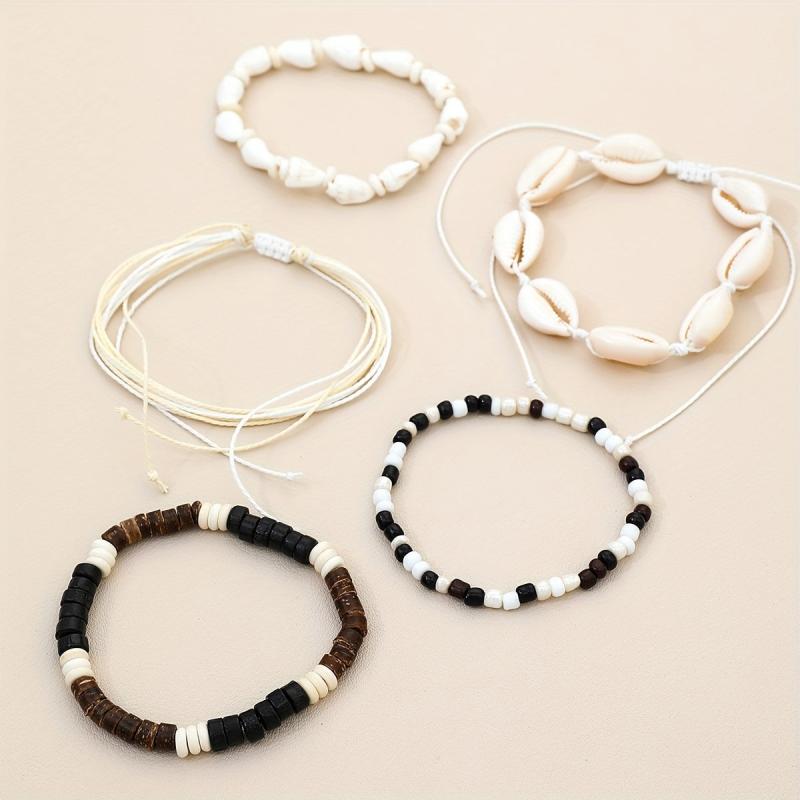 This 5-piece bracelet set features a combination of shell braided, wooden beaded, and glass rice bead bracelets in a bohemian style. Perfect for casual wear.