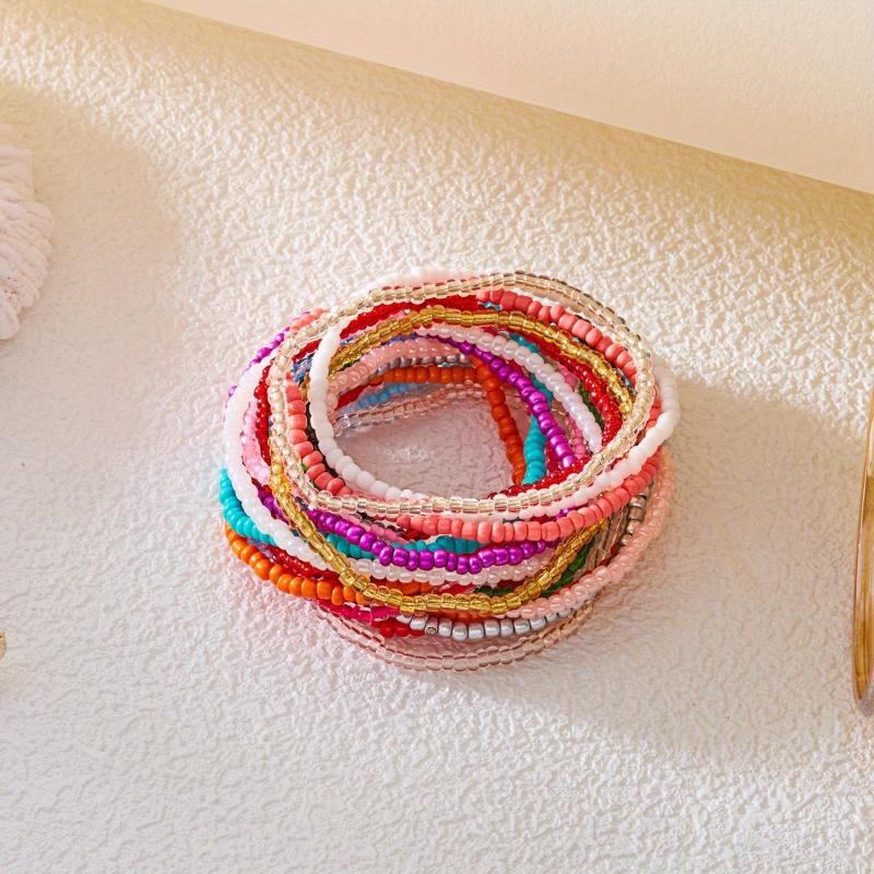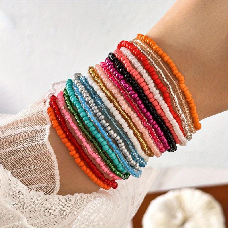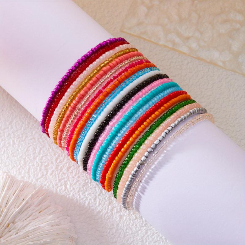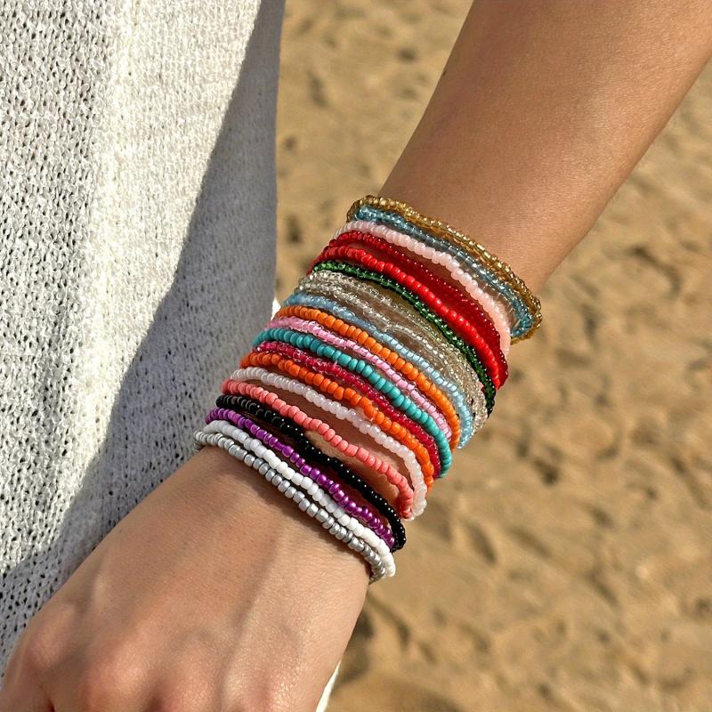 Enhance your look with this set of 20 bohemian style beaded strand bracelets in high contrast and colorful mixed seed bead design. Perfect for everyday wear or special occasions.