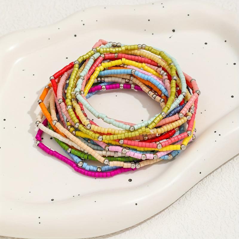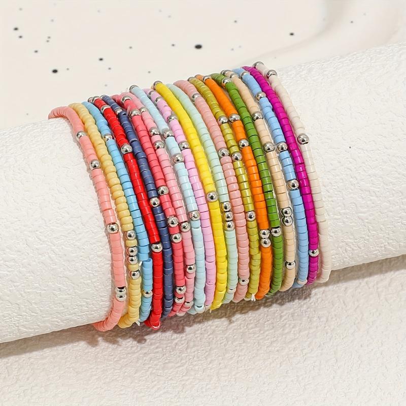 Embrace the vacation beach vibes with this set of 19 colorful glass bead bracelets. Perfect for adding a pop of color to your wrist and showcasing a bohemian style.