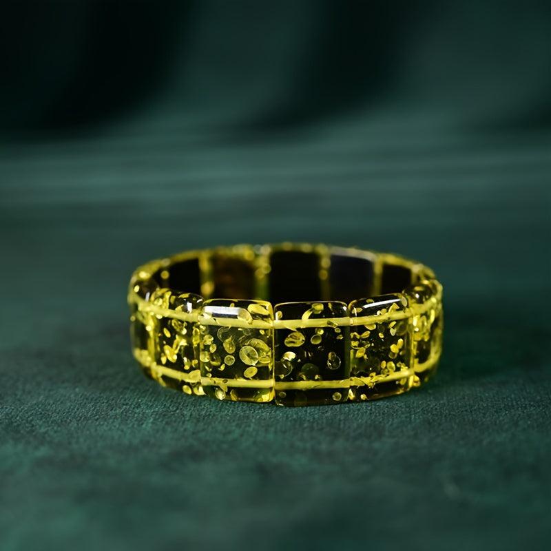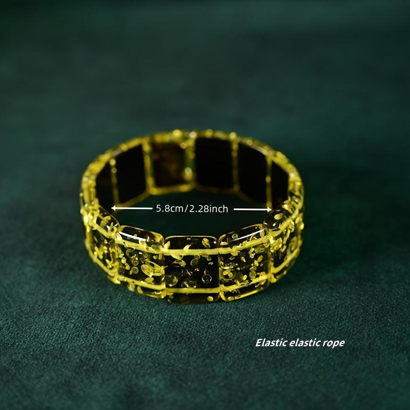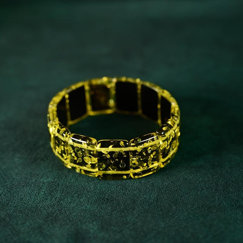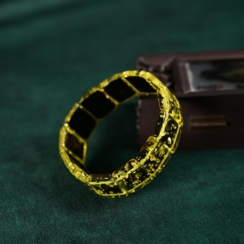 Add a pop of color to your attire with this fluorescent green and amber resin cuff bracelet. Perfect for casual or formal outfits, this lightweight and durable accessory is a must-have for any fashion-forward woman.