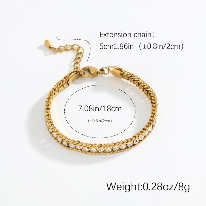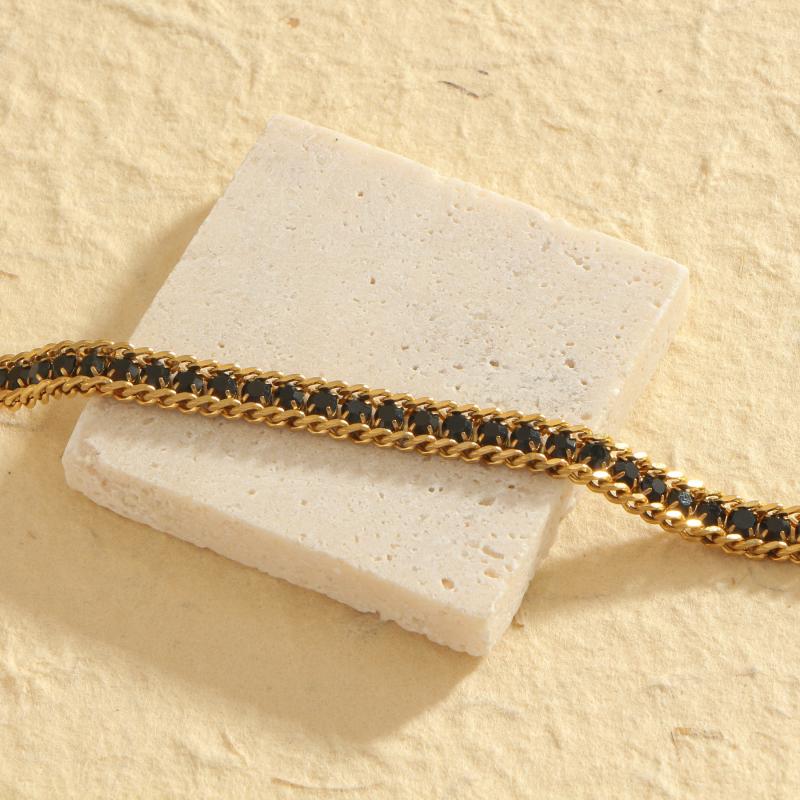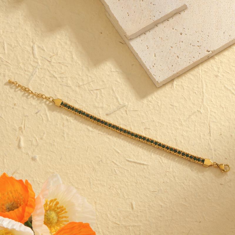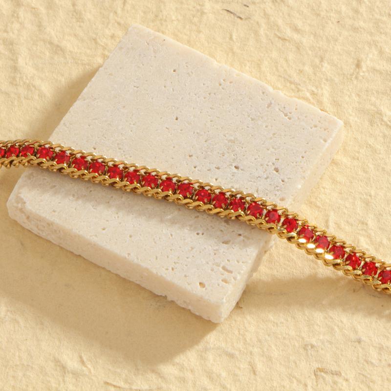 Add a pop of color to your outfit with this versatile chain bracelet. The colorful rhinestone inlay adds a touch of bohemian style. The 18K plating ensures durability and prevents allergic reactions.