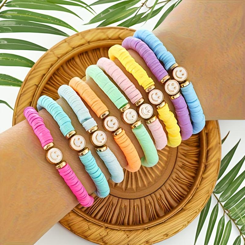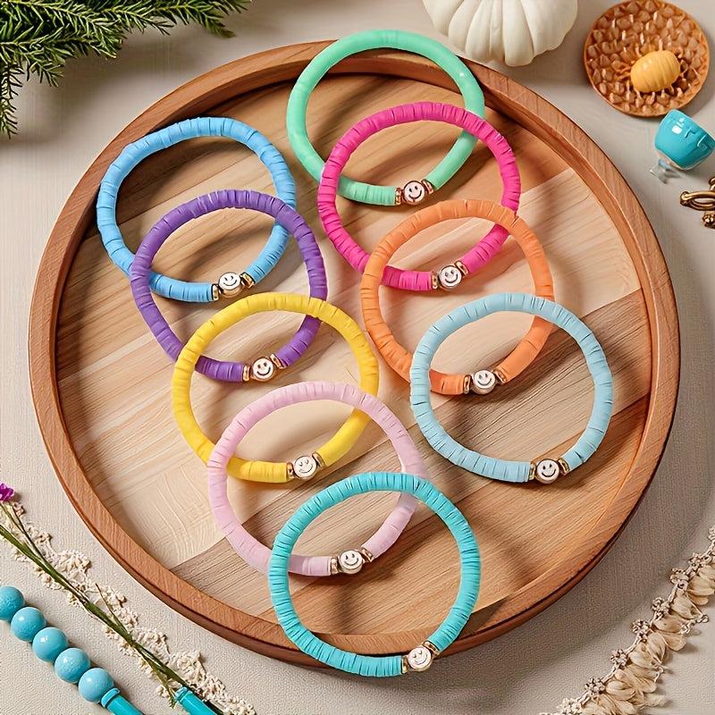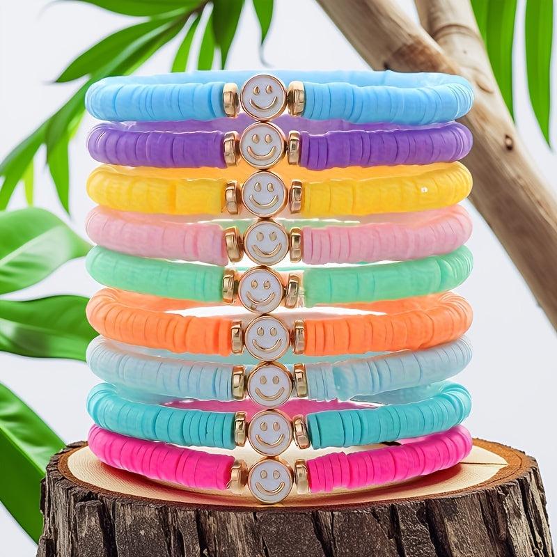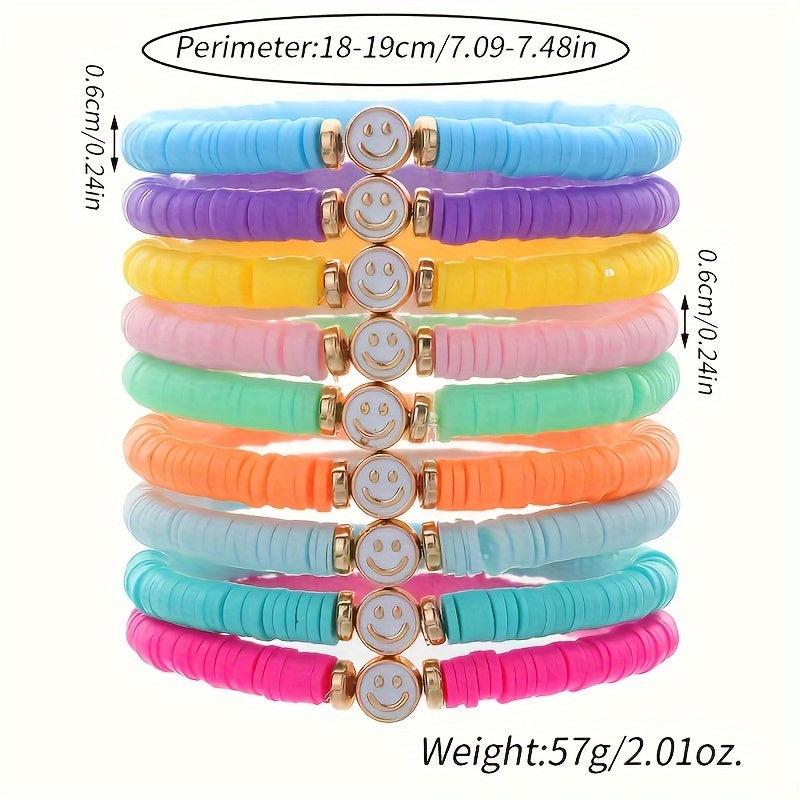 Elevate your style with this set of 9 multicolored polymer clay charm bracelets featuring happy face details. Perfect for daily wear or parties.