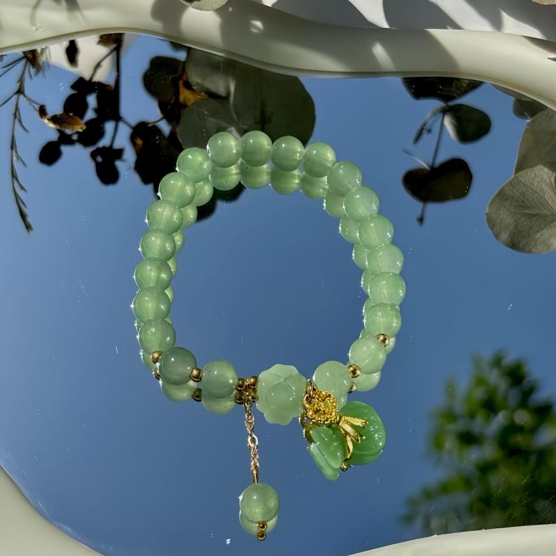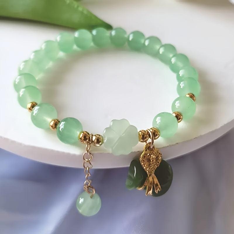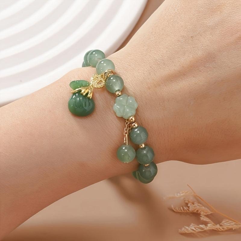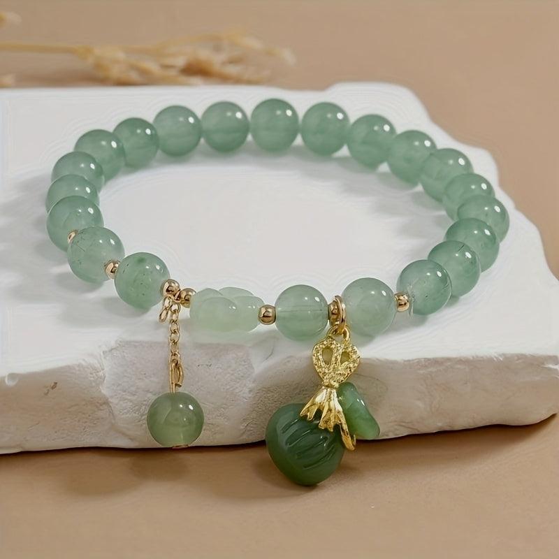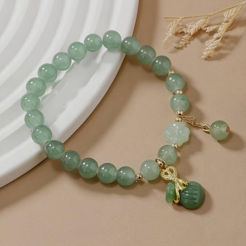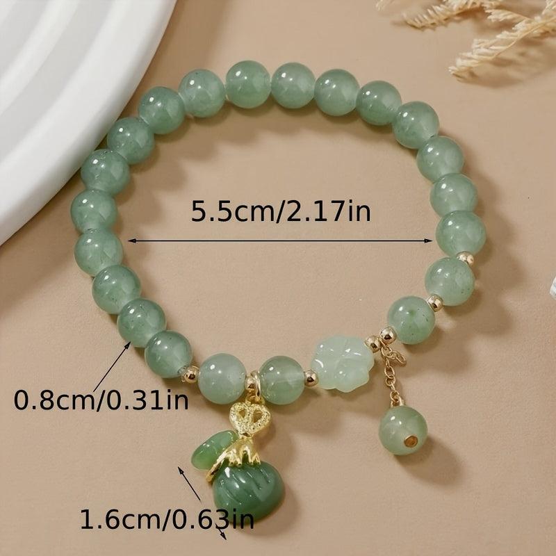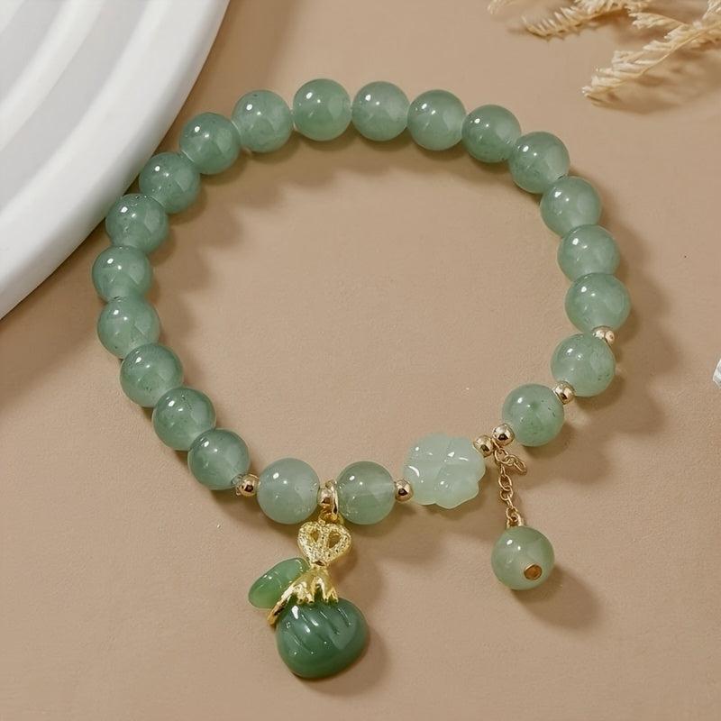 This boho style bracelet features green glass beads and a lucky money bag pendant. It has a secure clasp and is perfect for daily wear and gifting all season long. Versatile and stylish!