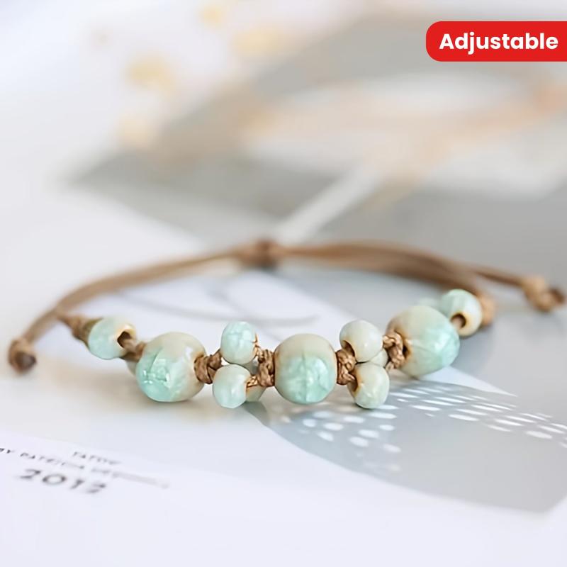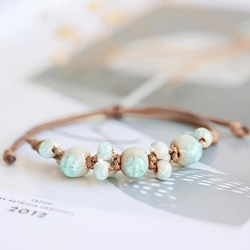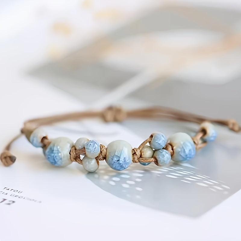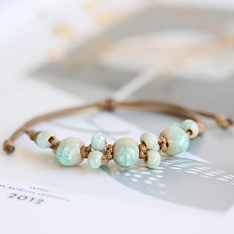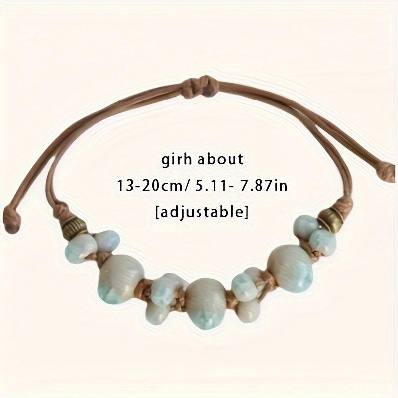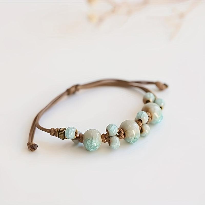 Adjustable hand rope bracelet with a vintage Boho style featuring ceramic beads. Perfect for couples, friends, or casual attire. Makes a great gift with an ethnic touch.