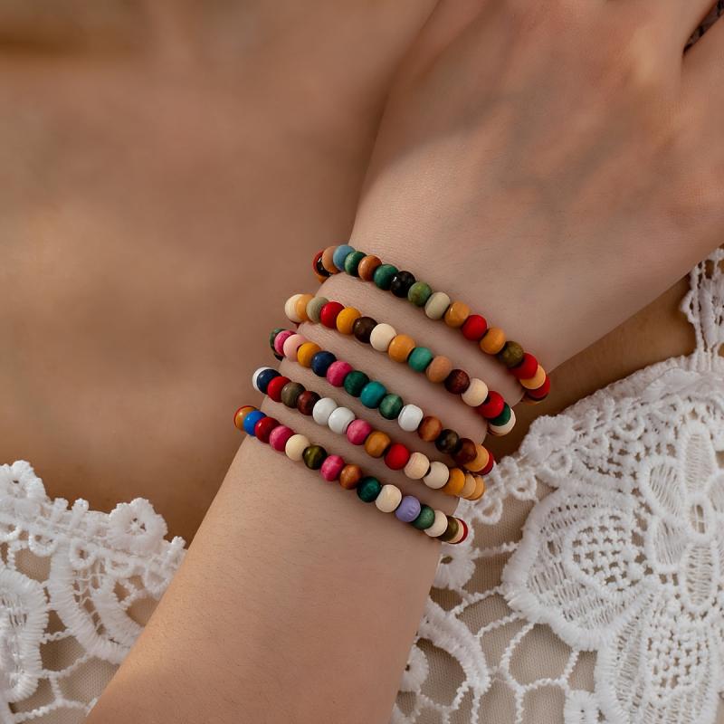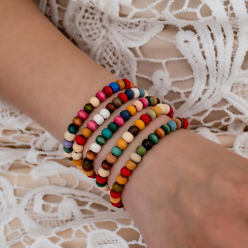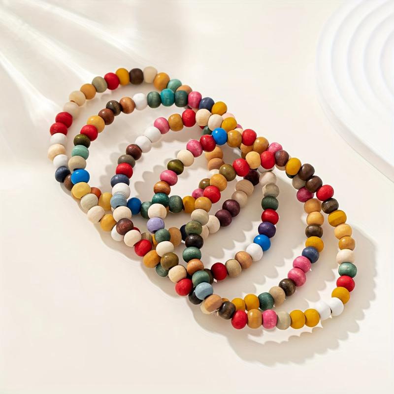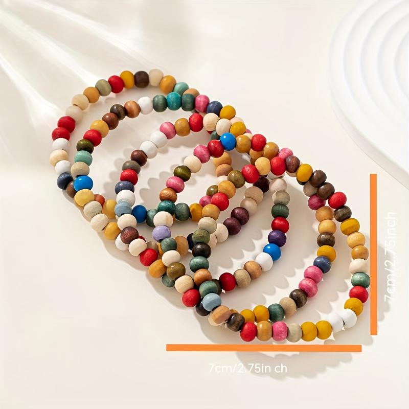 Add a touch of bohemian flair to your look with this 5-pack set of stretch wood bead bracelets. These bracelets feature vibrant colors and are perfect for daily wear or holiday celebrations. Each bracelet is made with uncoated wooden beads, giving them a natural and earthy feel.